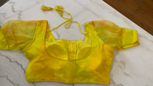 Organza Puff Sleeve Saree Blouse – Padded Back Hook Design (Available in Yellow, Blue, Pink & More)