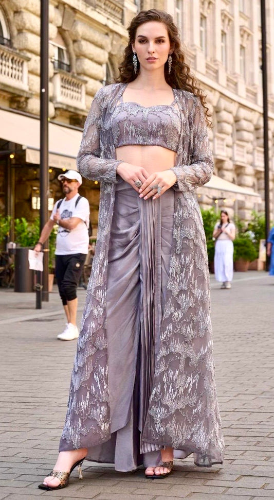 Blue Georgette Gown with Stone & Zari Work Jacket – Festive & Party Wear