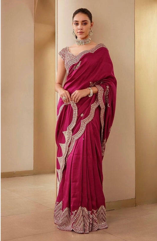 Cherry Red Vichitra Saree with Sequin & Cutwork Embroidery ✨