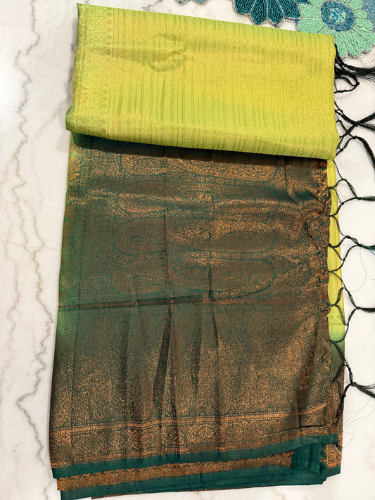 Vibrant Grace Kanjivaram Saree – Orange, Green & Sky Blue