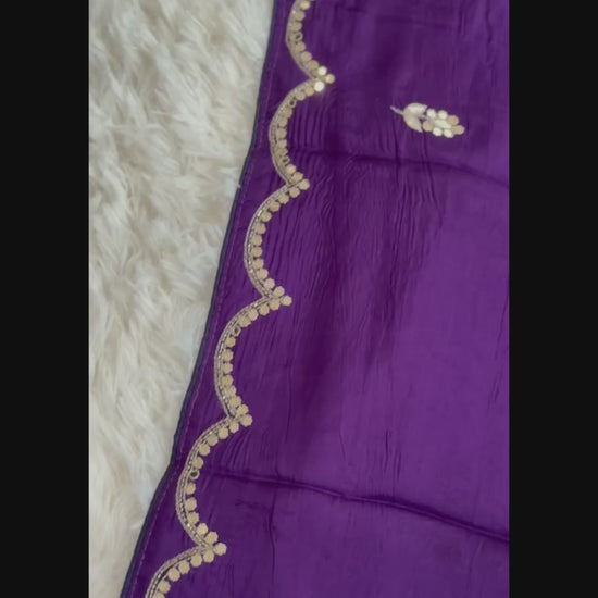 This exquisite purple H.O. silk saree is a perfect blend of grace and craftsmanship. Adorned with delicate aari tari handwork and tiny floral motifs all over, this saree captures timeless beauty. The lightweight fabric drapes effortlessly, making it ideal for festive events and special occasions.