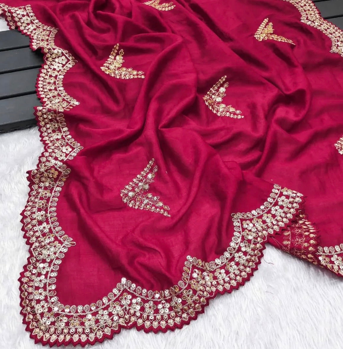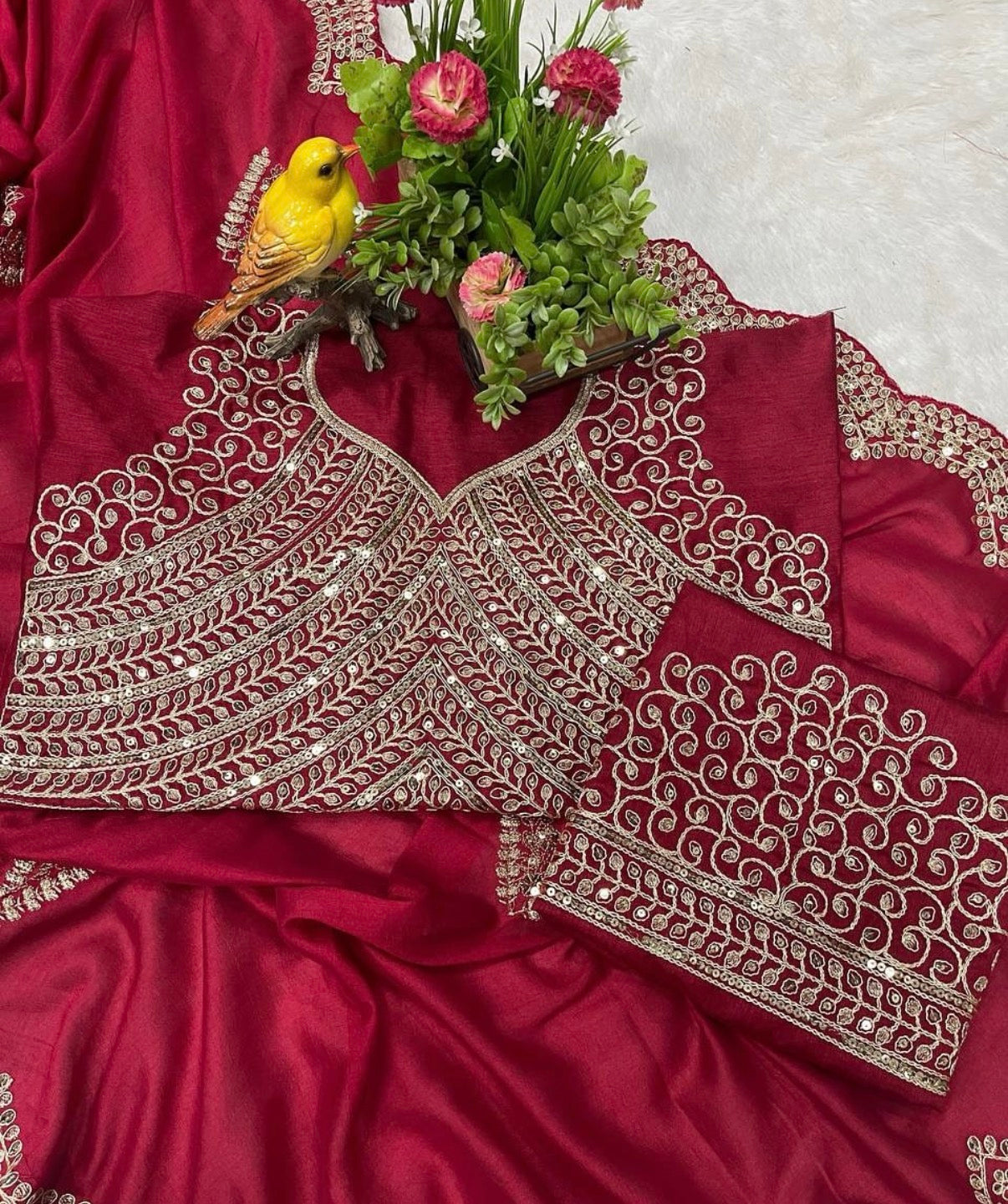 Cherry Red Vichitra Saree with Sequin & Cutwork Embroidery ✨