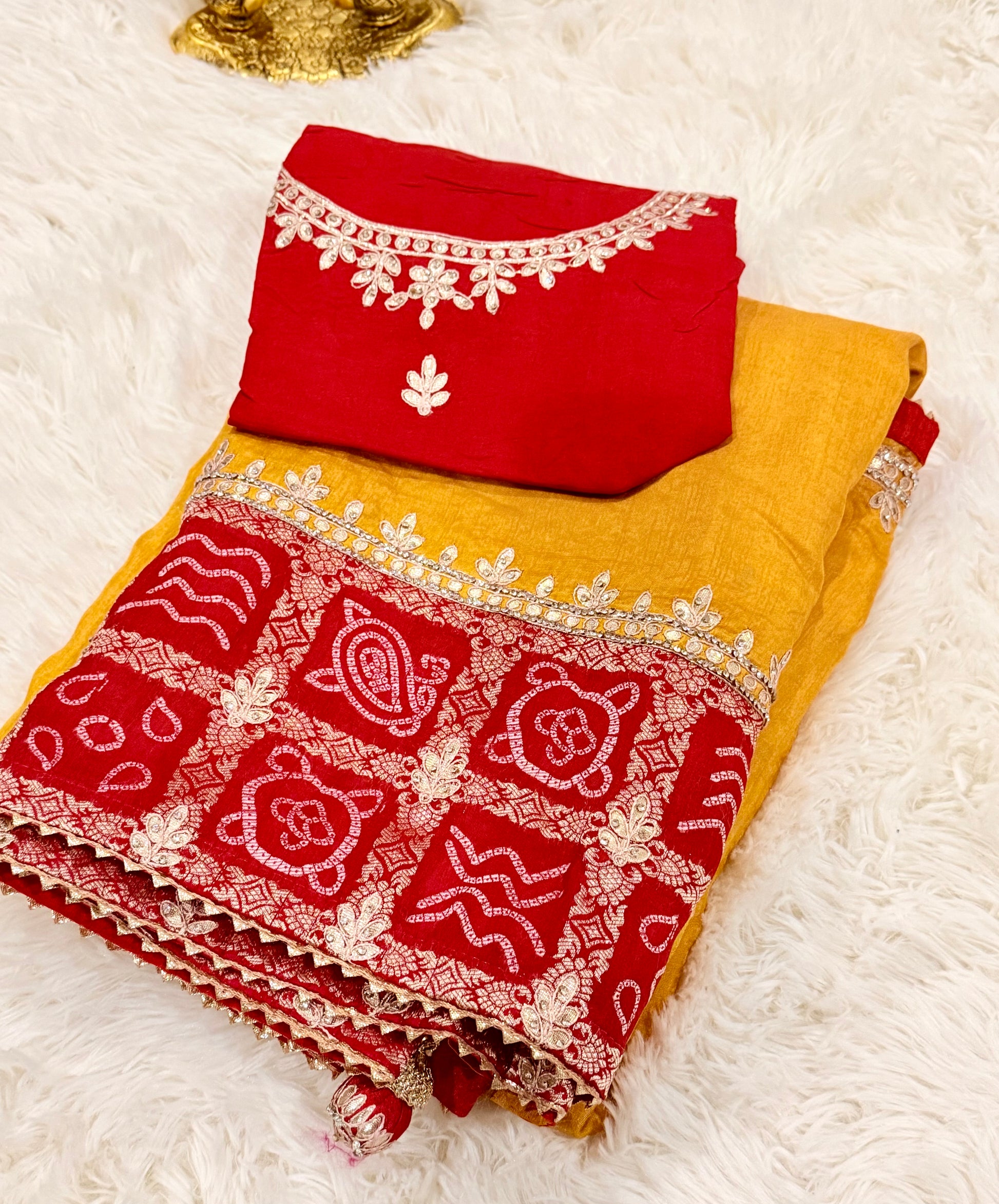 Elevate your festive look with this exquisite Banarasi Upada Gajji Silk Saree, featuring a rich mustard yellow base and red Ghatchola Bandhani design. Crafted with authentic Banarasi Khaddi Georgette weave and delicate Gotta Patti handwork, this saree beautifully blends royal charm with traditional craftsmanship.