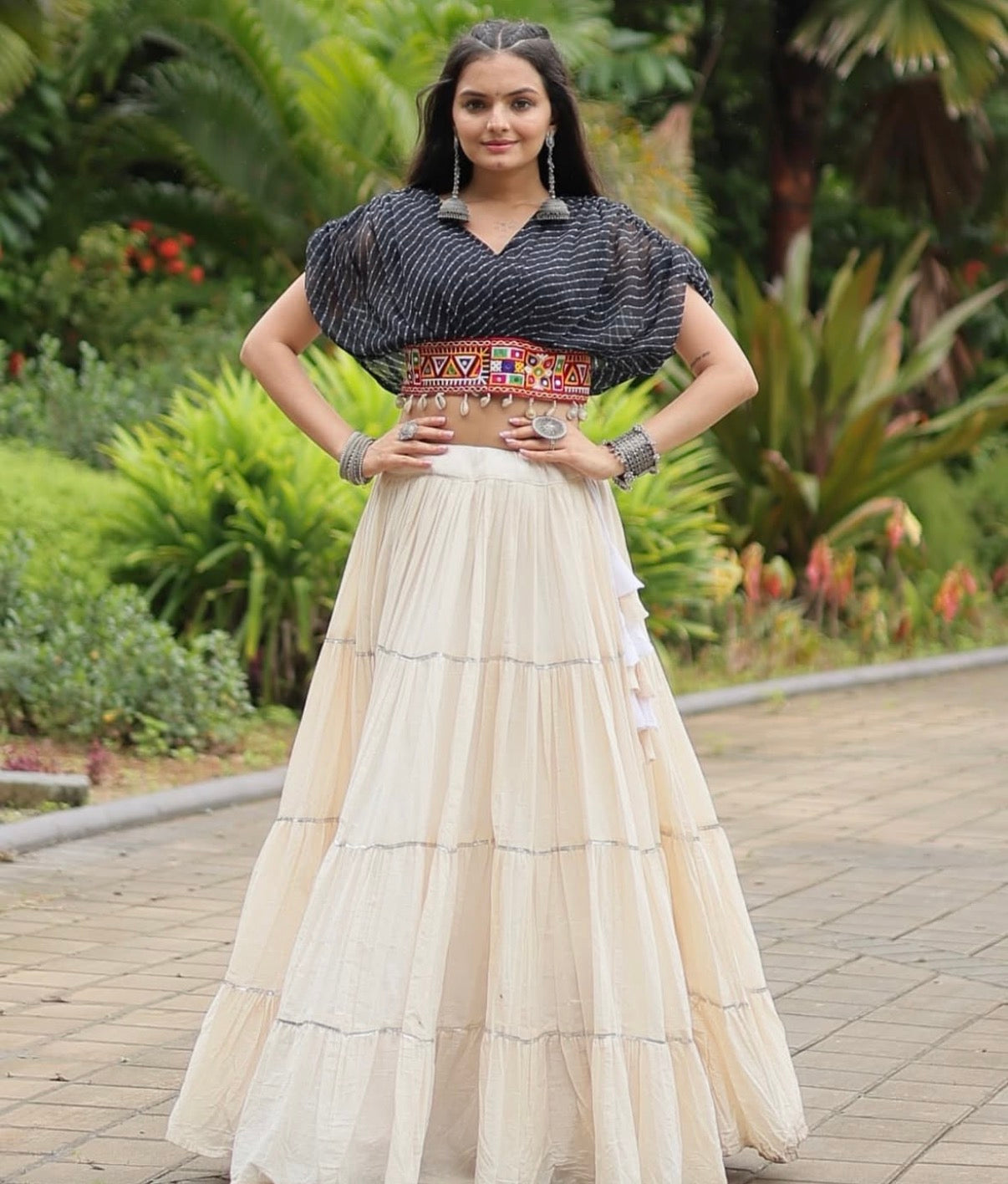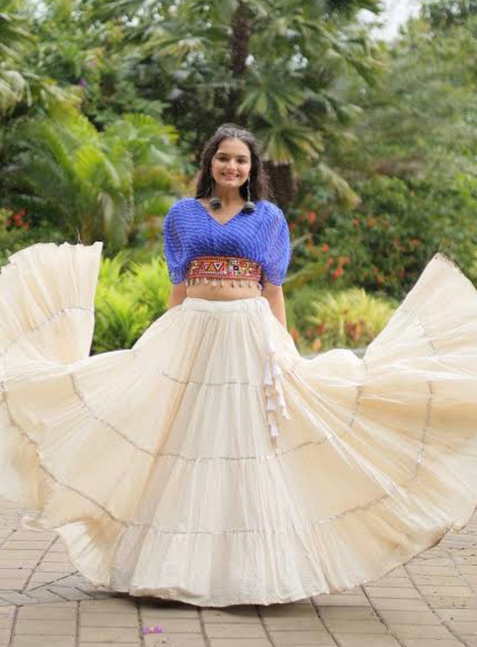 Crafted in breathable Kora Cotton, this ensemble blends traditional charm with modern ease. Featuring a 12-meter flair lehenga and a beautifully pleated Leheriya blouse with Kutchi patchwork, this set is perfect for Garba, Dandiya nights, and festive occasions.