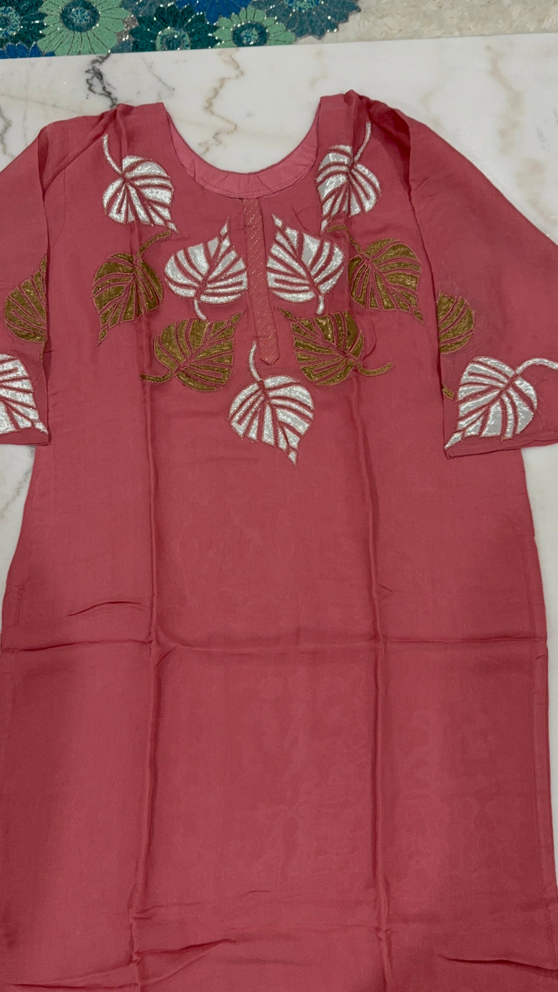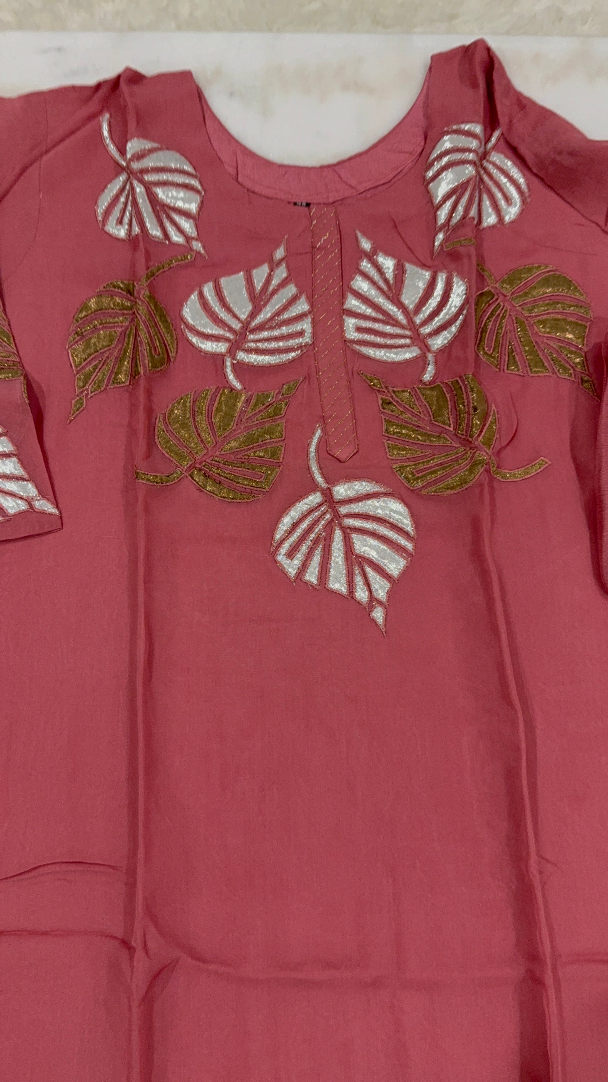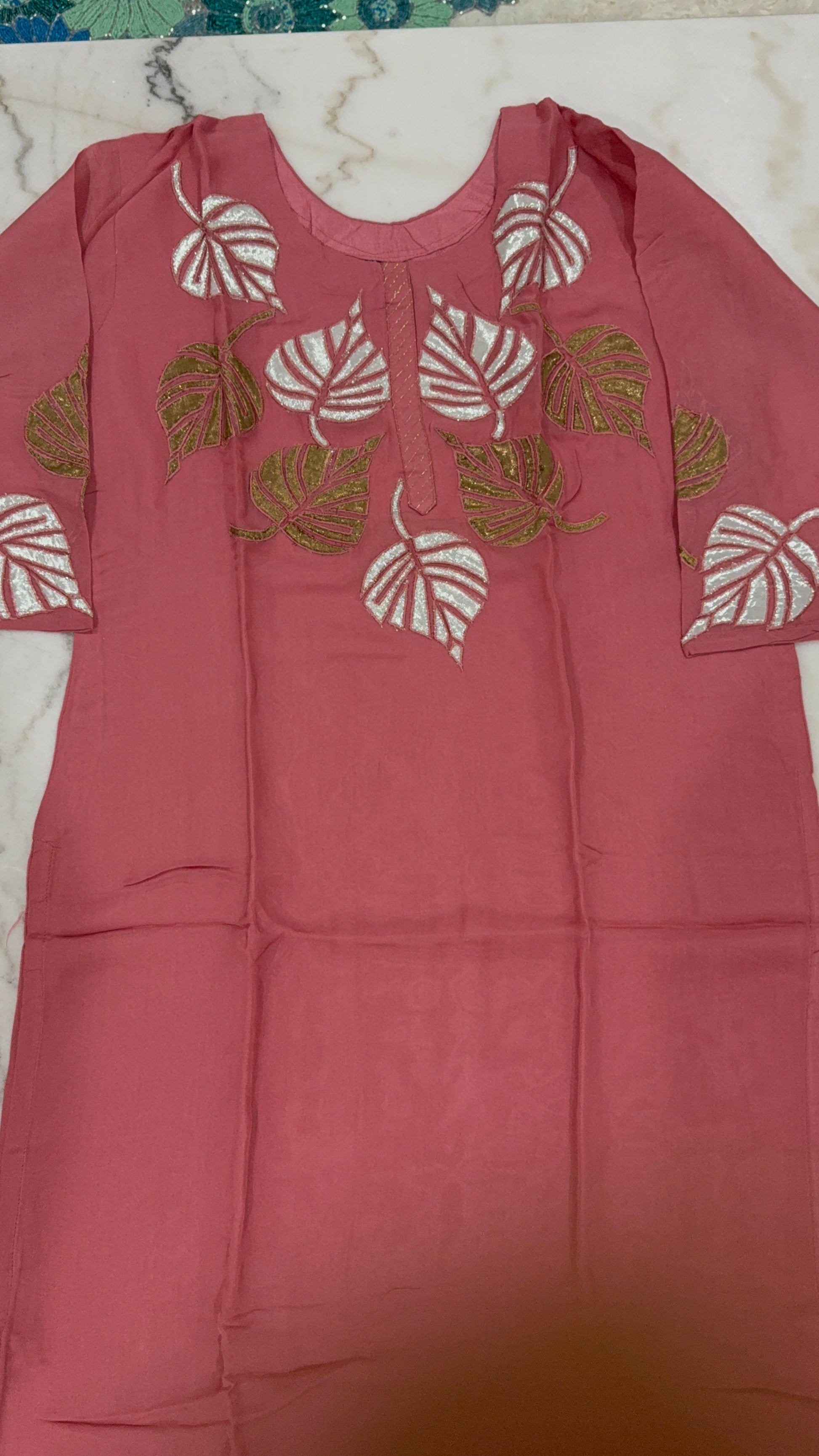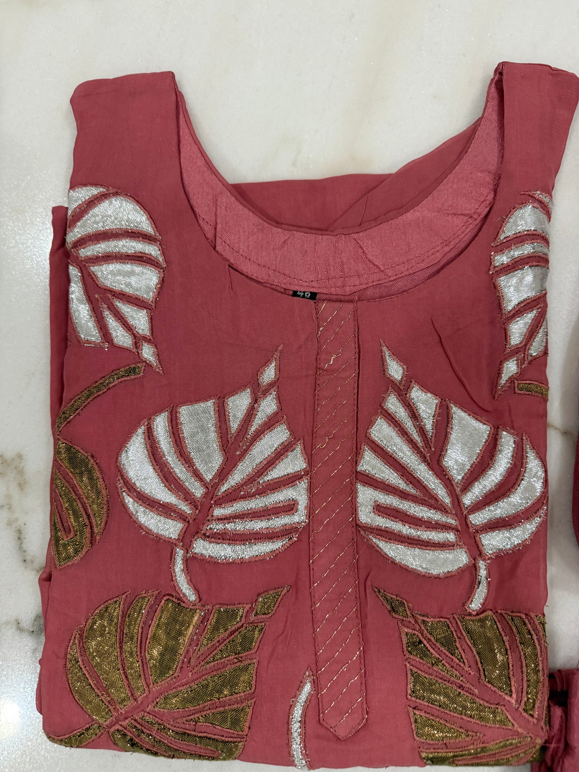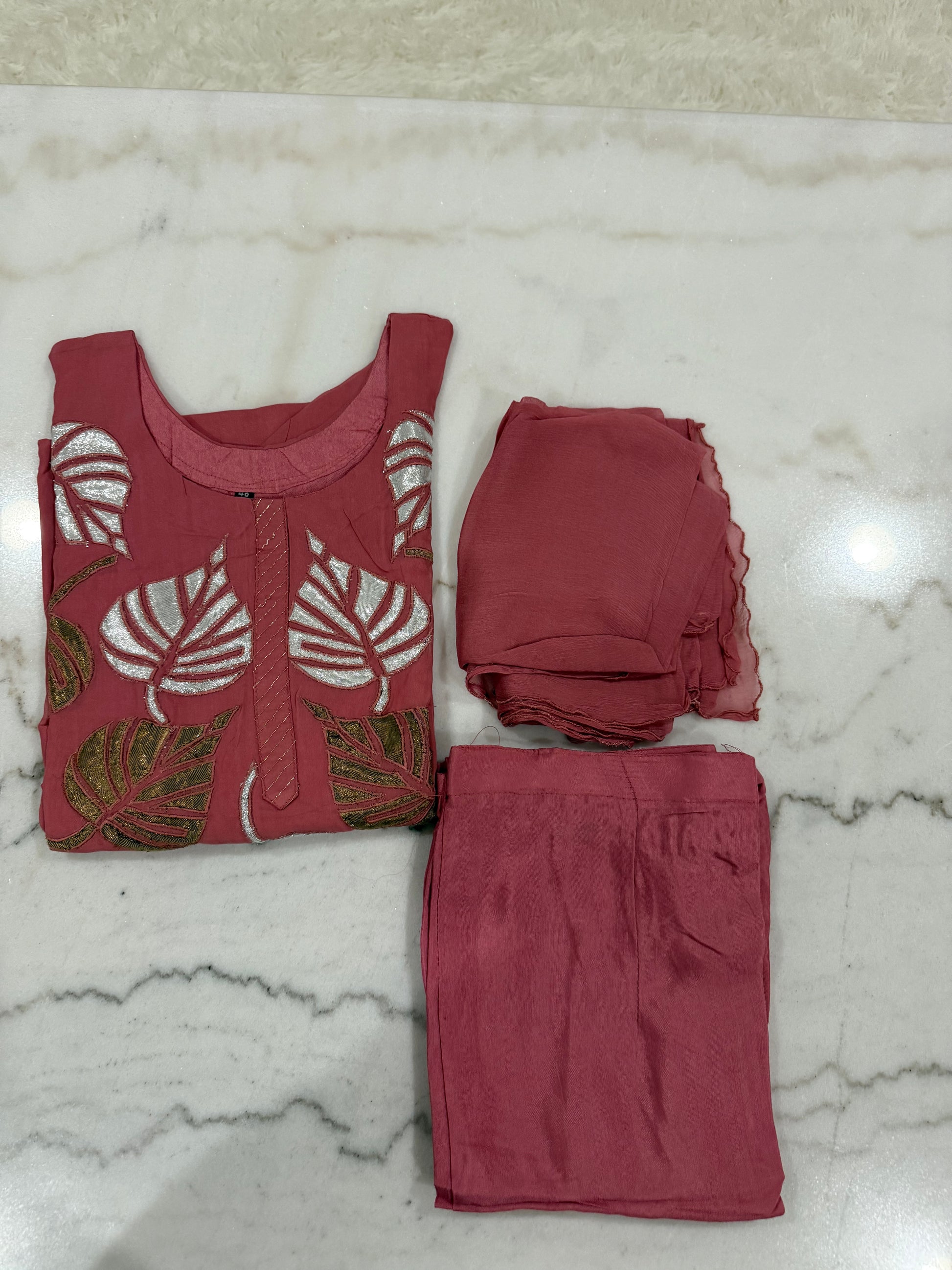 Step into effortless elegance with this beautifully embroidered salwar suit set in a rich rosewood pink hue. The kurta features intricate leaf motif embroidery in silver and olive green thread, adding a graceful charm to the traditional silhouette. Paired with a soft matching dupatta and comfortable pants, this 3-piece suit is perfect for festive gatherings, casual events, or gifting.