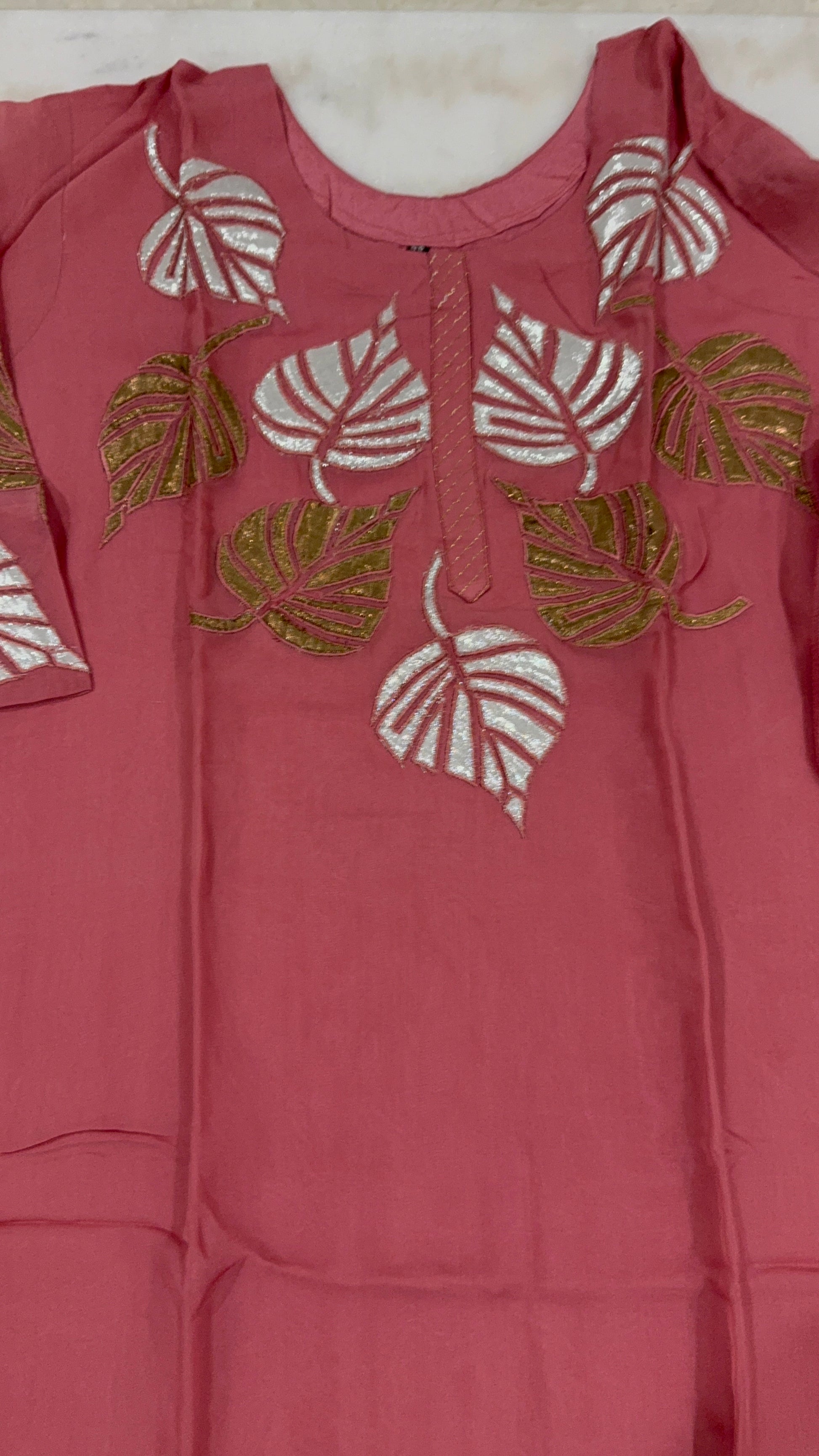 - Design: Silver and green thread leaf embroidery