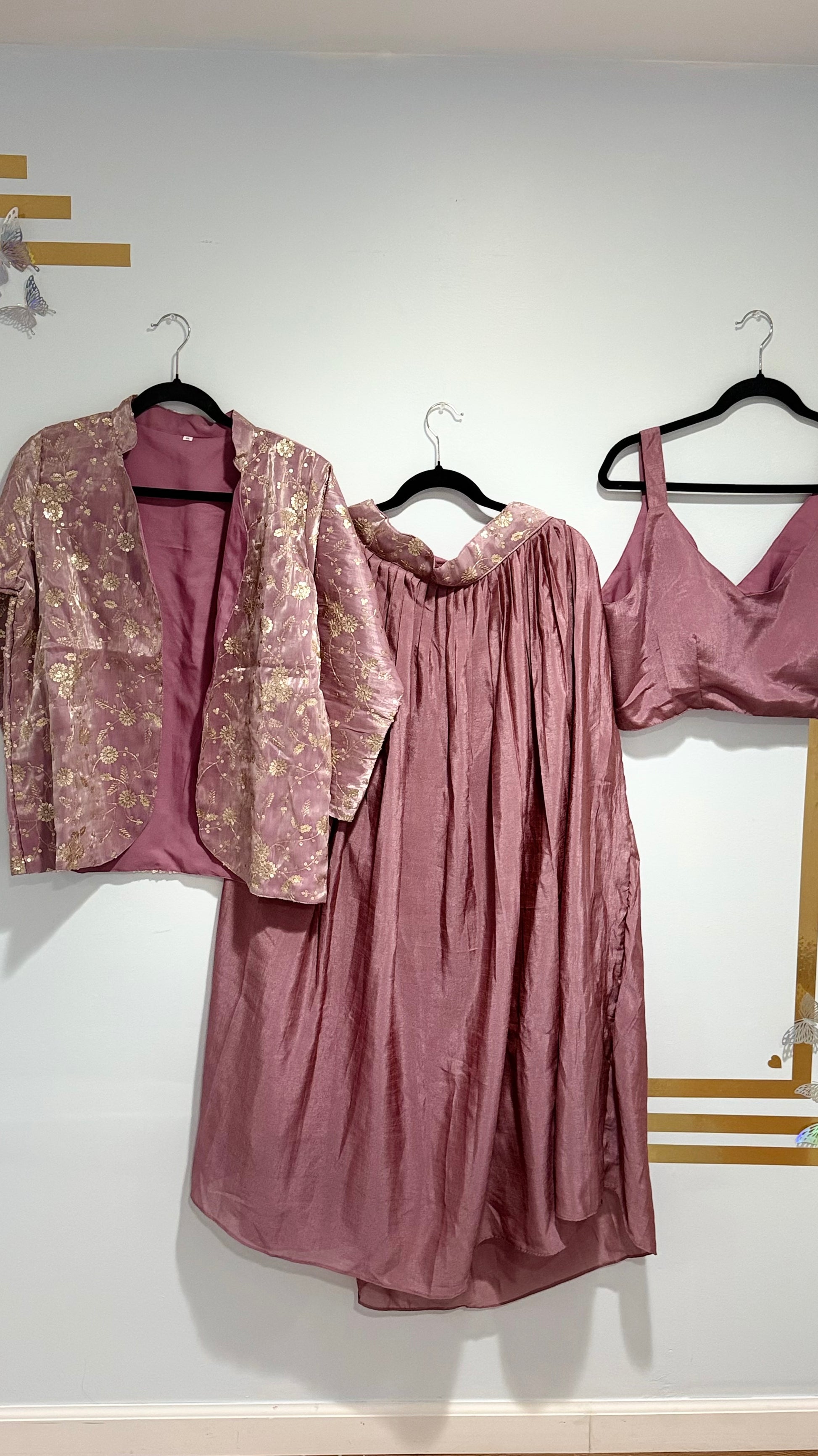 Make a bold statement this festive season with our Elegant Silk Embroidered Jacket Skirt Set. This 3-piece ensemble features:
