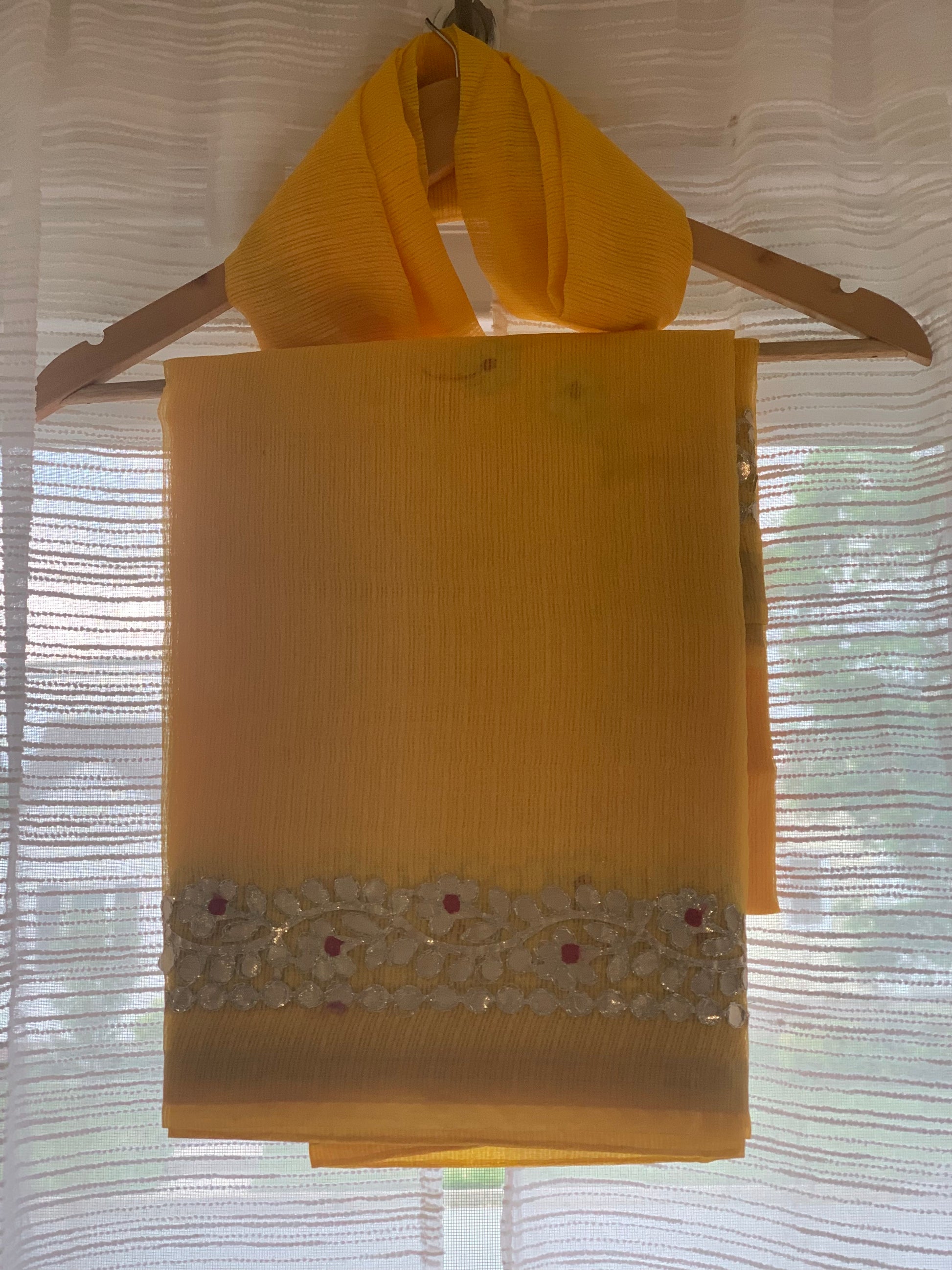 Gota work involves fine detailing using applique techniques, hand stitching, and sometimes mirror or sequin embellishments.