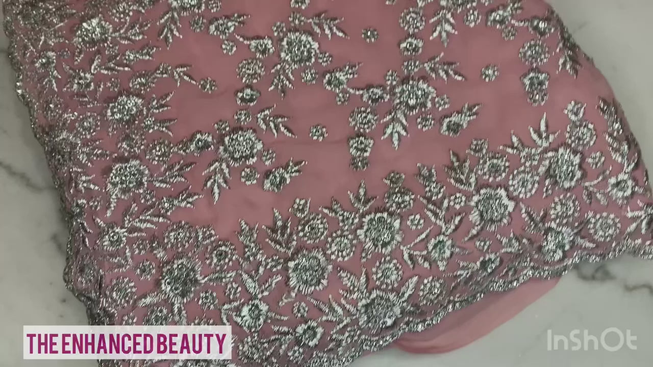Adorned with intricate embroidered detailing, the saree features delicate floral or abstract motifs along the borders and pallu. The embroidery is highlighted with shimmering threads, sequins, and subtle stonework—adding just the right touch of sparkle for evening parties, receptions, or festive gatherings.