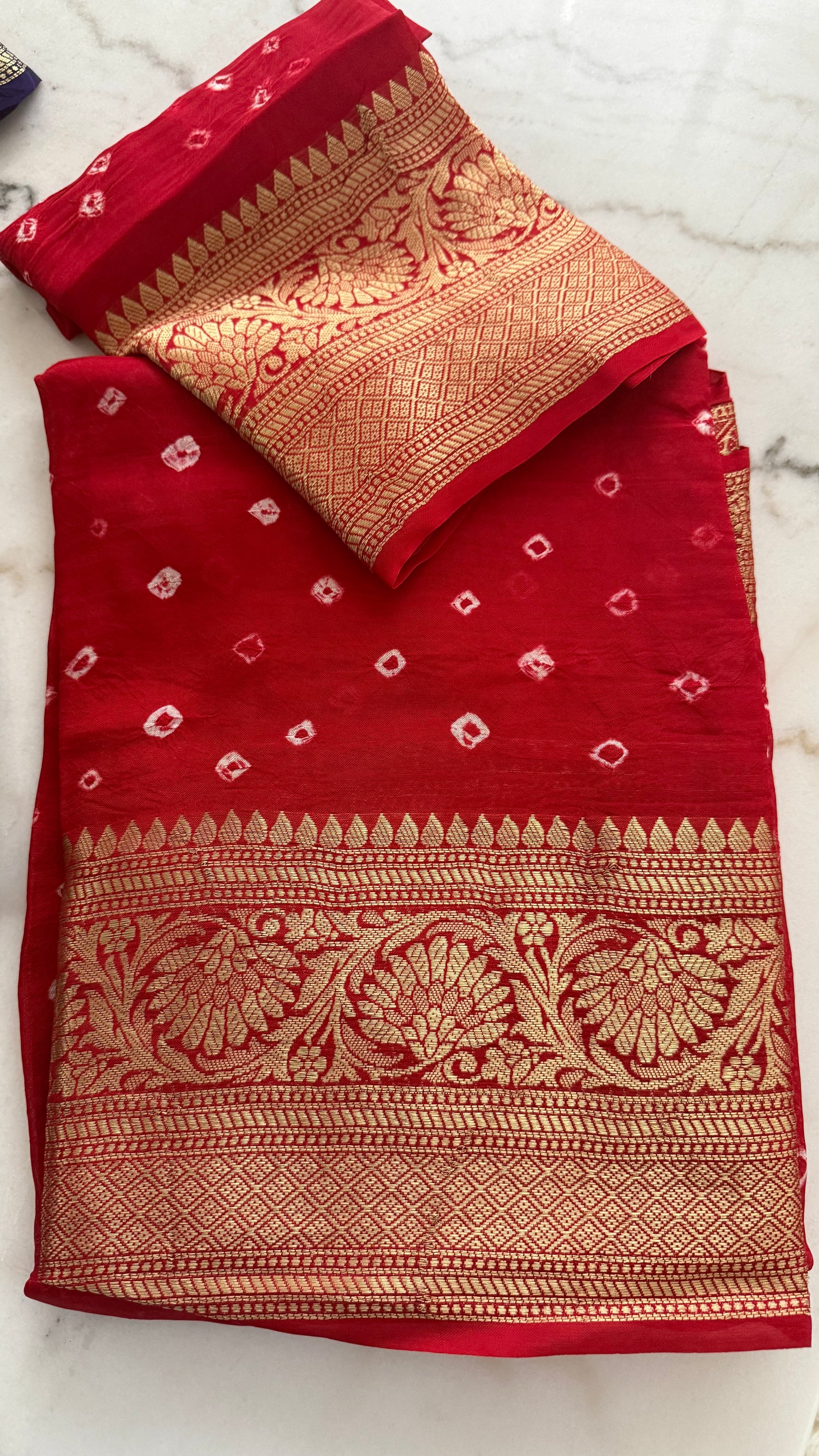 Celebrate timeless tradition with this Hand Bandhej Bandhani Saree — a vibrant masterpiece woven with cultural elegance and zari craftsmanship. Made from premium fabric with authentic hand tie-dye patterns and adorned with rich zari weaving, this saree is perfect for festive and wedding occasions.