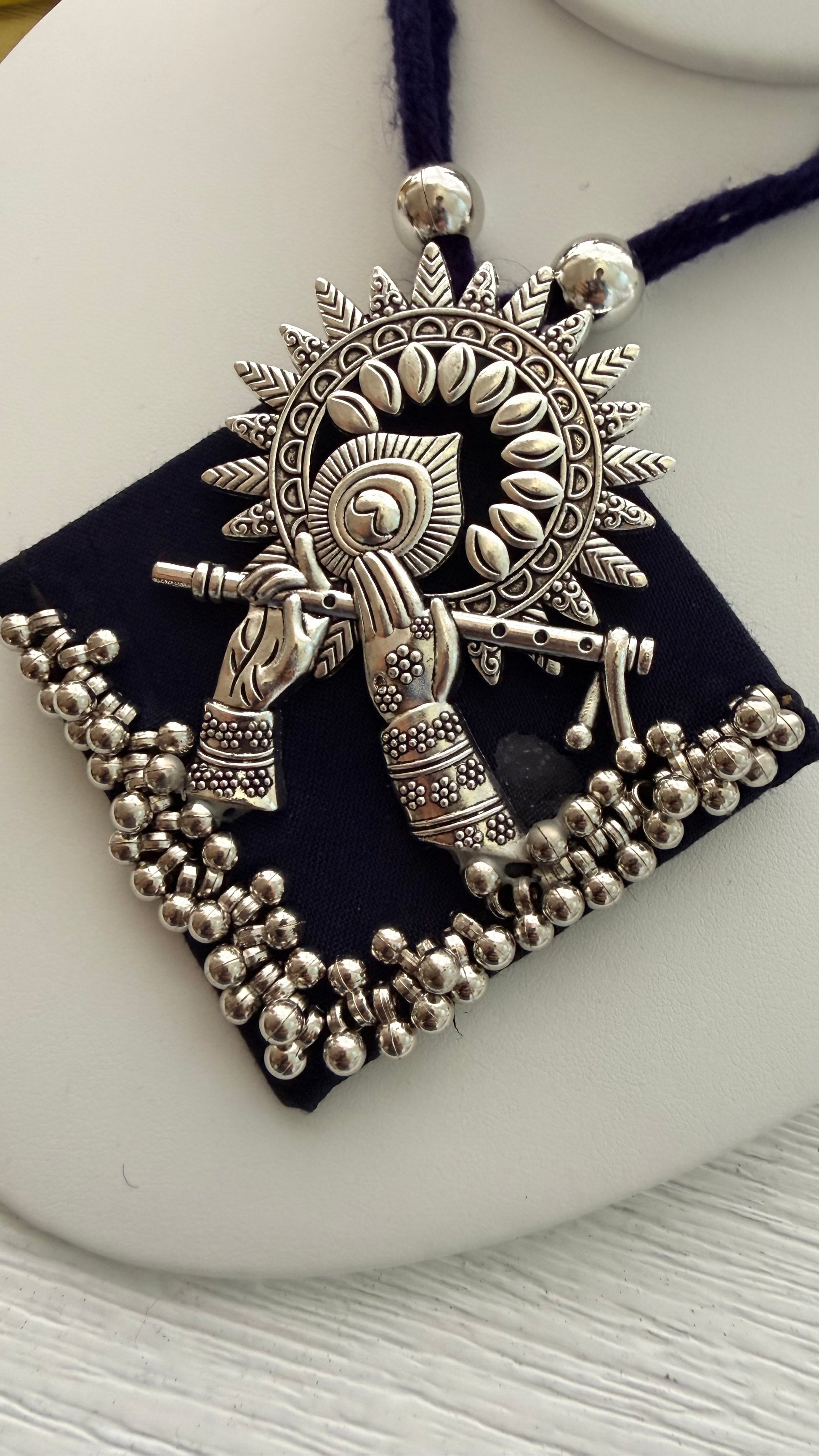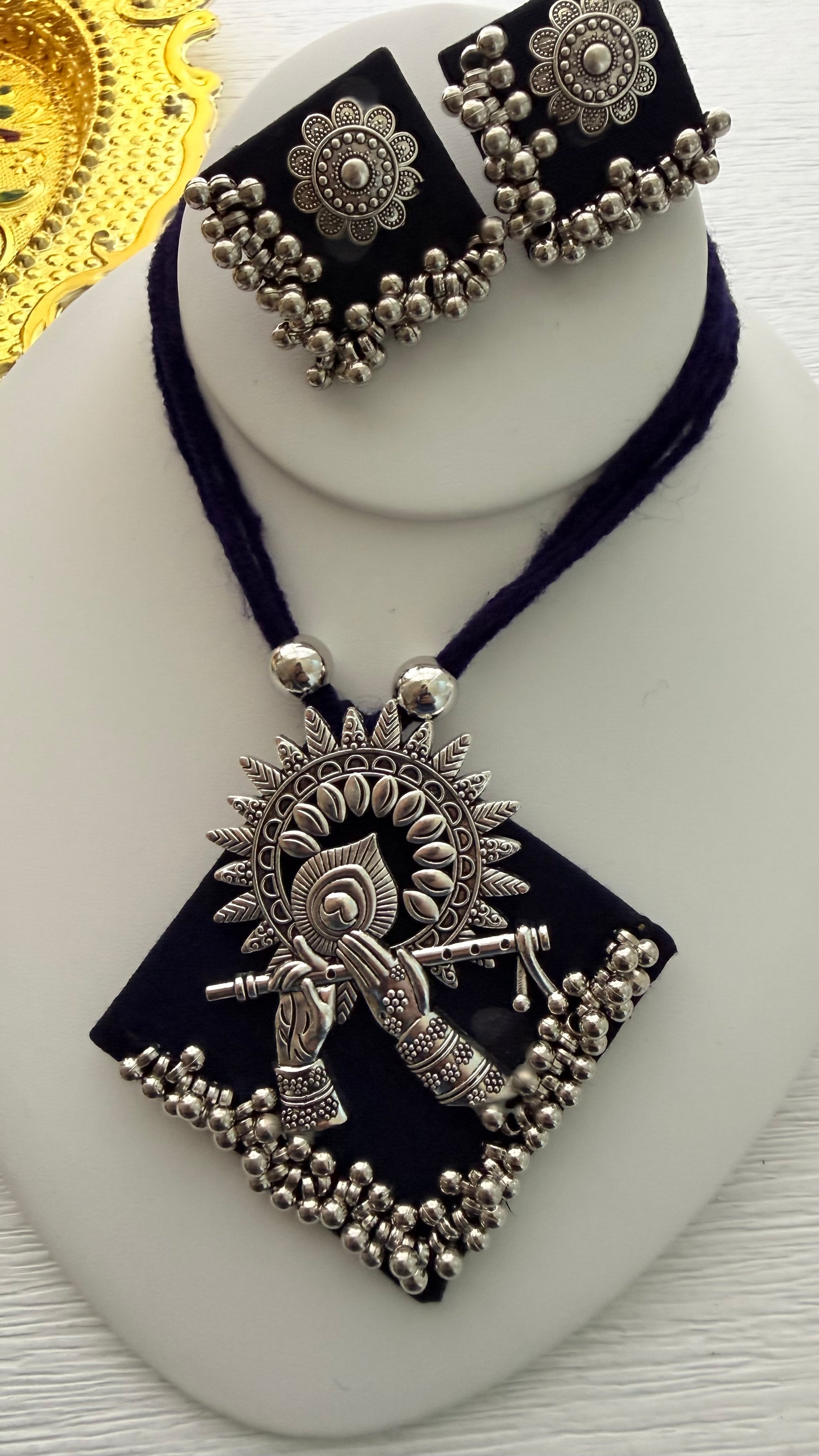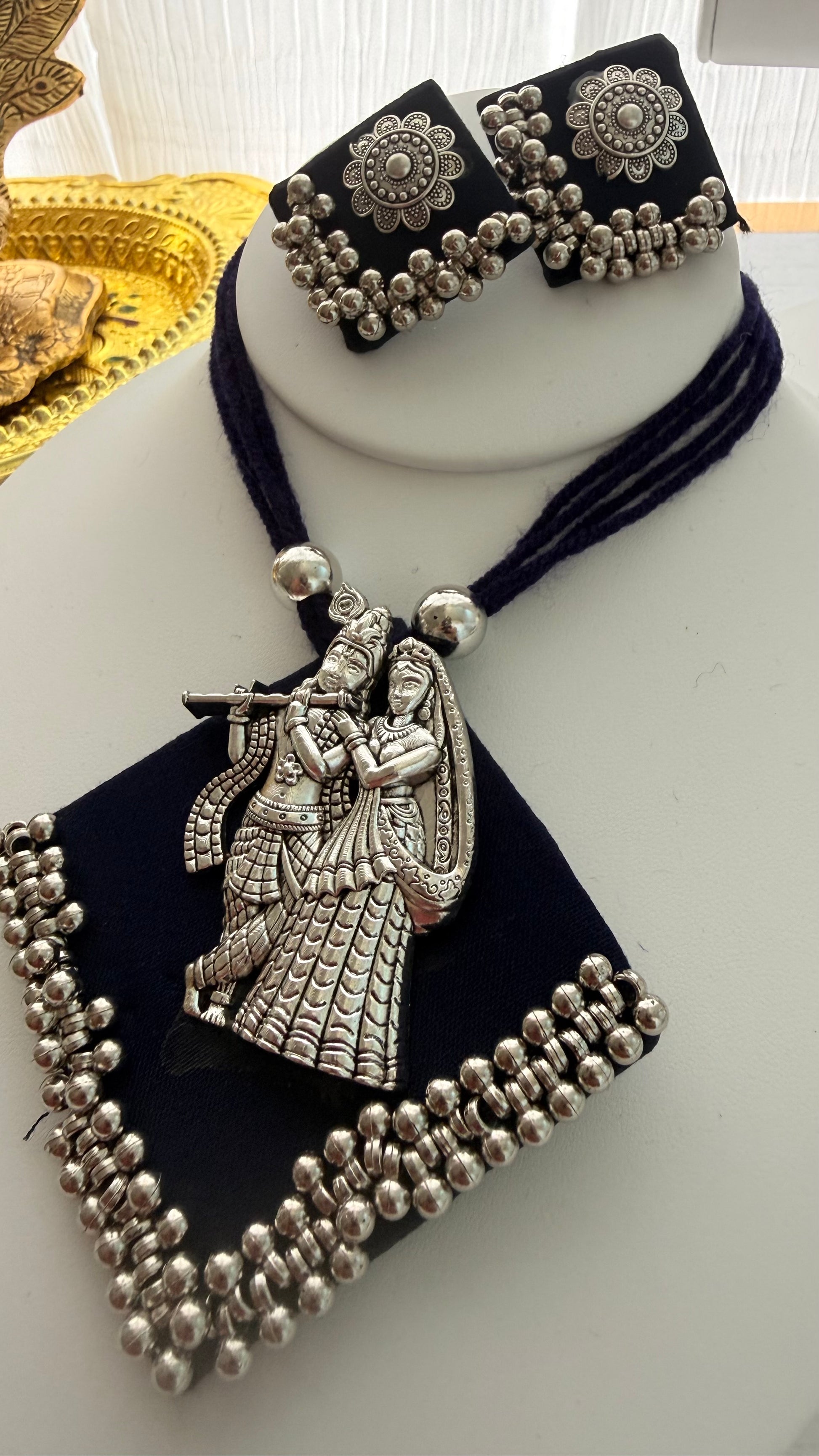 Handcrafted oxidized Navratri necklace set with Radha Krishna & traditional motifs, paired with matching earrings. Perfect for Garba, festive nights & ethnic outfits. Shop exclusive festive jewelry online at The Enhanced Beauty.