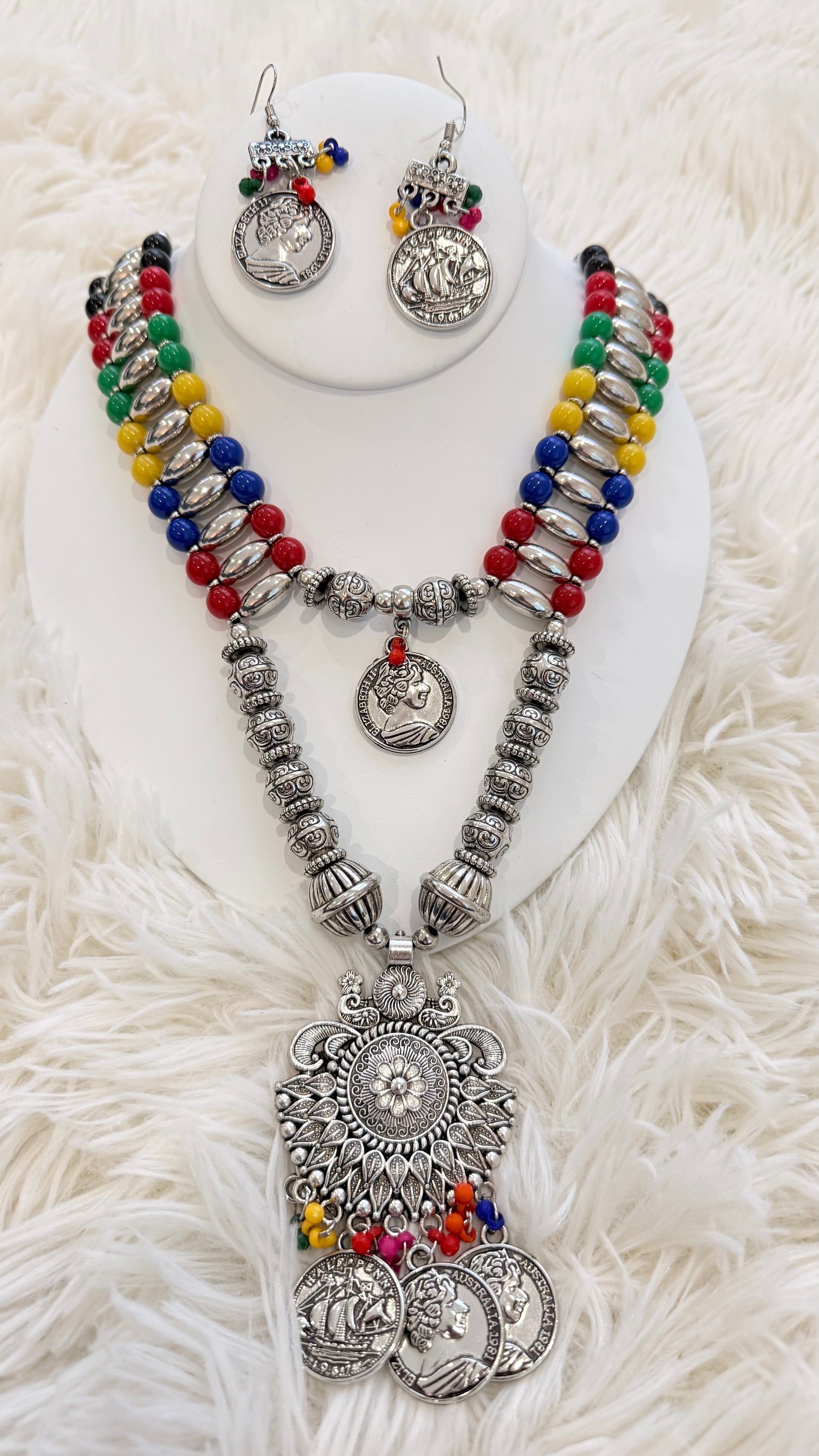 Oxidized Silver Coin Necklace Set | Colorful Beaded Tribal Jewelry