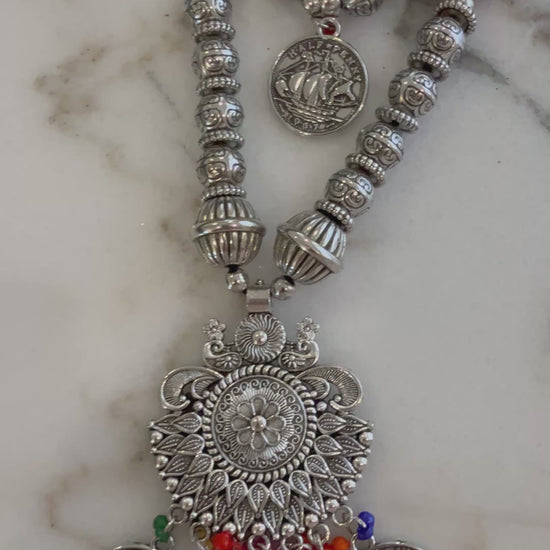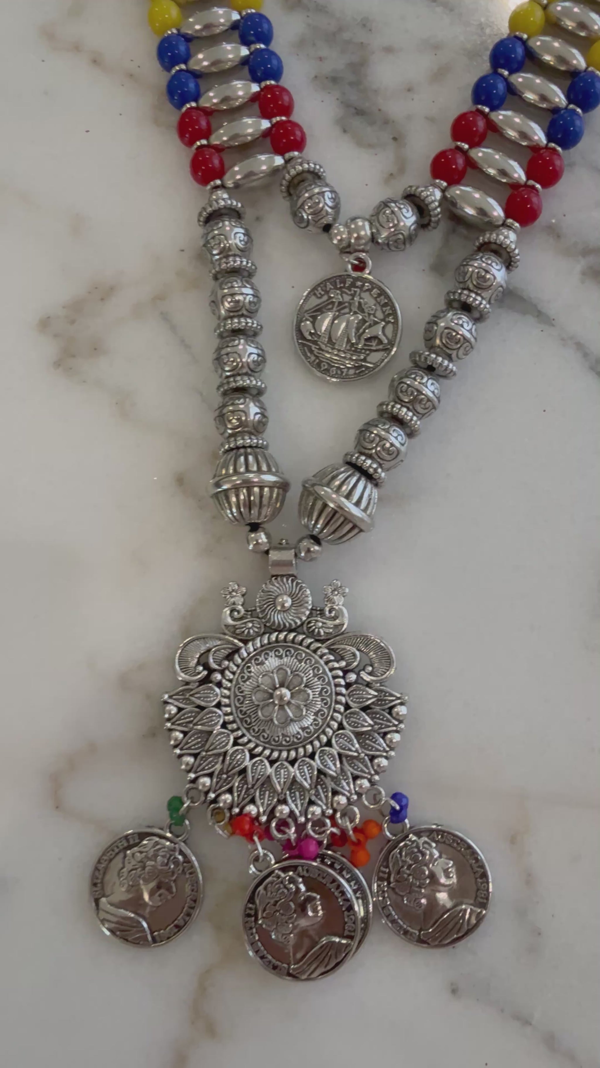 Elevate your ethnic look with this oxidized silver coin necklace set featuring vibrant multicolor beads, antique coin charms, and matching earrings. Perfect for Navratri, Garba, weddings & festive occasions.