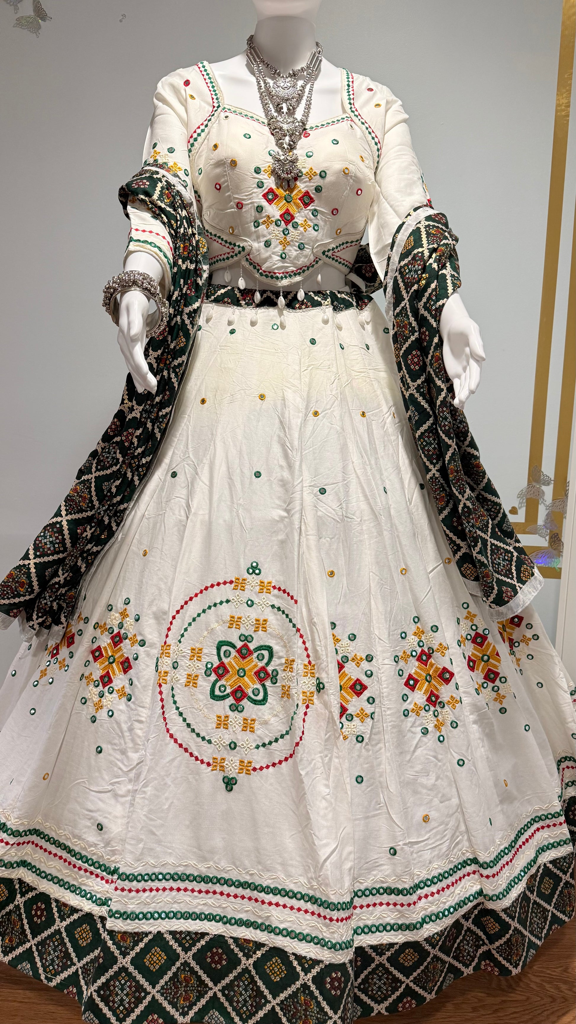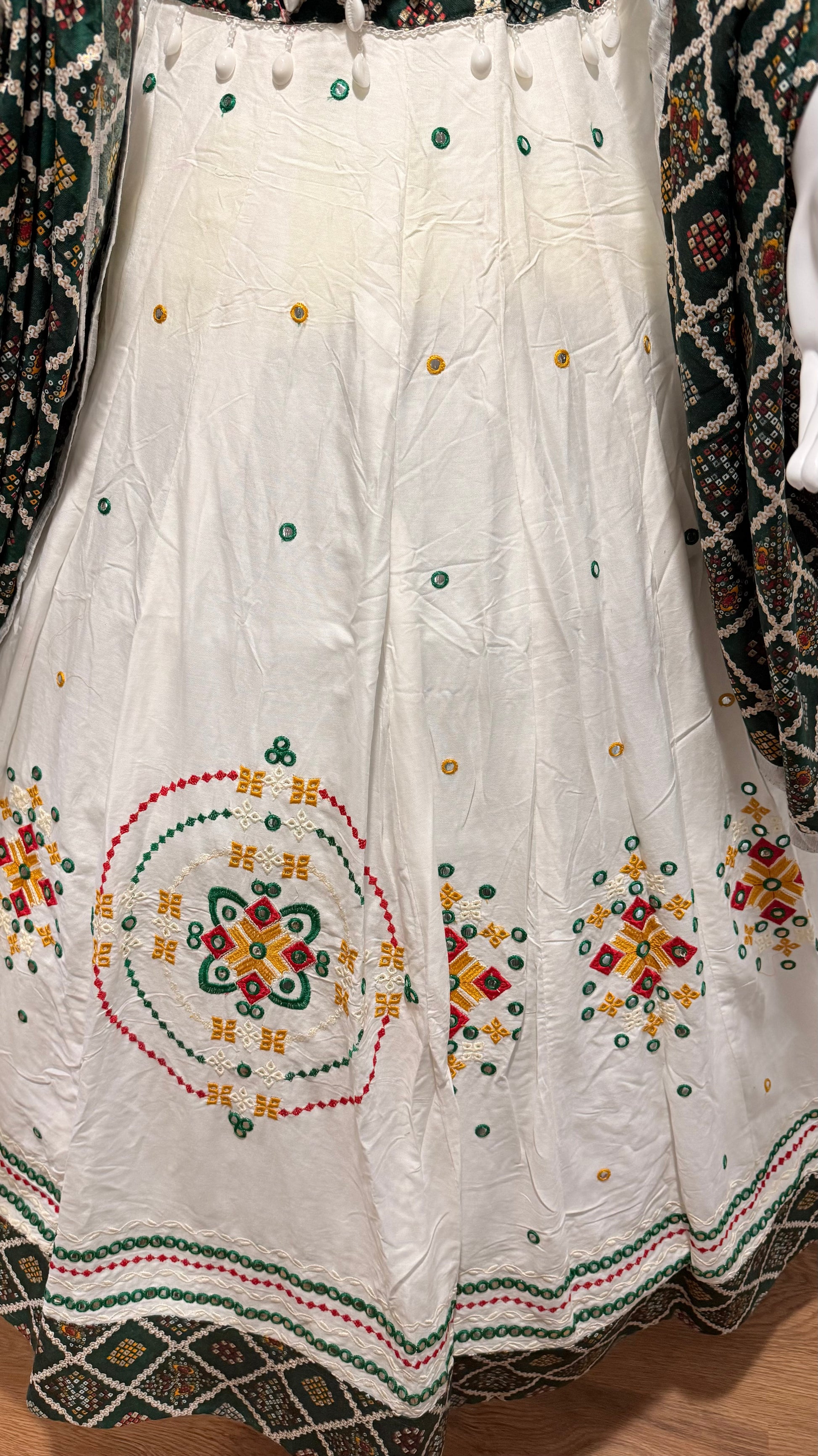 Shop pure jam cotton chaniya choli in Kunjo design featuring heavy computer aari work, 7-8 mtr flare, padded blouse & bandhni dupatta. Perfect for Navratri Garba nights.