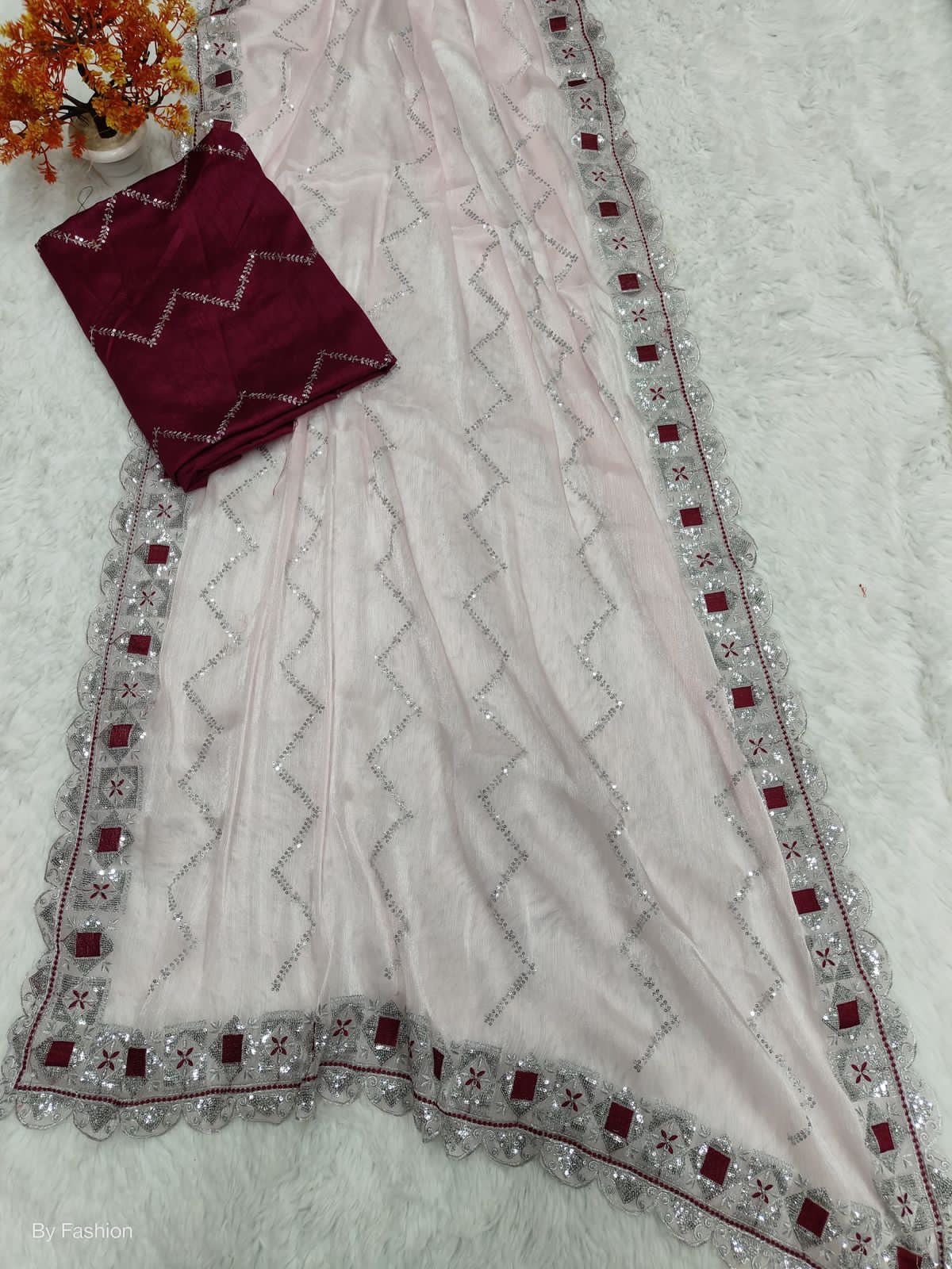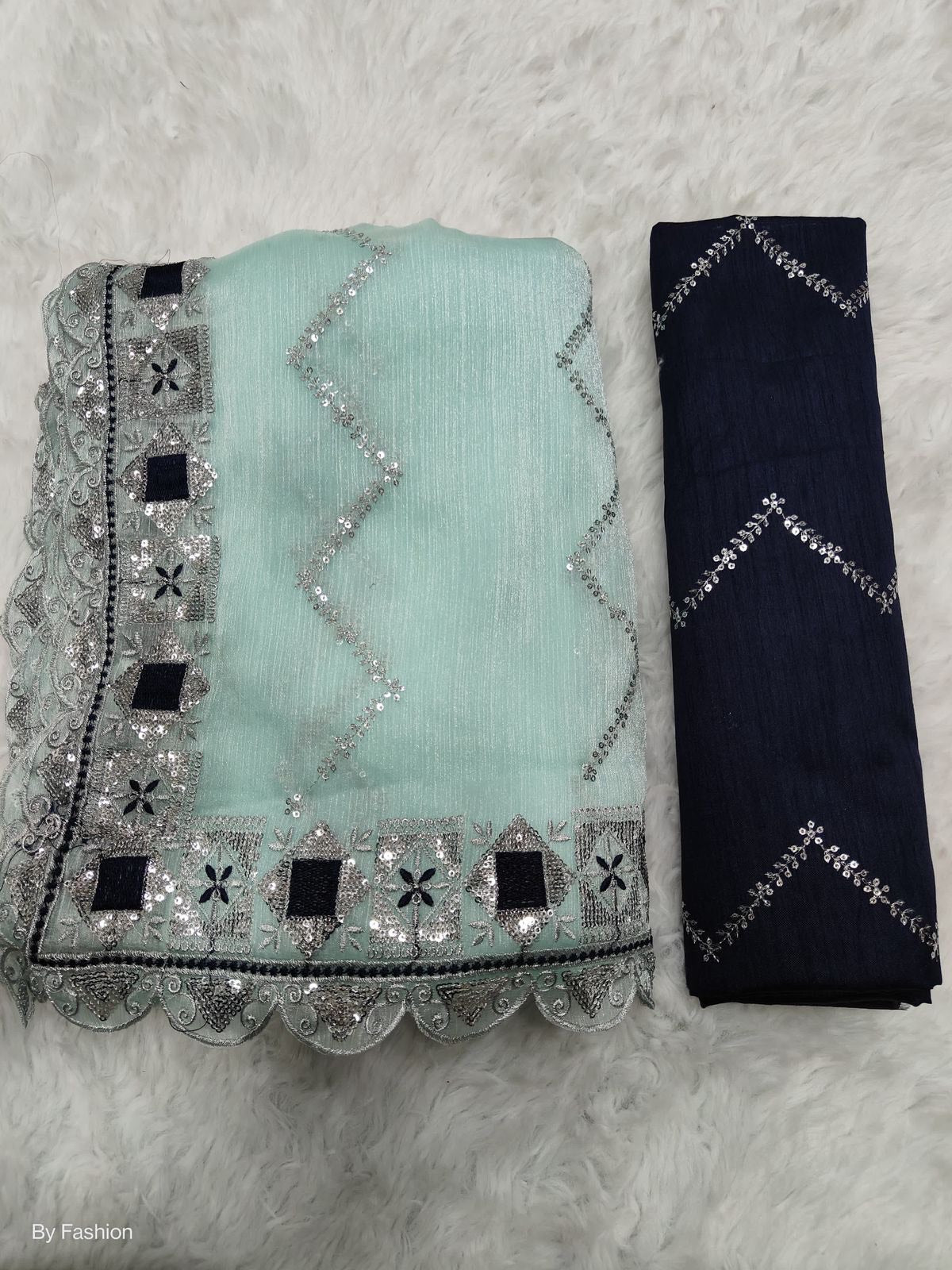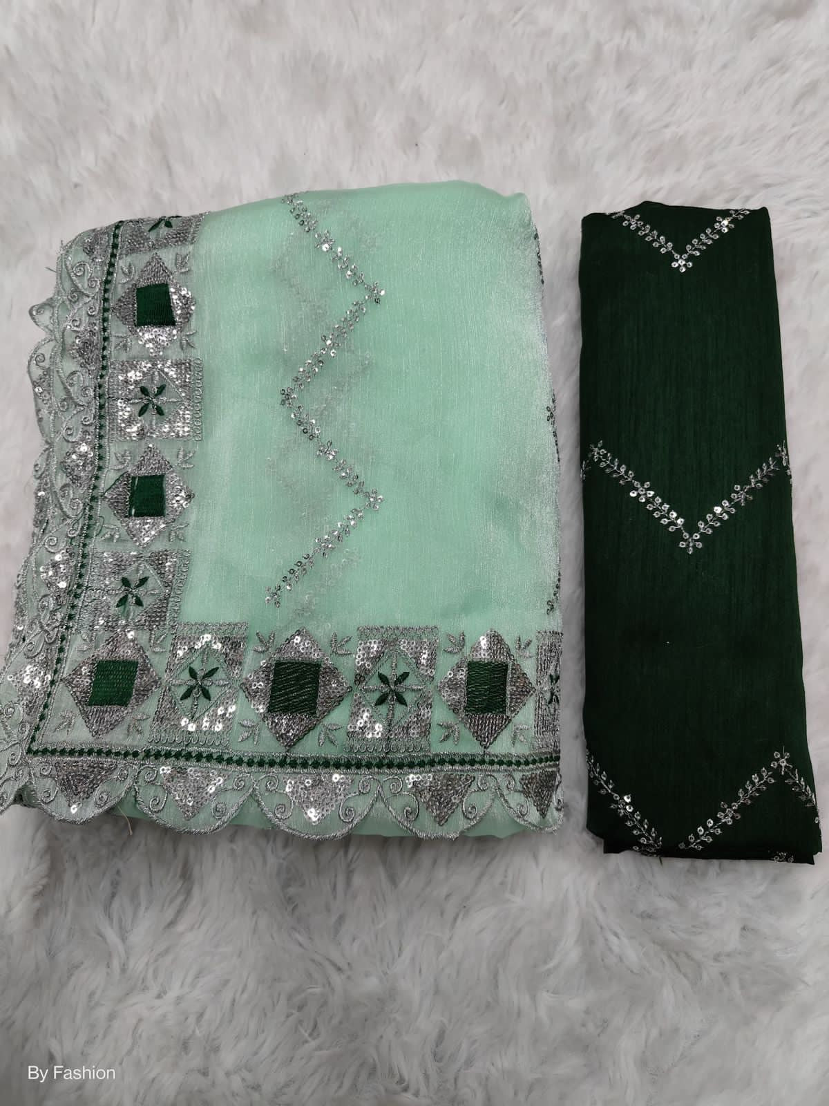 SAREES FABRIC.:-Pure jimmy choo silk multi colour thread work with sequence and cut work border.all over line thread work *Blouse :- Banglory silk with sequins designer work blouse. Length:-5.60 MTR sarees and 0.80MTR blouse