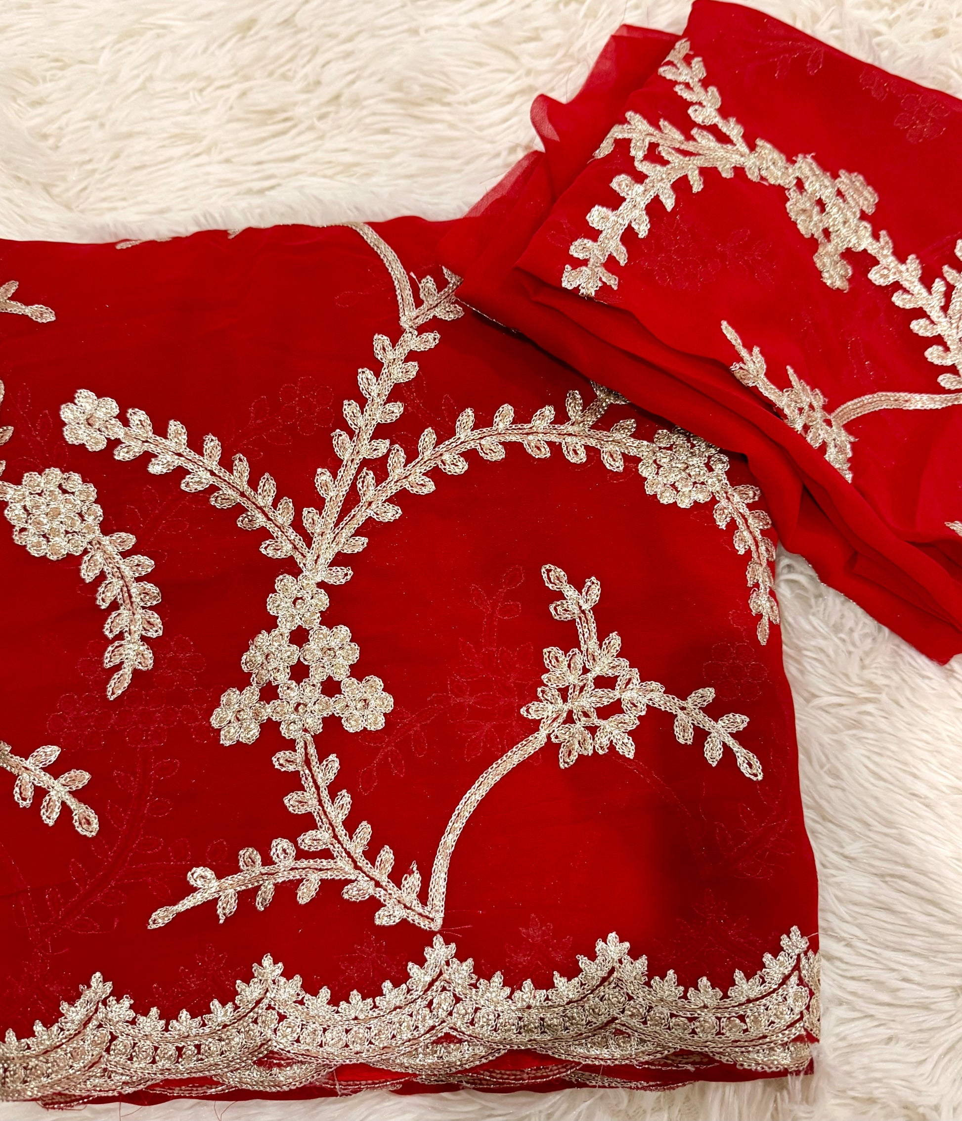 Red Bridal Georgette Saree with Golden Sequence Kashida Work