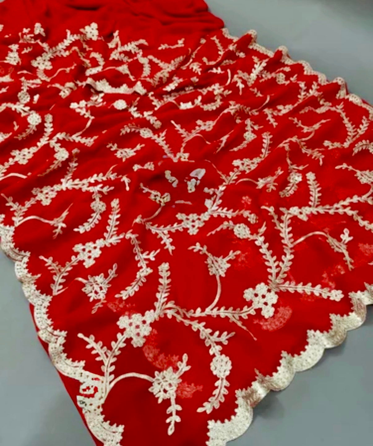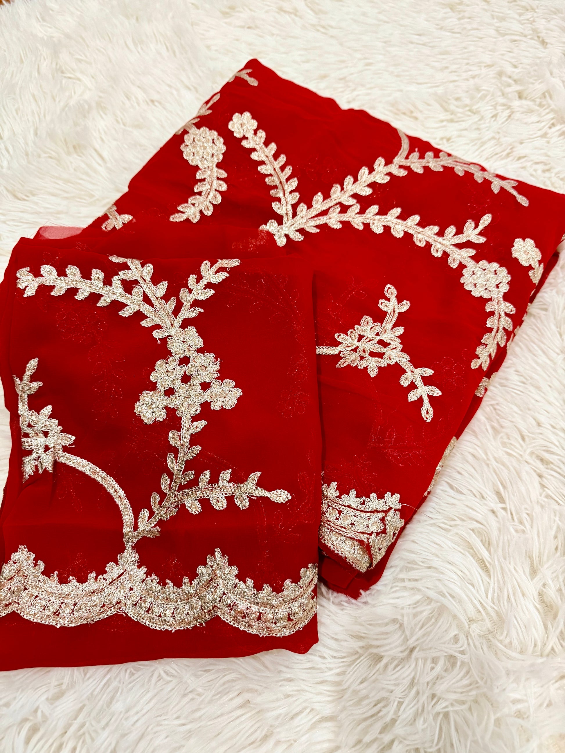 Turn every occasion into a celebration of elegance with our Red Bridal Georgette Saree, beautifully adorned with golden sequence Kashida work.