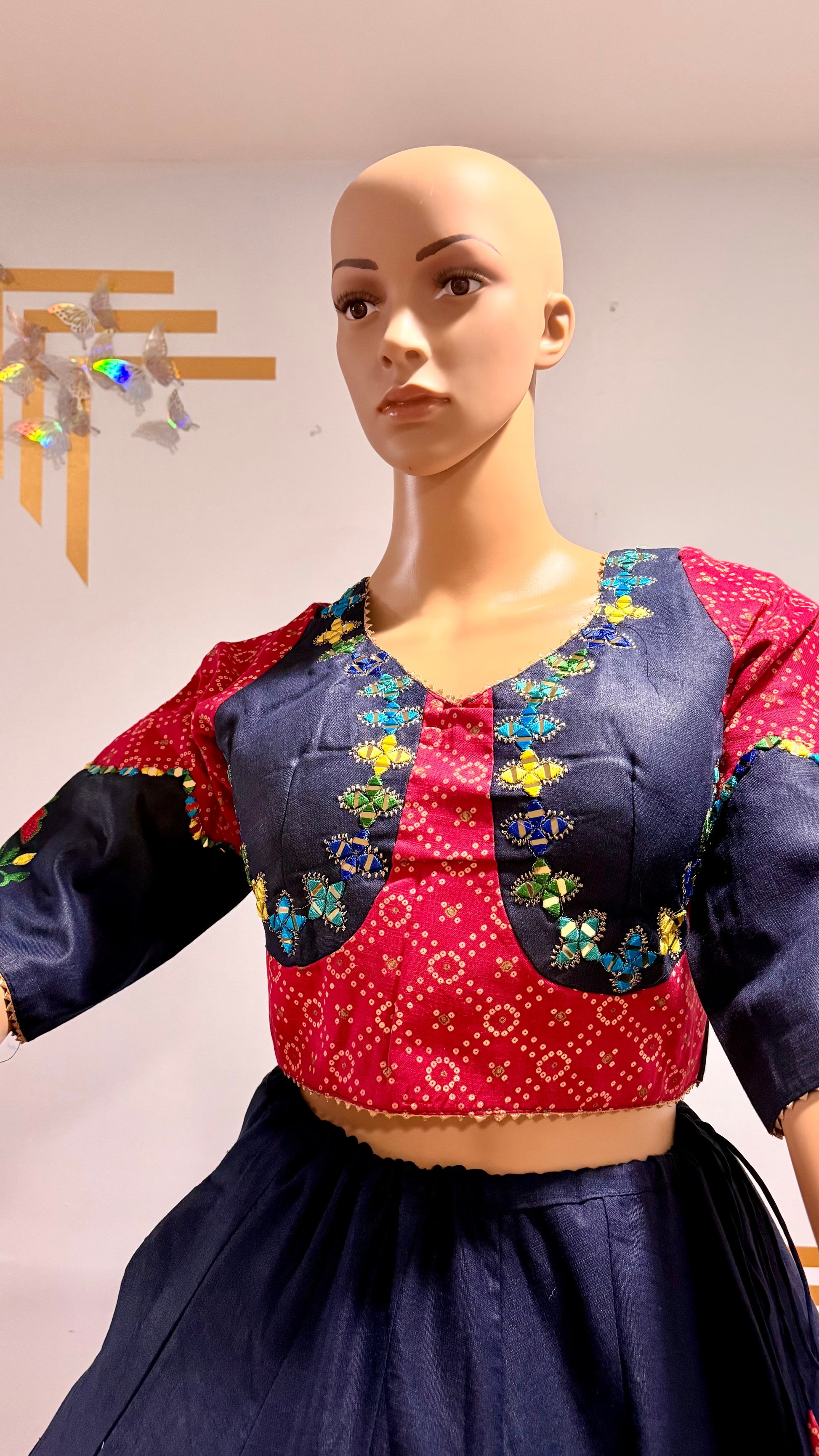 ✨ Choli (Blouse): Half-n-half designer blouse in navy and rani pink, highlighted with thread embroidery and mirror-style accents.