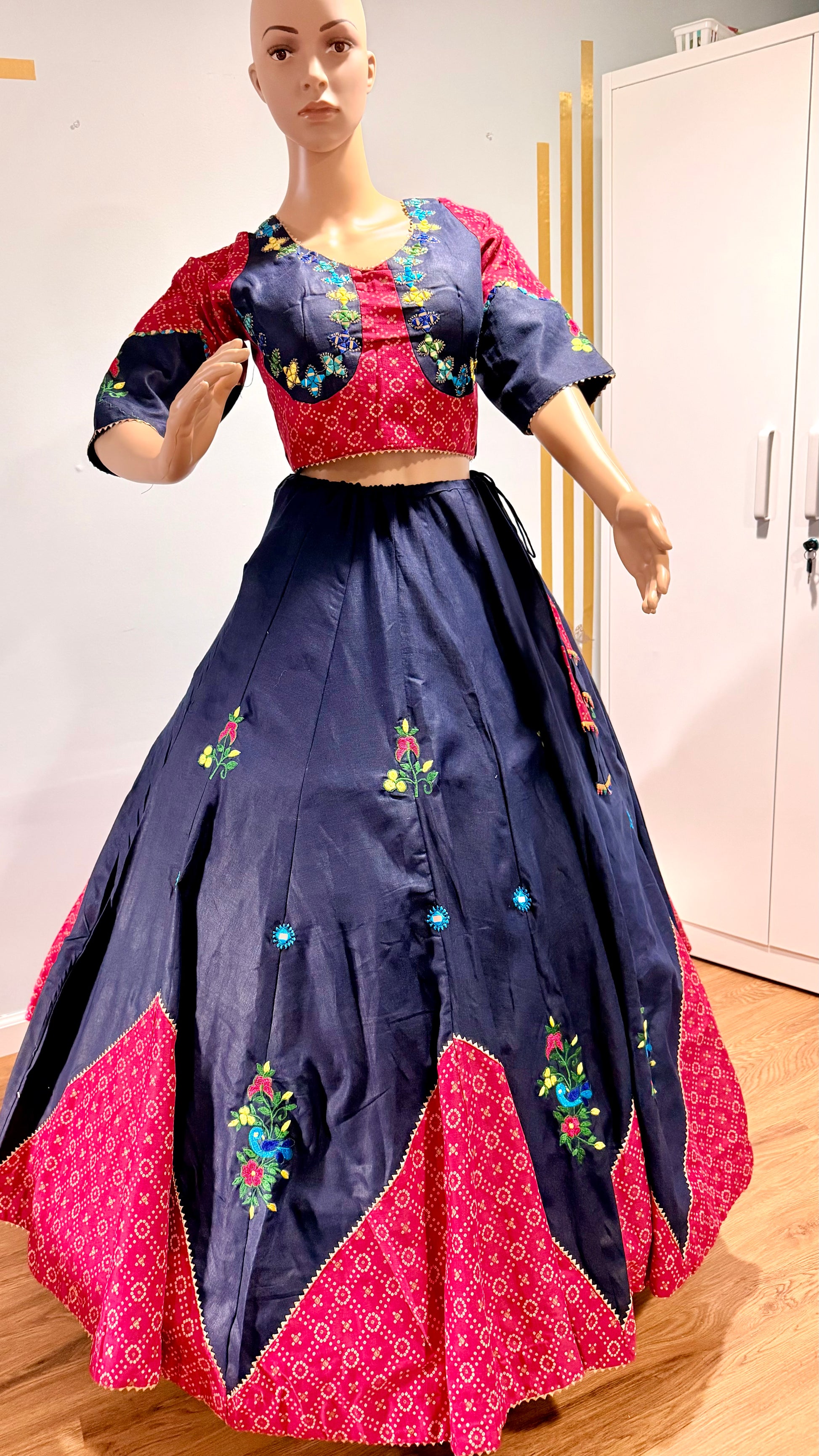 ✨ Lehenga (Skirt): Navy blue cotton silk base with vibrant floral embroidery and rani pink bandhani-patterned flare panels, finished with delicate lace edges.