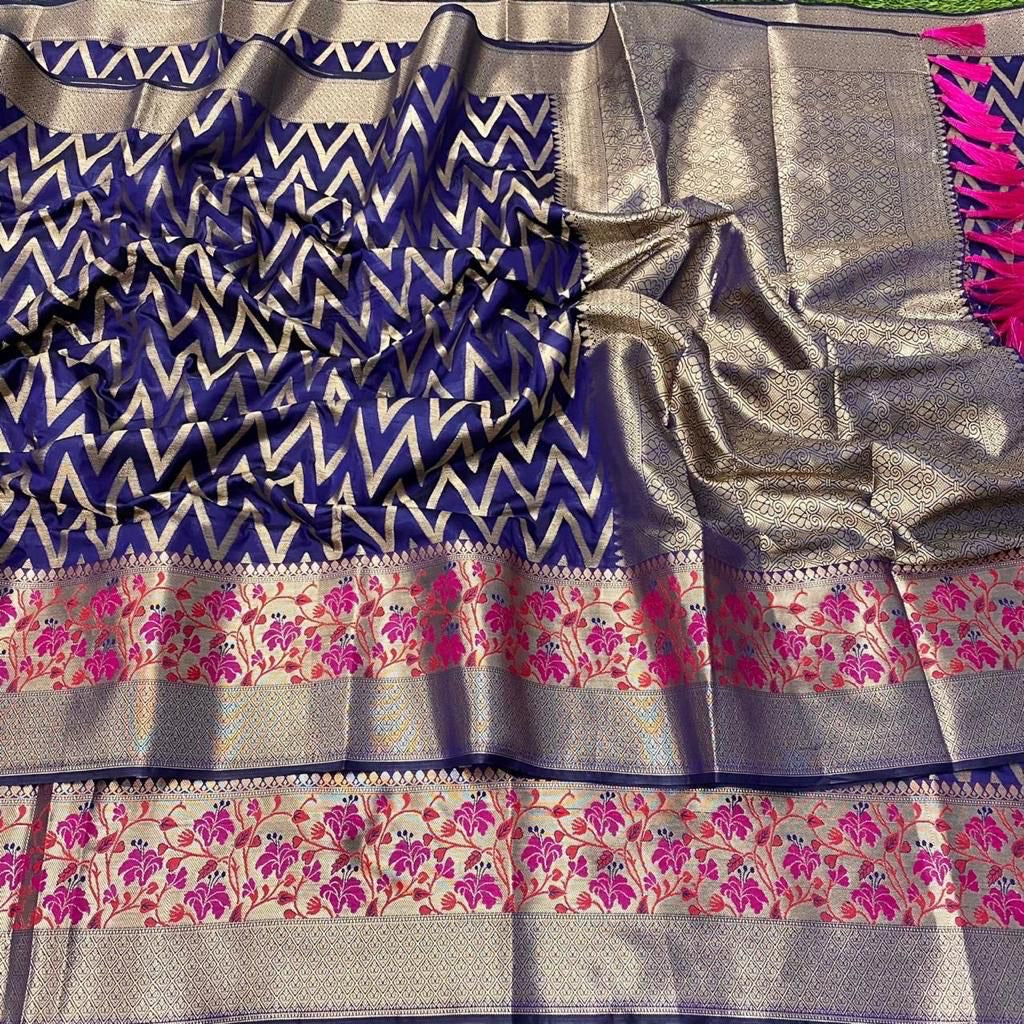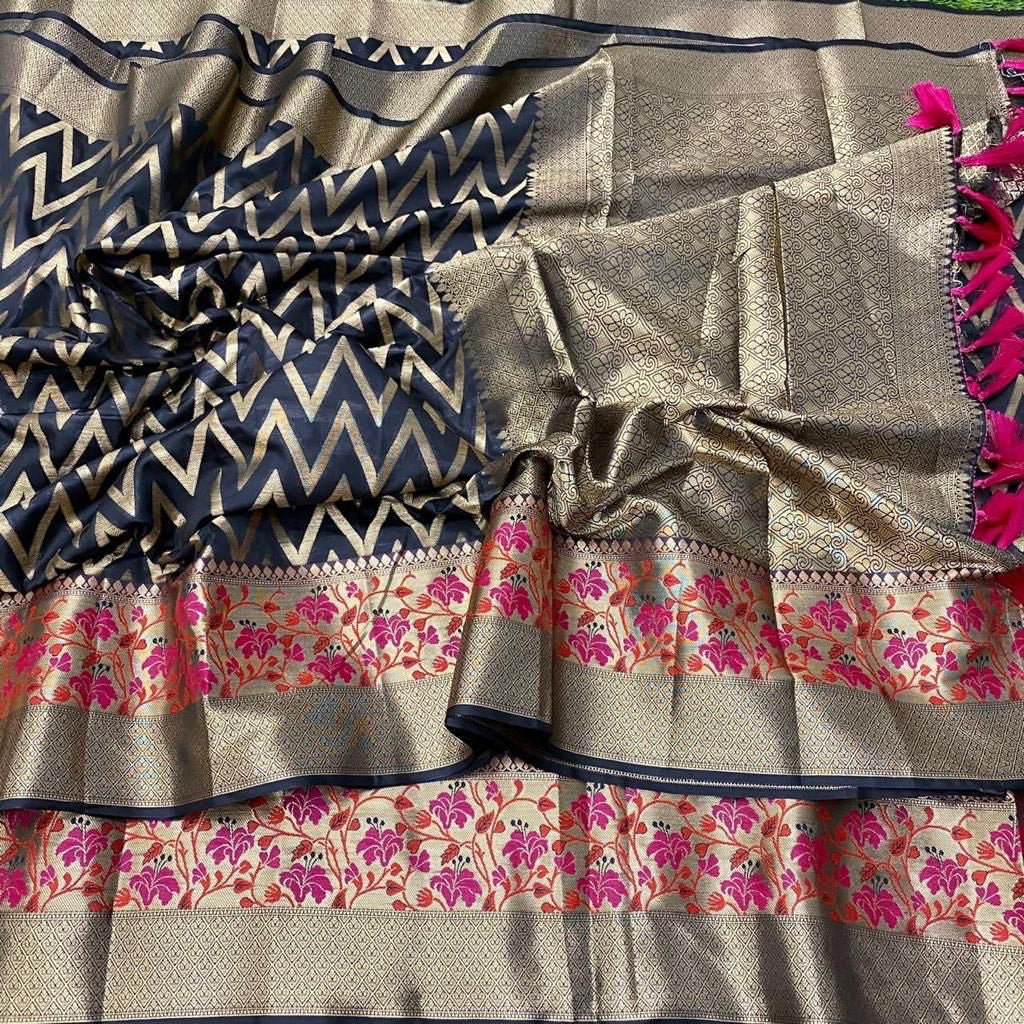 Unveil your royal charm with our Soft Kanjivaram Silk Saree, a beautiful fusion of traditional artistry and modern elegance. This masterpiece features fine zari weaving intricately spread throughout the saree, paired with Meenakari woven designs that add color, depth, and heritage to every drape.