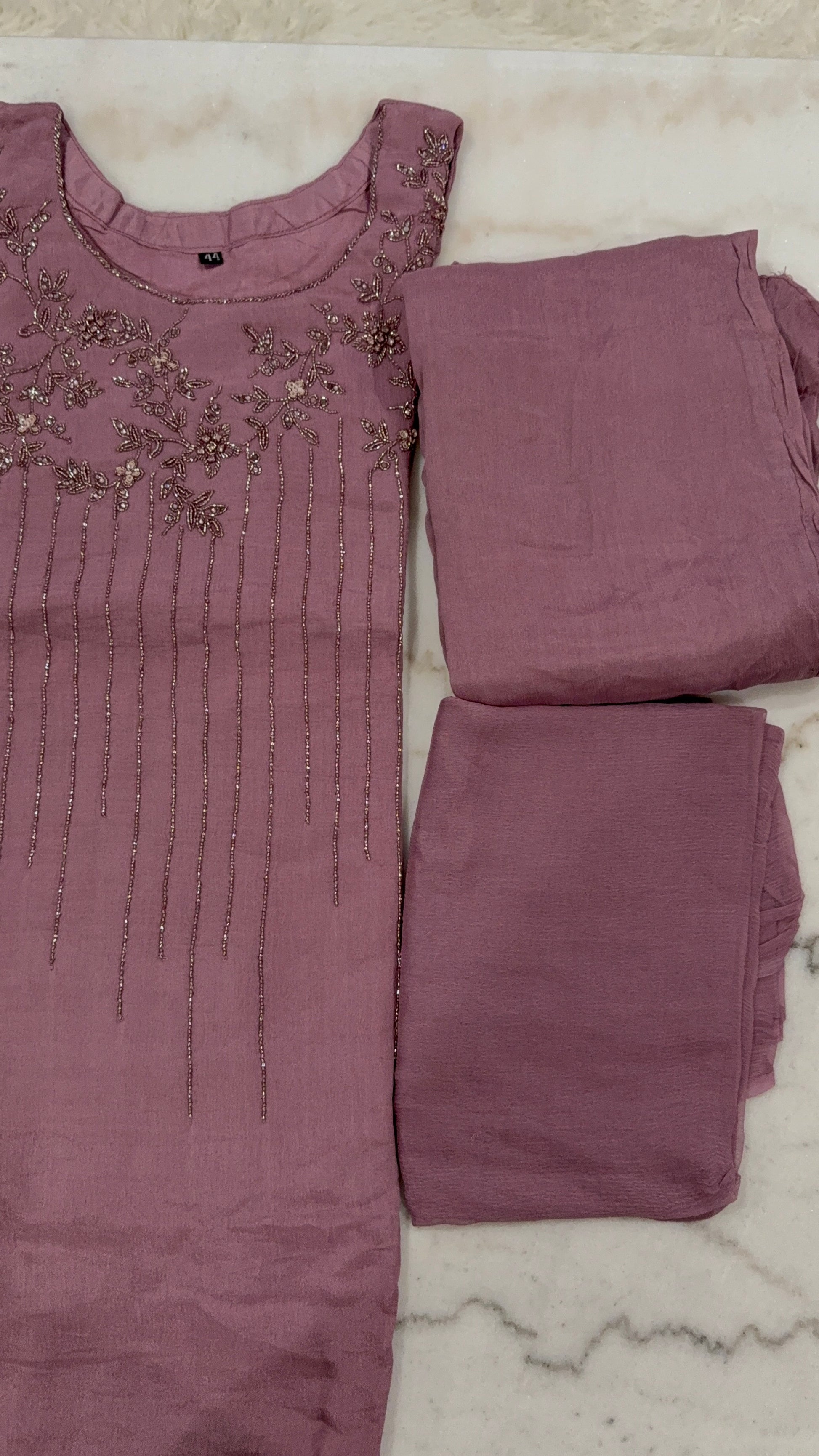 Refined elegance meets minimal charm in this mauve salwar suit, beautifully embellished with delicate piping and intricate bead embroidery on the neckline and yoke. Crafted from soft, breathable fabric, this set offers both comfort and grace—perfect for festive gatherings, office parties, or casual celebrations.