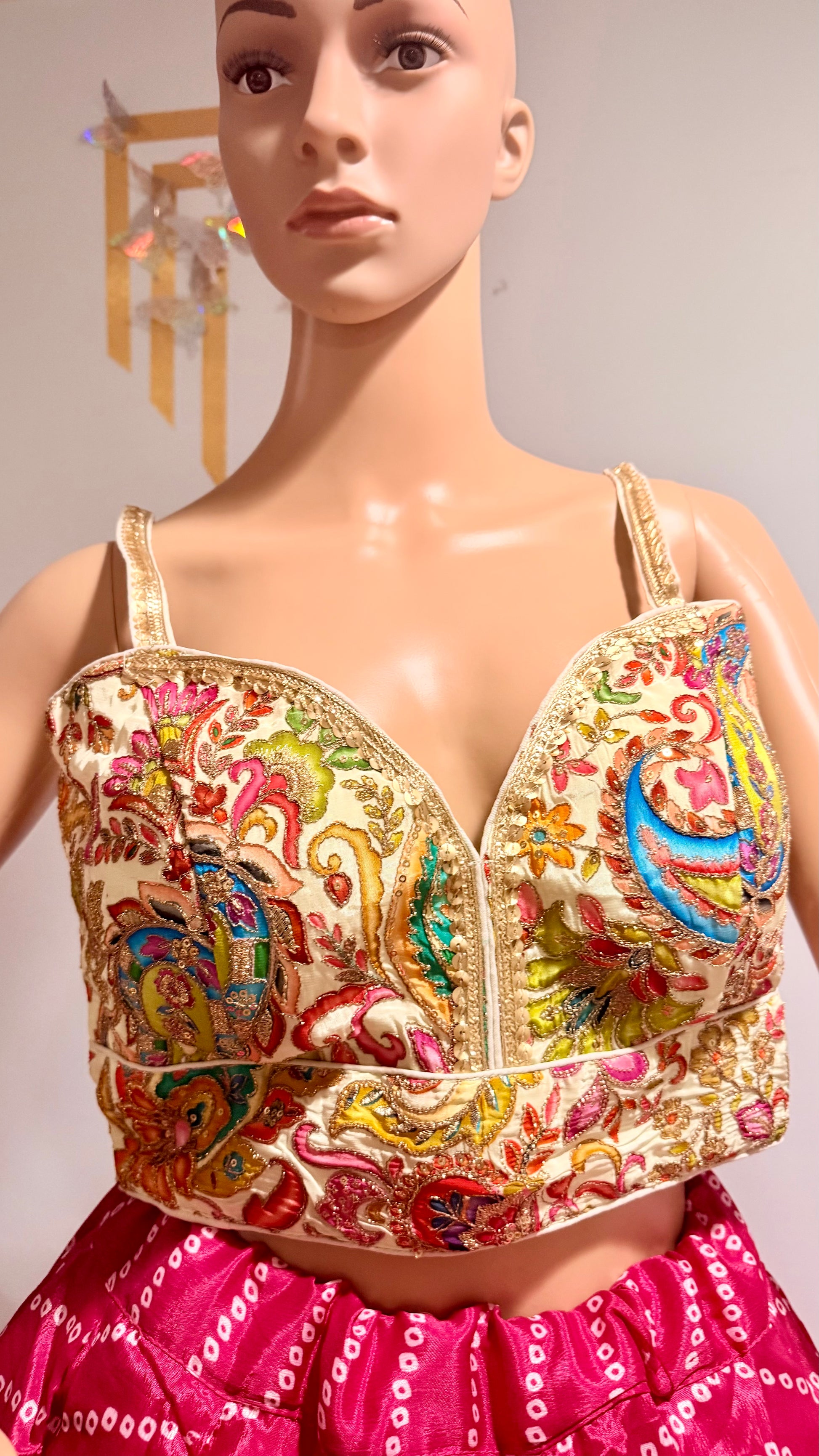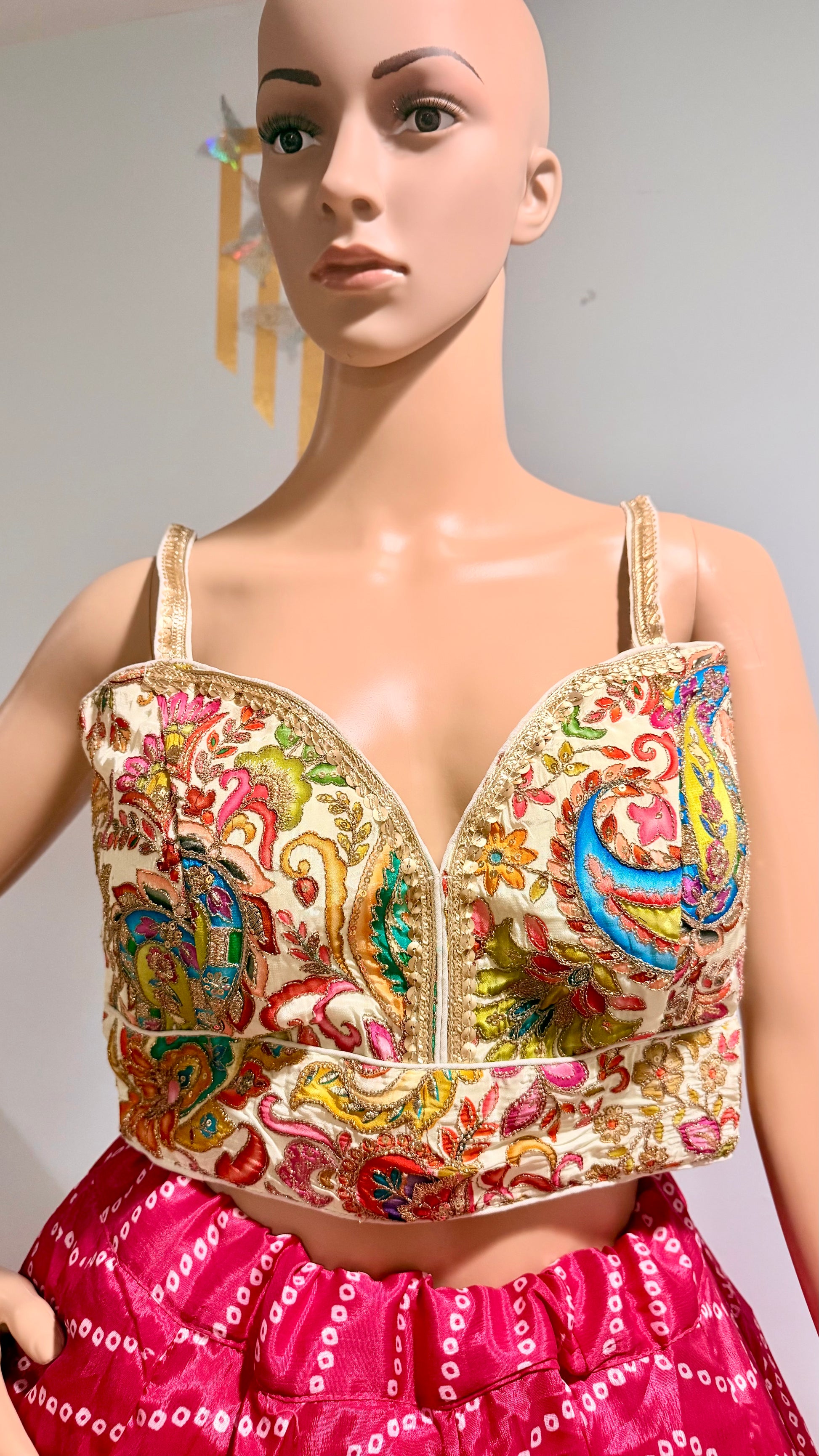 Skirt: Crafted in luxurious Roman silk with vibrant bandhani chevron patterns, finished with a broad golden gotta border for a regal touch.