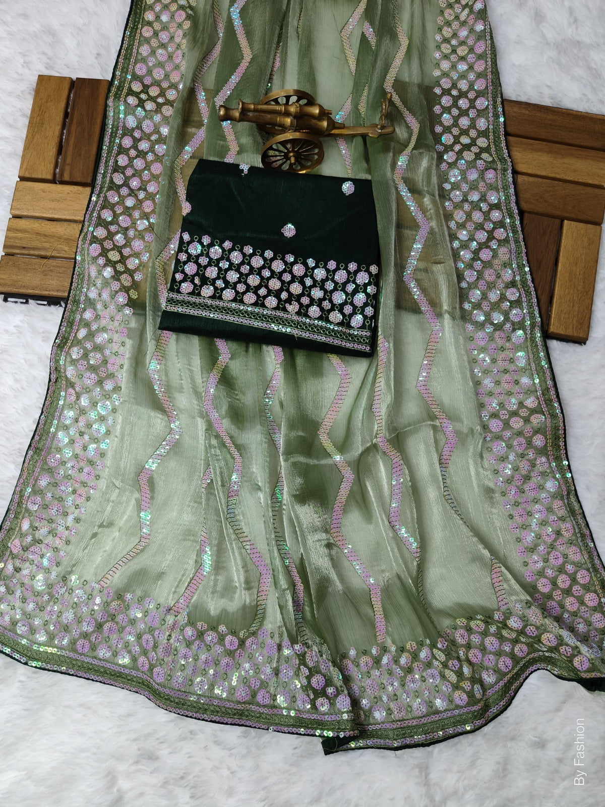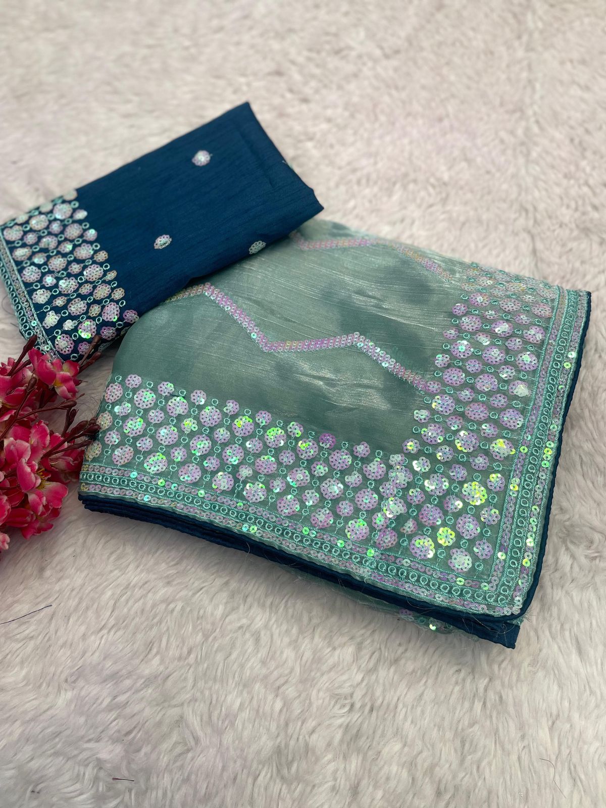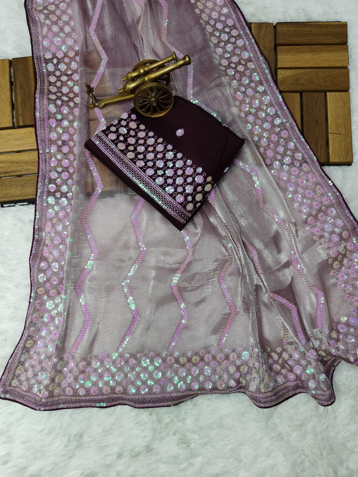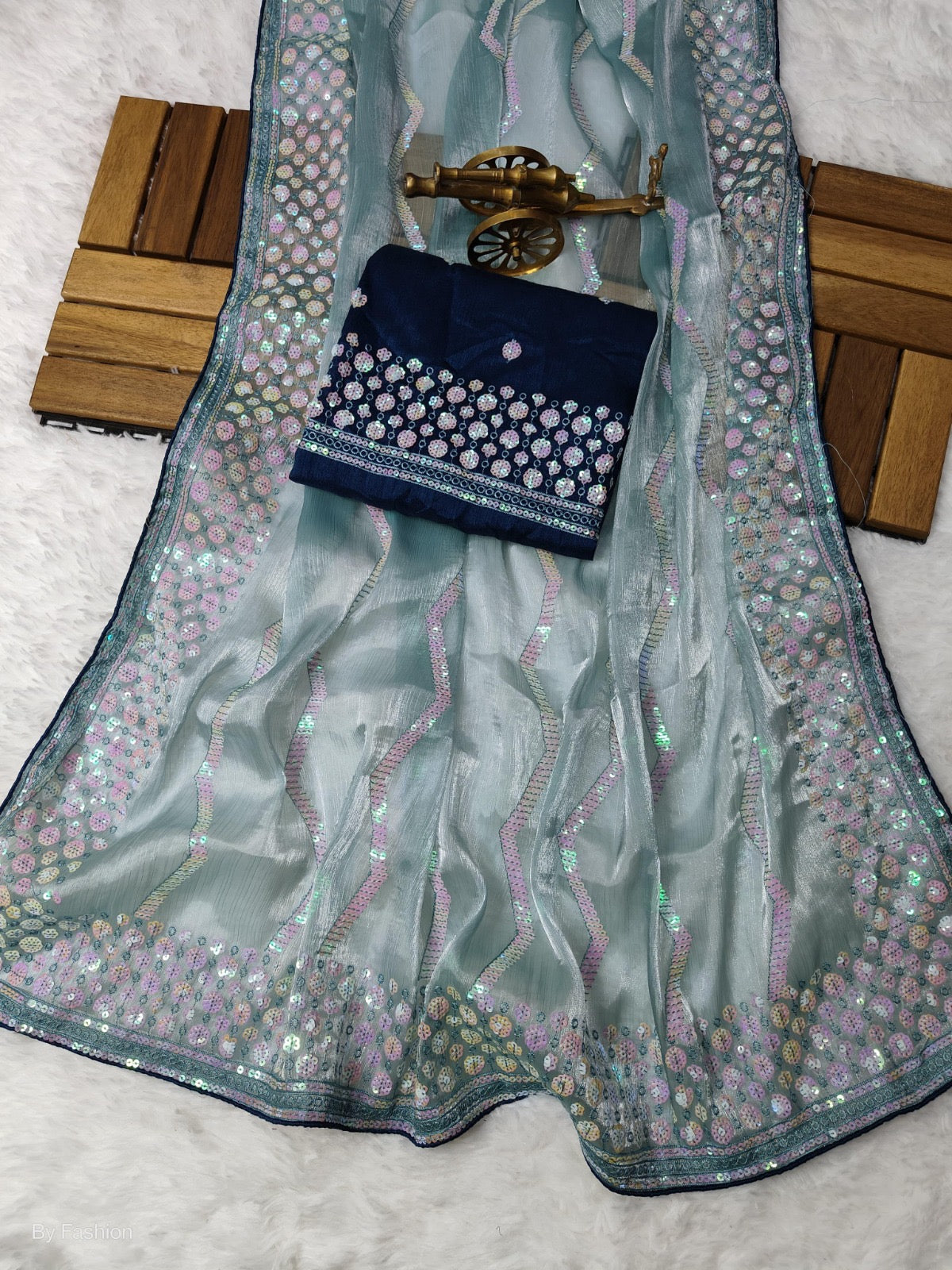 Drape yourself in ethereal elegance with our Tissue Fabric Saree, featuring soft shimmer net and intricate sequin floral embroidery. The lightweight tissue fabric gives a subtle shine, making it ideal for festive and formal wear.