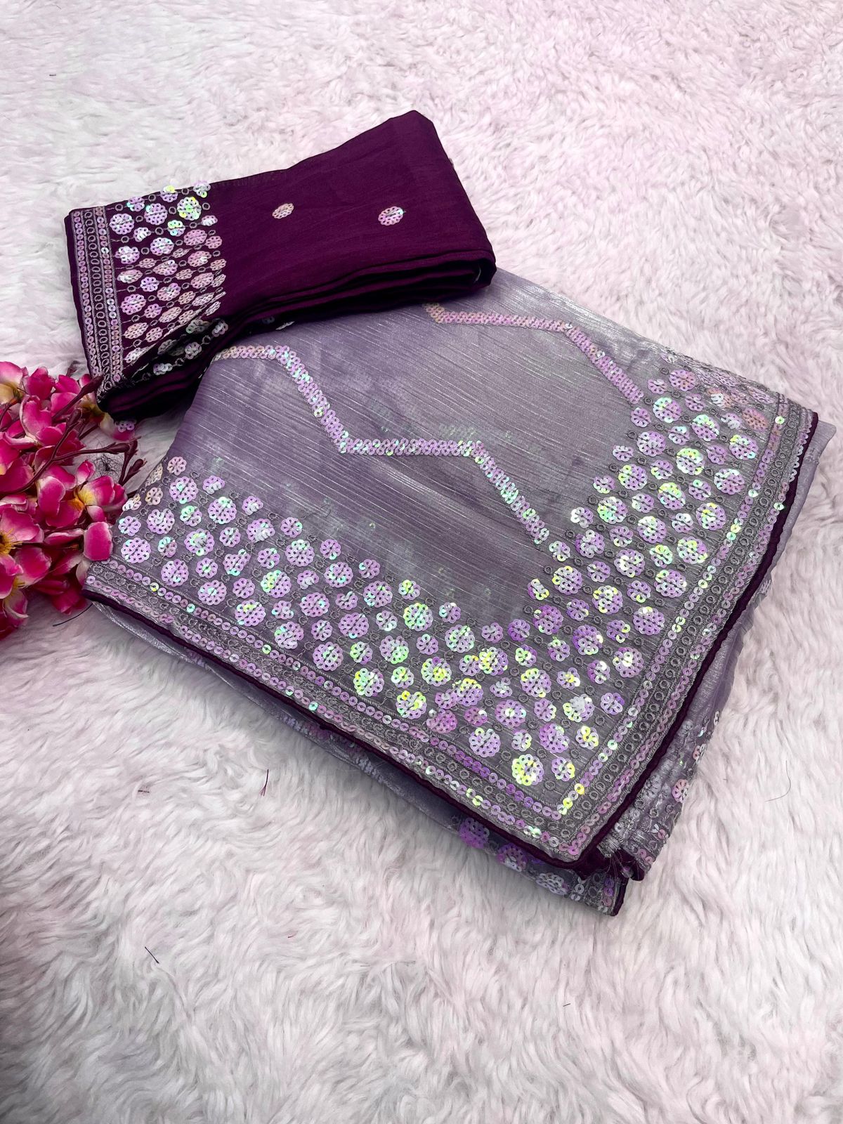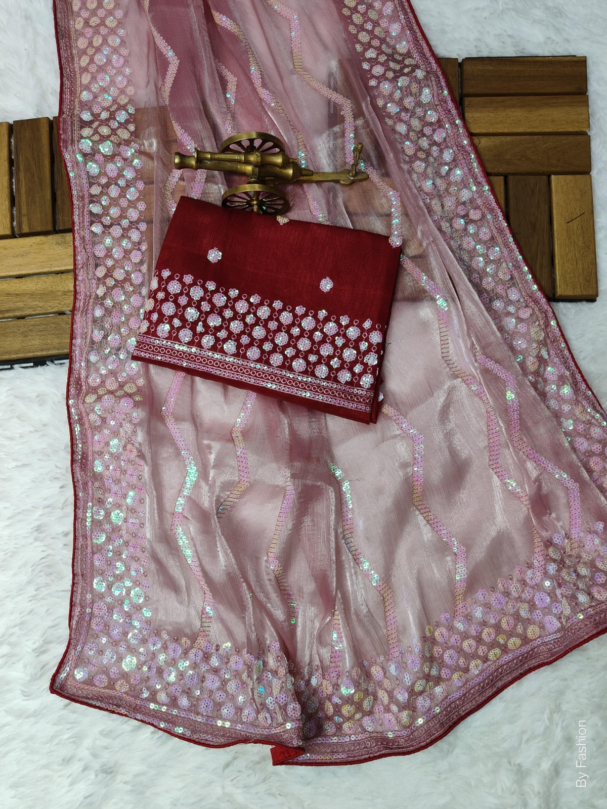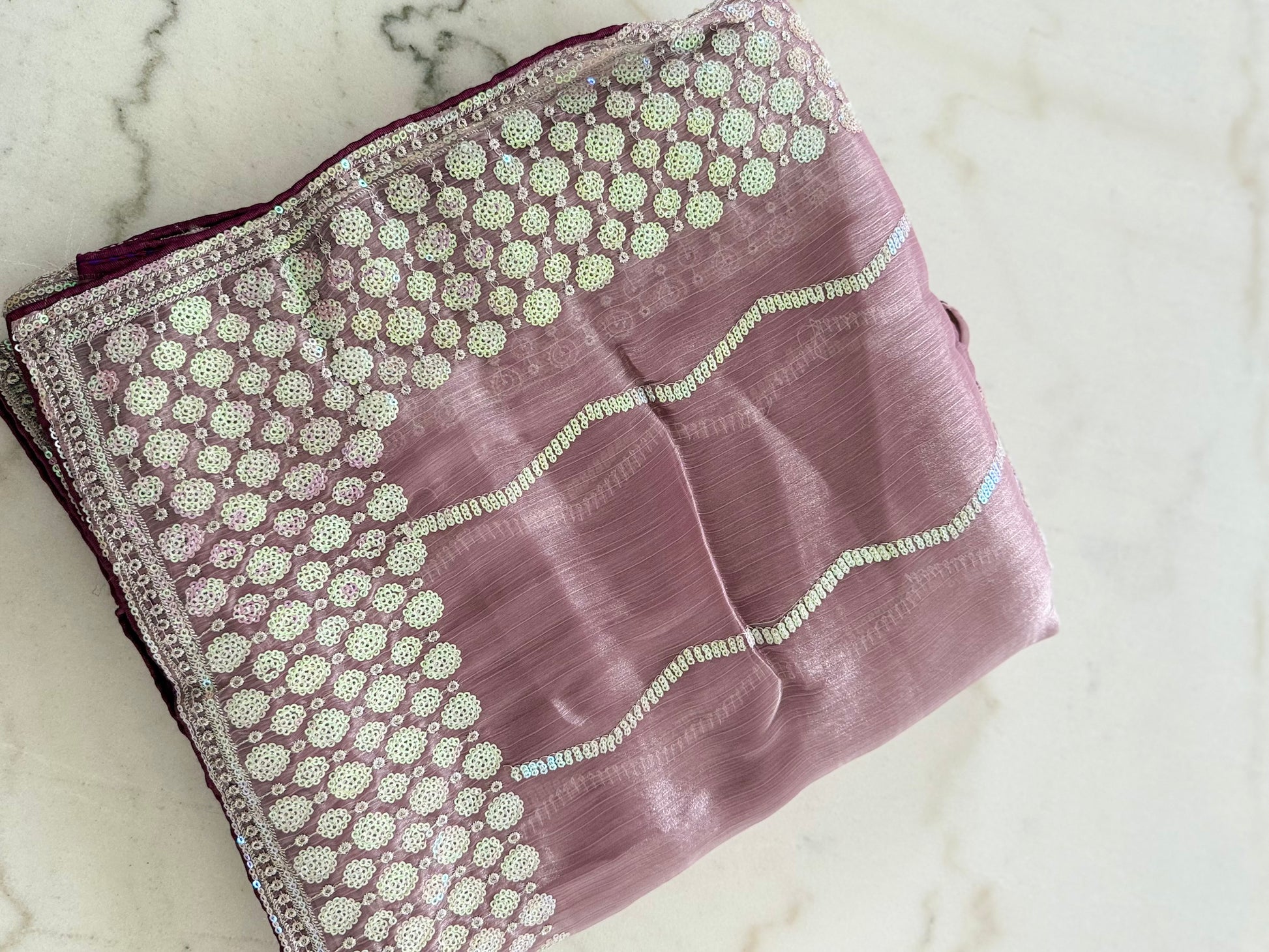 Drape yourself in ethereal elegance with our Tissue Fabric Saree, featuring soft shimmer net and intricate sequin floral embroidery. The lightweight tissue fabric gives a subtle shine, making it ideal for festive and formal wear.