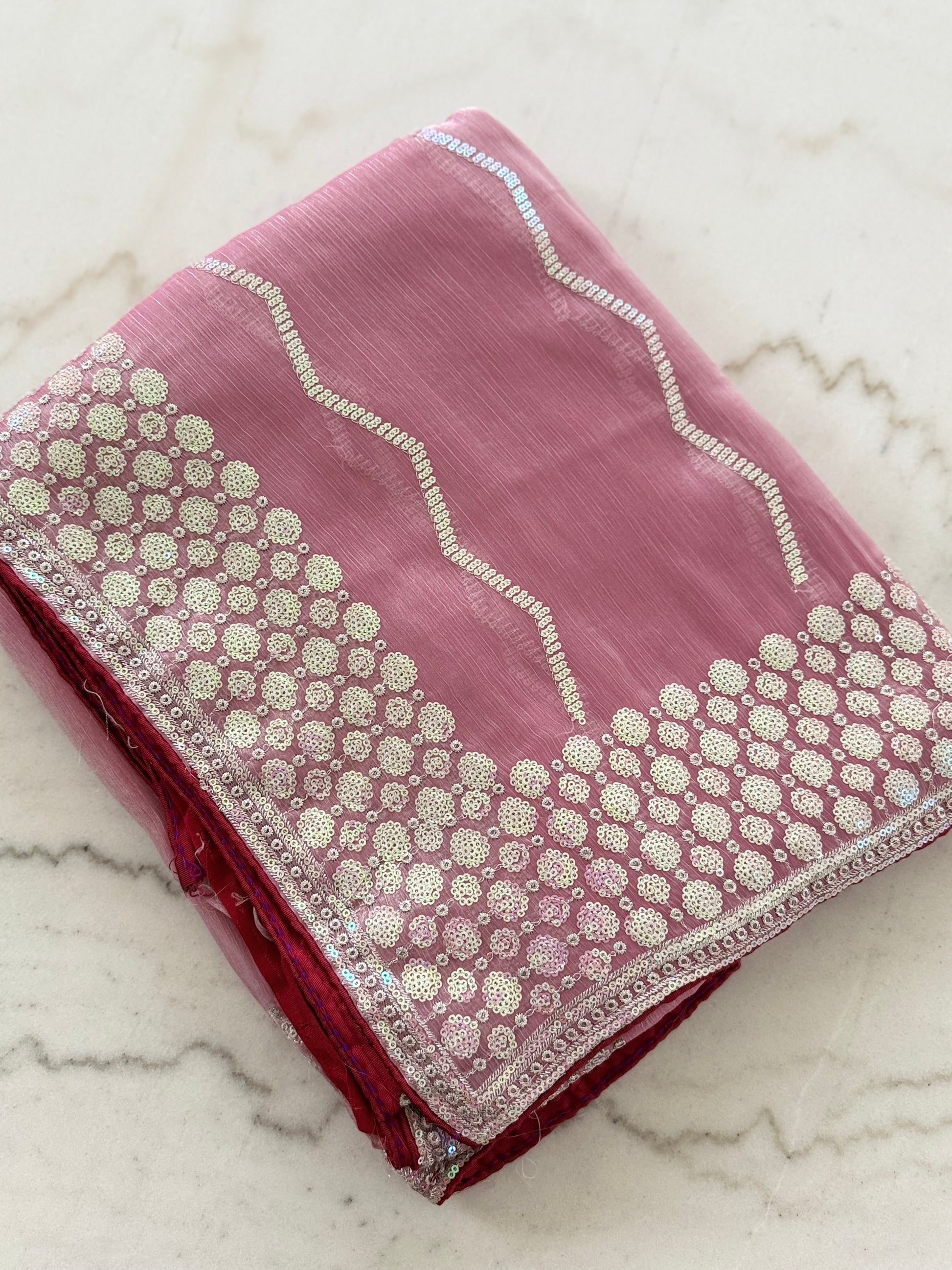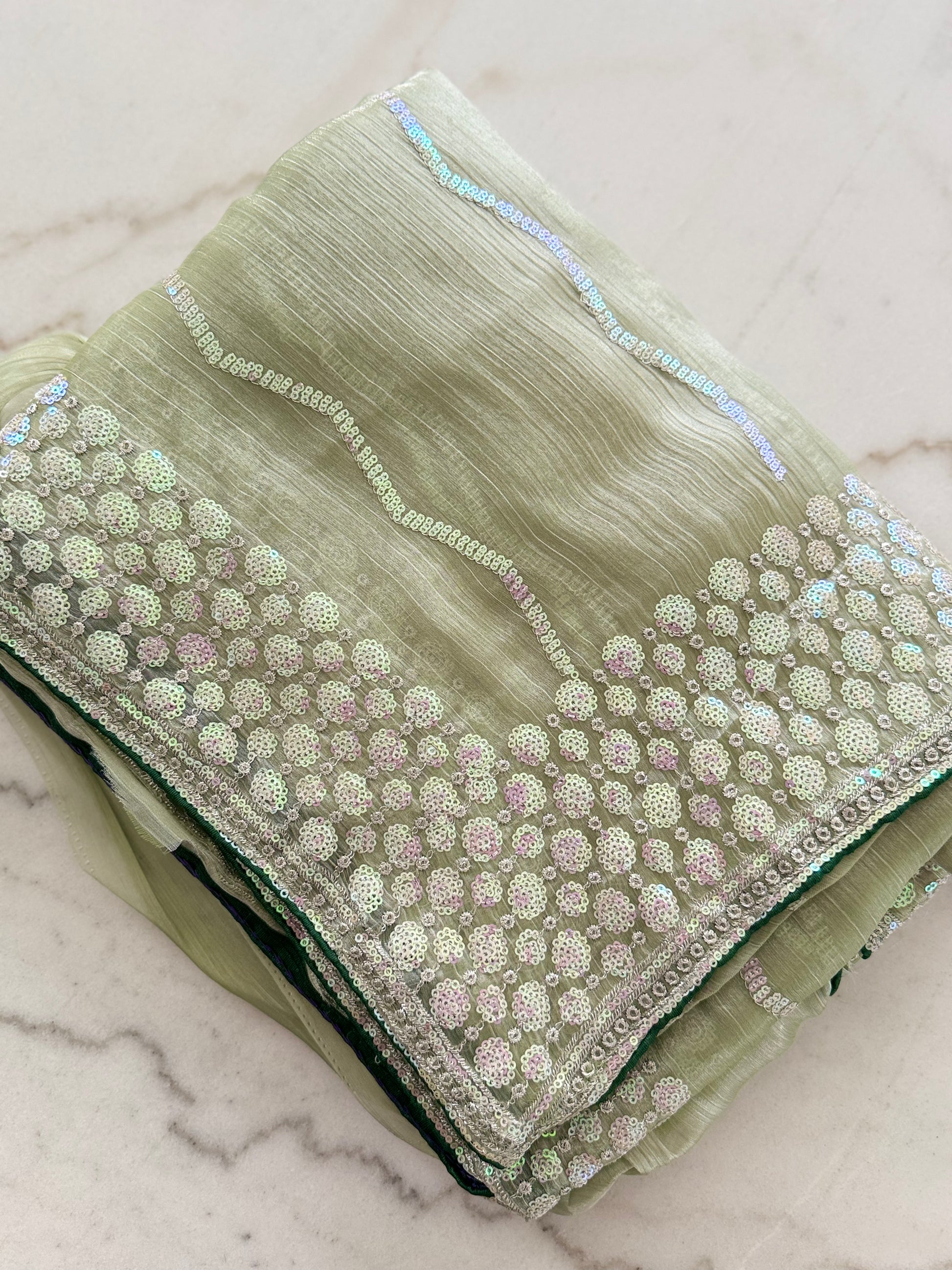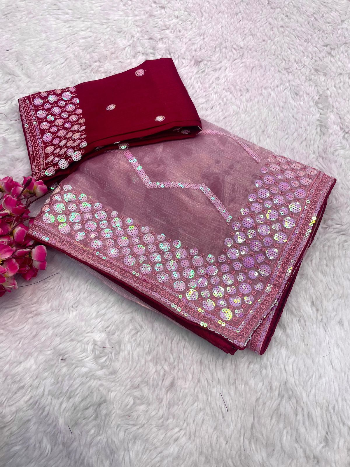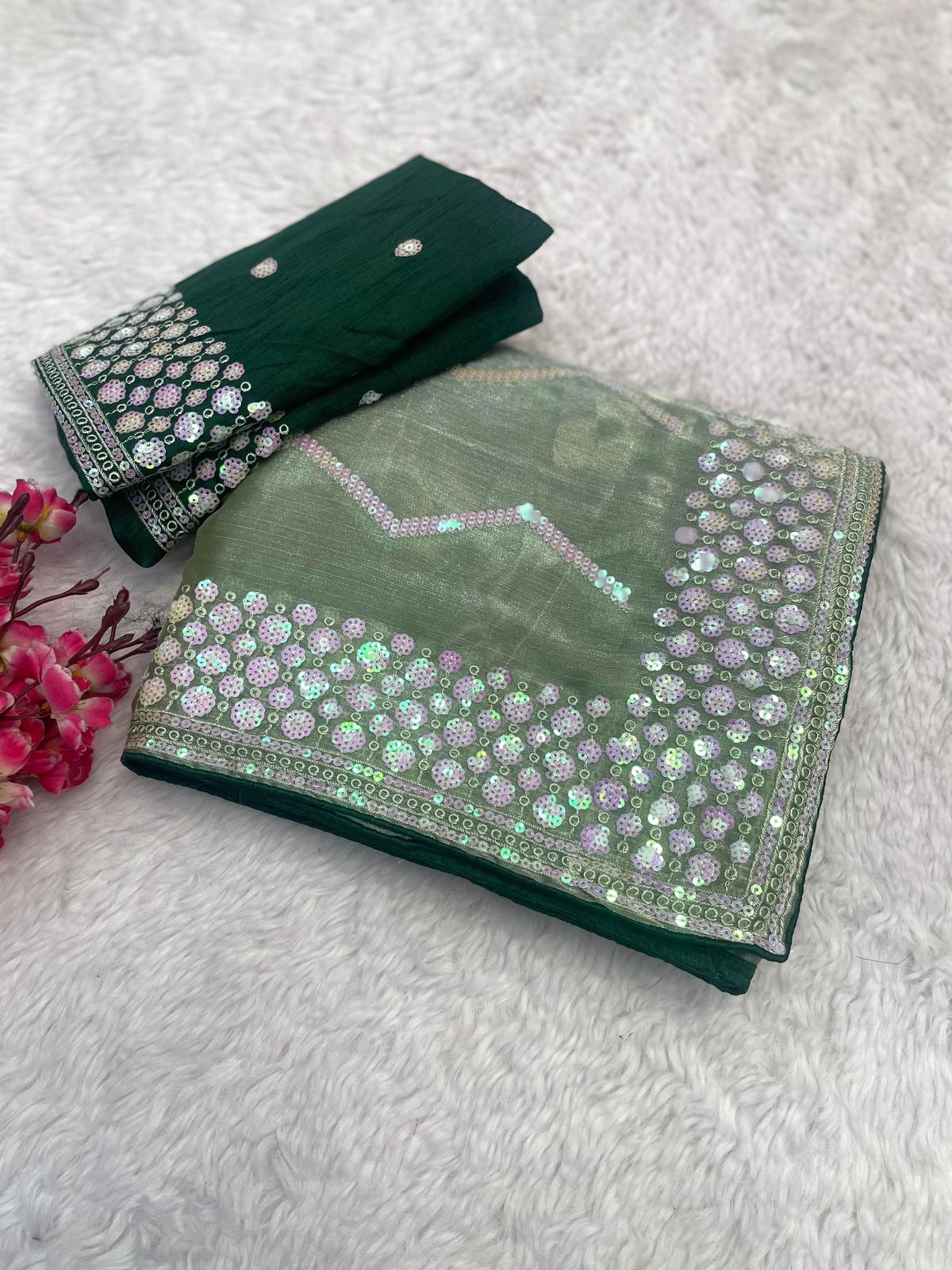 Drape yourself in ethereal elegance with our Tissue Fabric Saree, featuring soft shimmer net and intricate sequin floral embroidery. The lightweight tissue fabric gives a subtle shine, making it ideal for festive and formal wear.