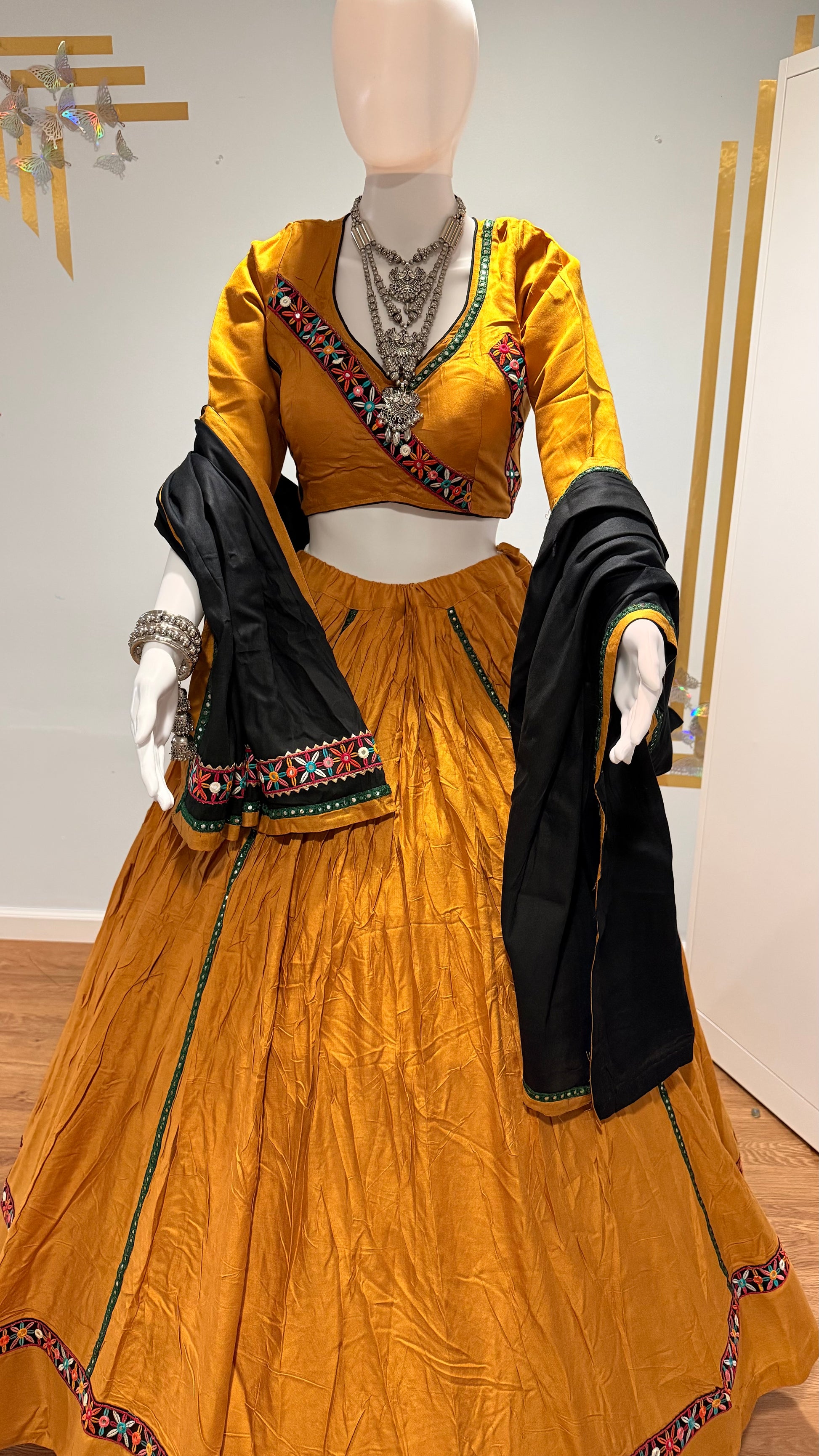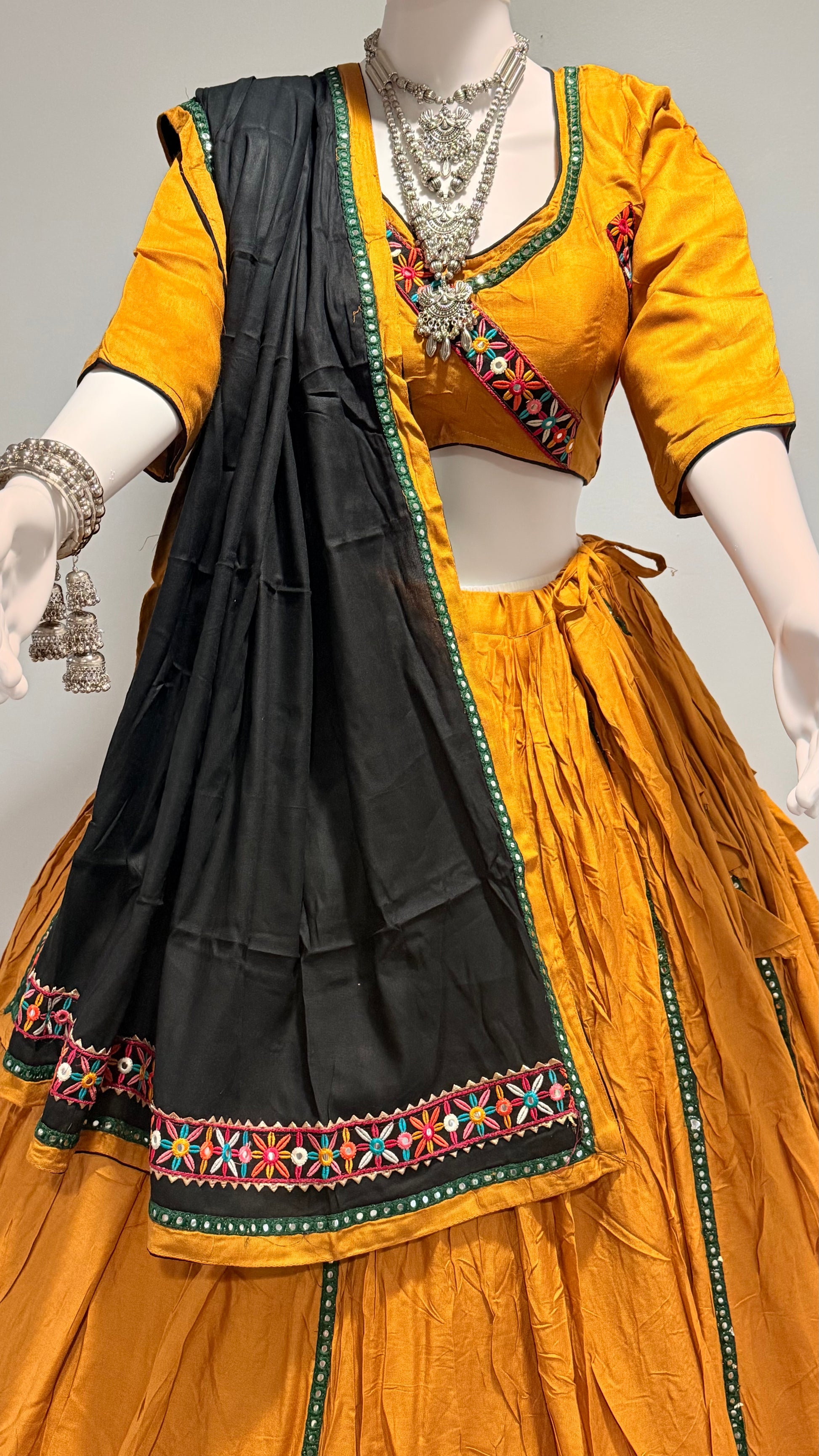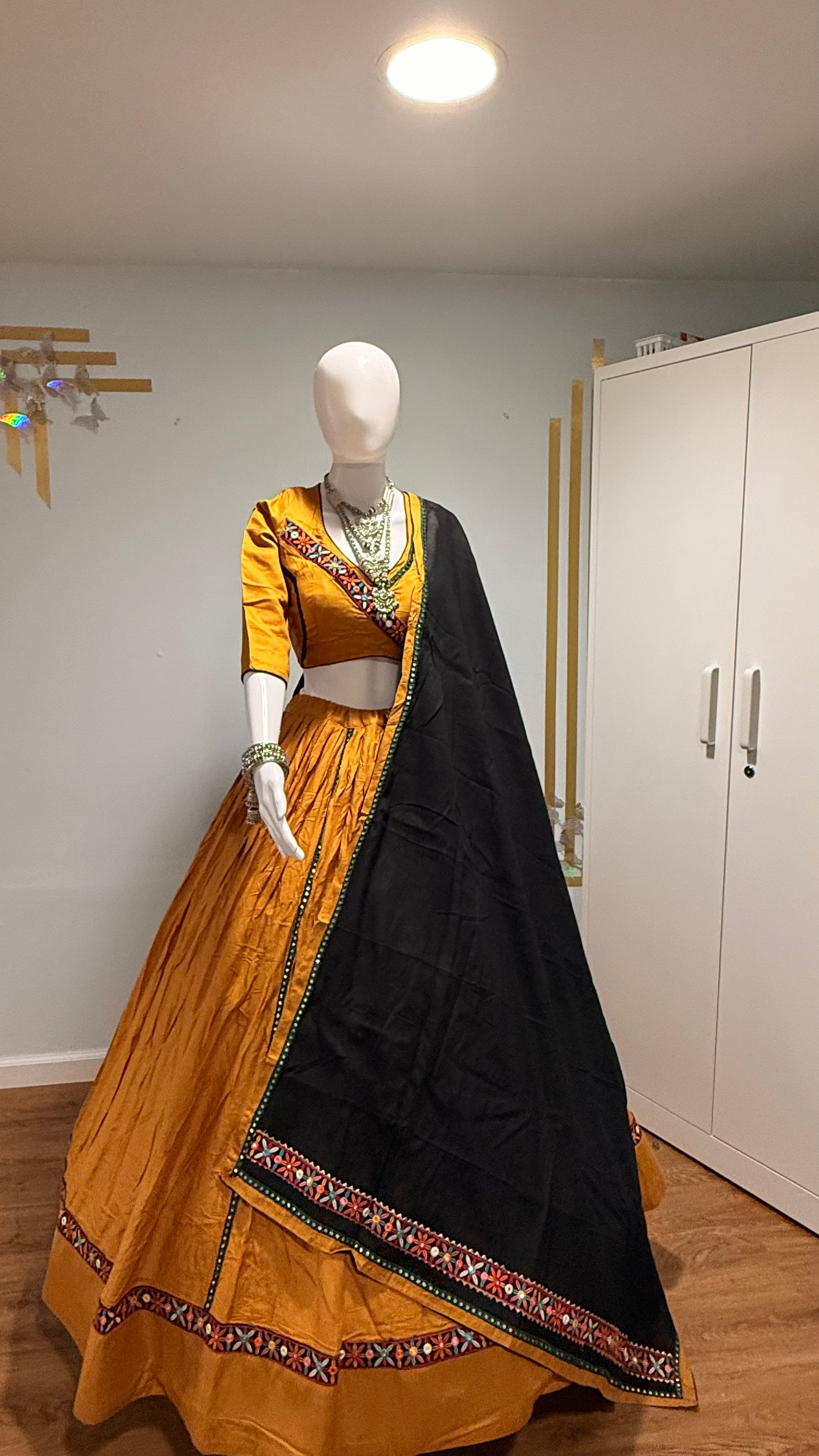 Mustard Chaniya Choli with Black Dupatta, crafted in premium rayon cotton fabric and adorned with traditional mirror embroidery and gamthi work. Perfect for Navratri, Garba nights, weddings, and festive occasions, this outfit combines comfort with timeless ethnic beauty.
