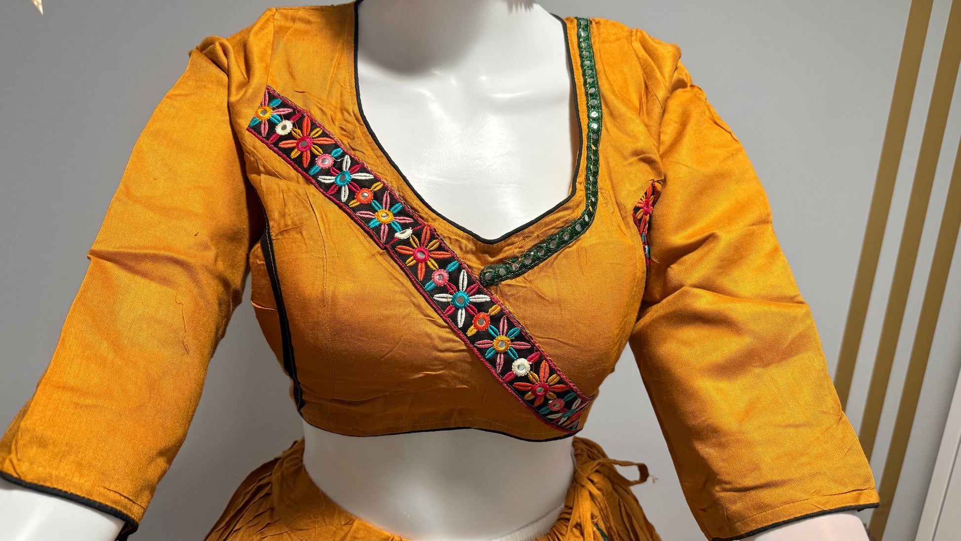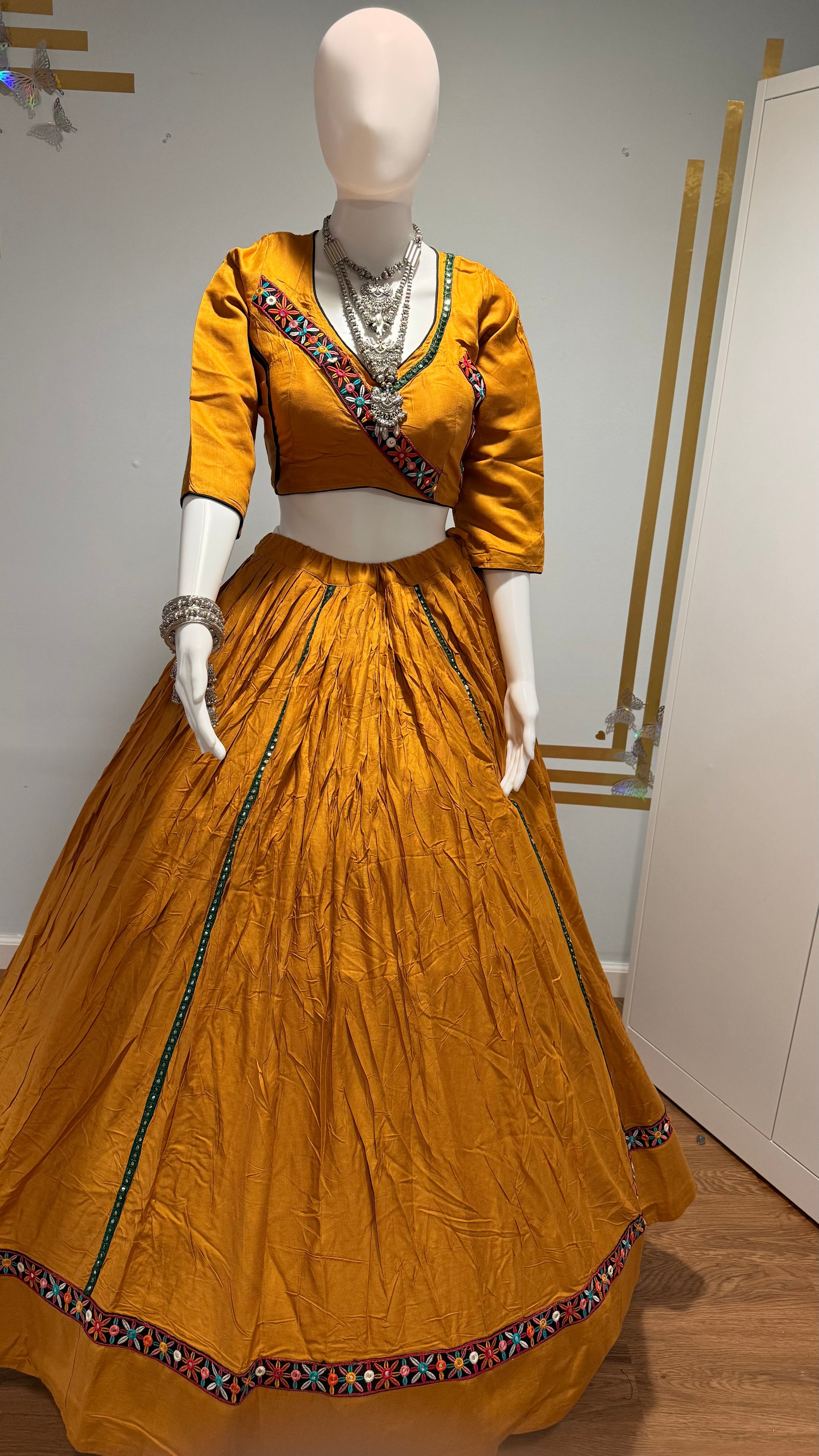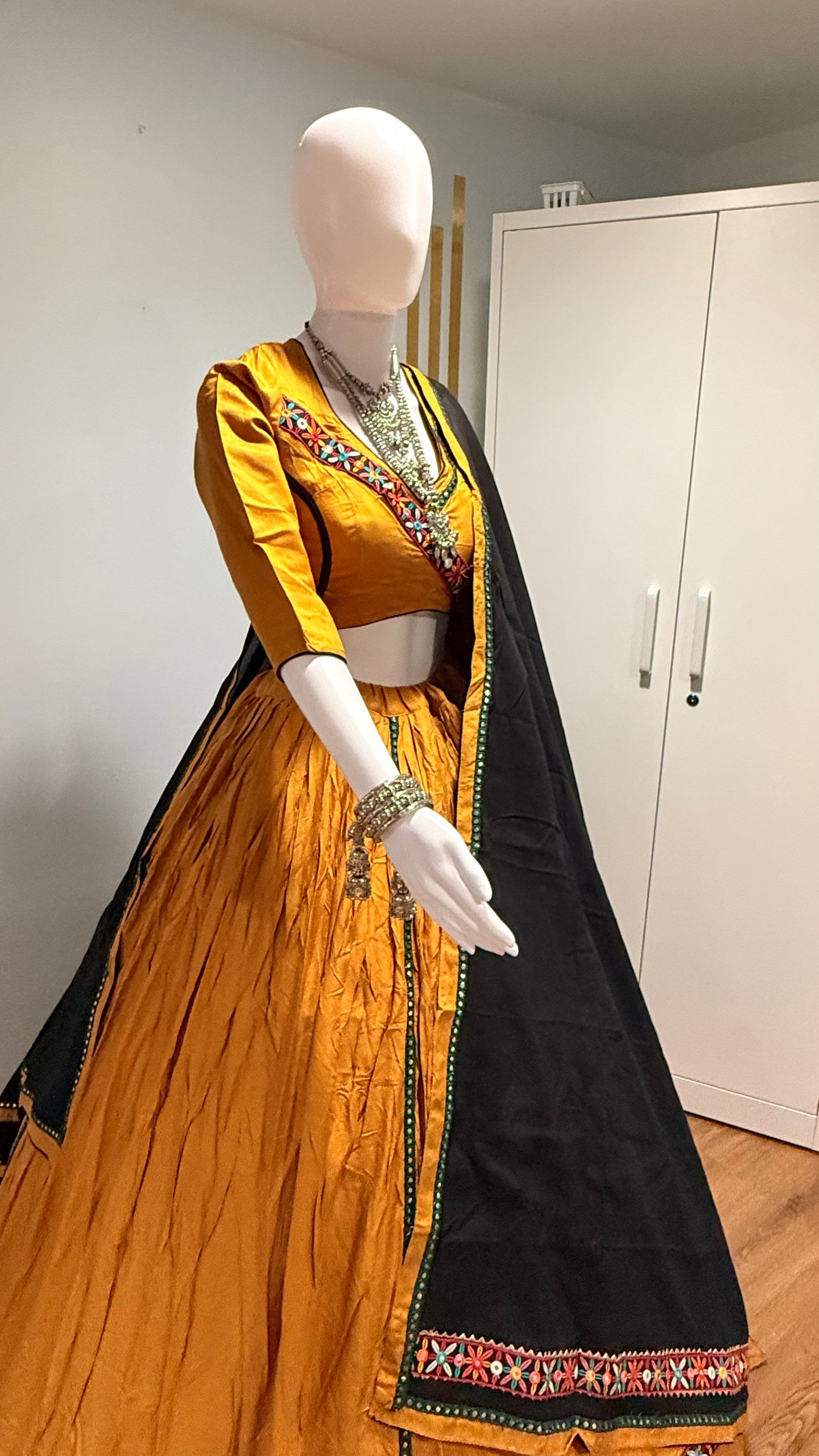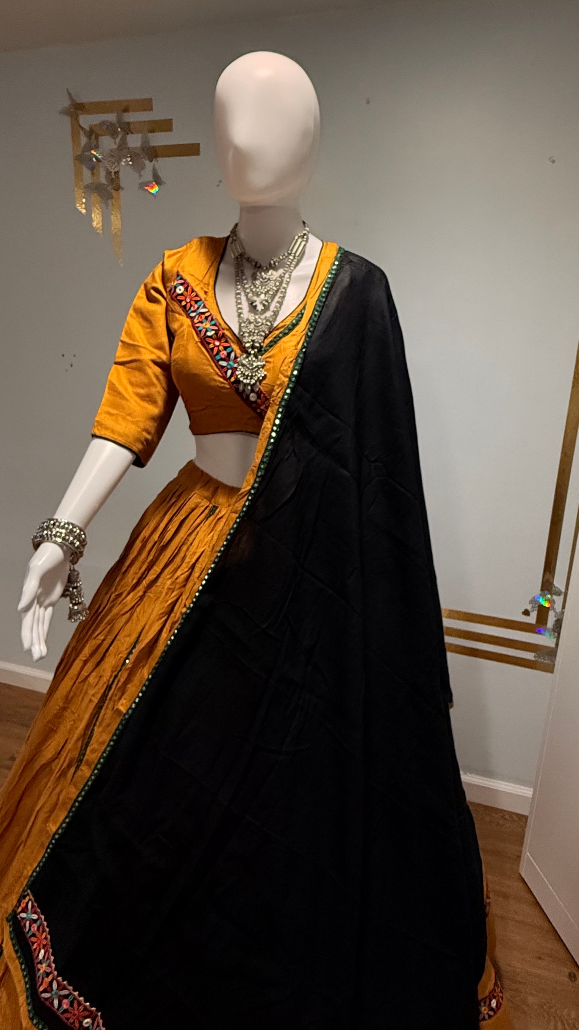 Mustard Chaniya Choli with Black Dupatta, crafted in premium rayon cotton fabric and adorned with traditional mirror embroidery and gamthi work. Perfect for Navratri, Garba nights, weddings, and festive occasions, this outfit combines comfort with timeless ethnic beauty.