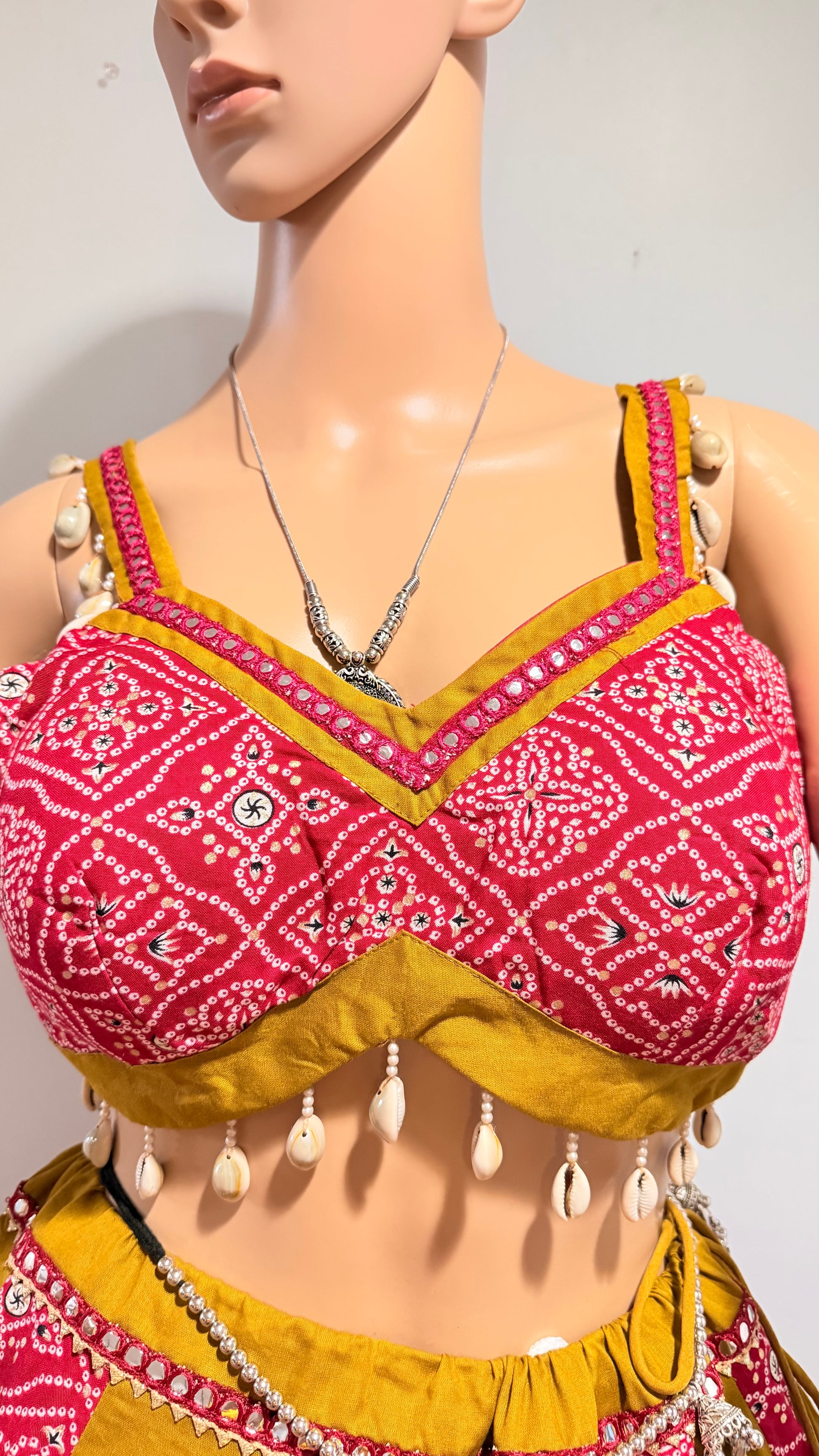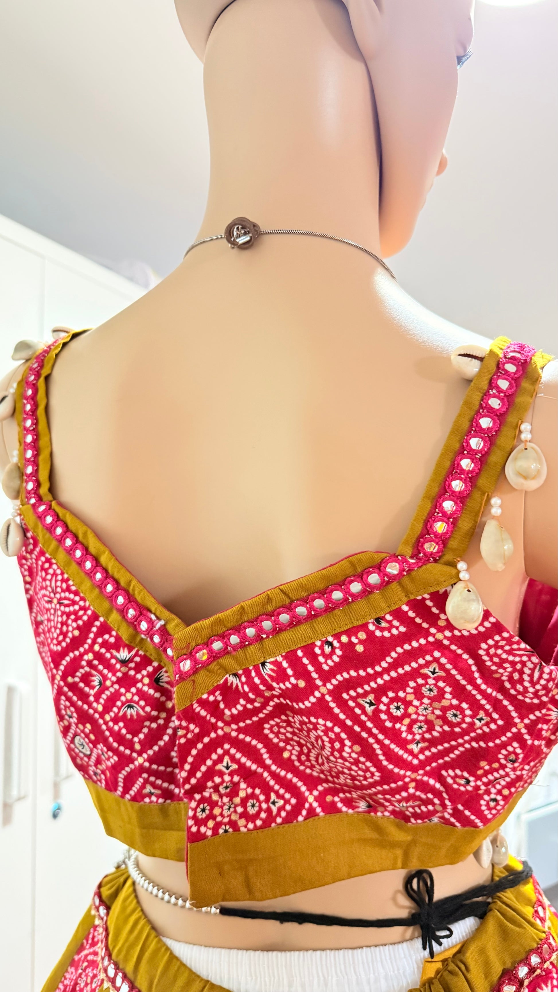 - 🌸 Choli: Beautiful pink Bandhani print blouse with delicate detailing & tassels