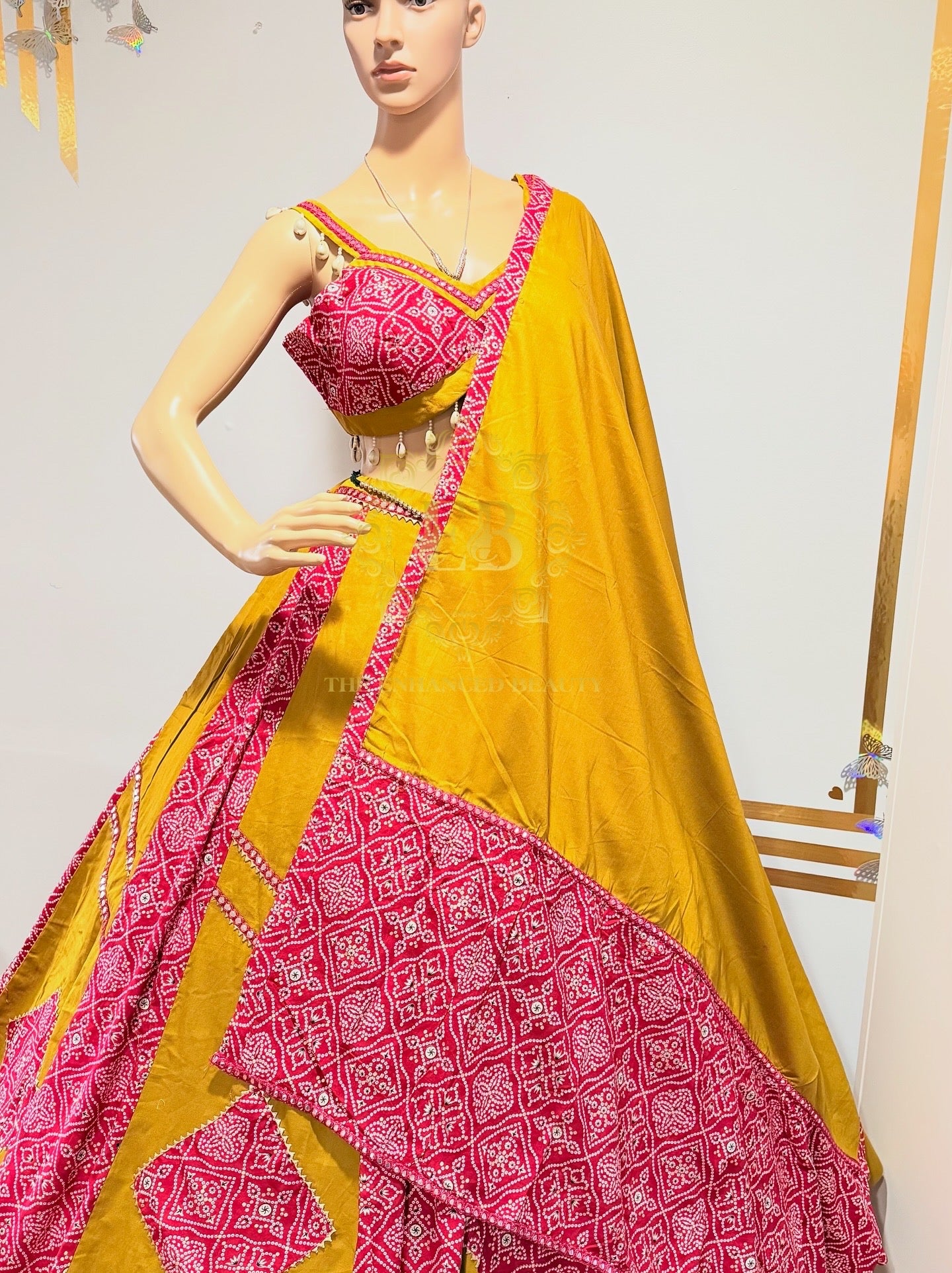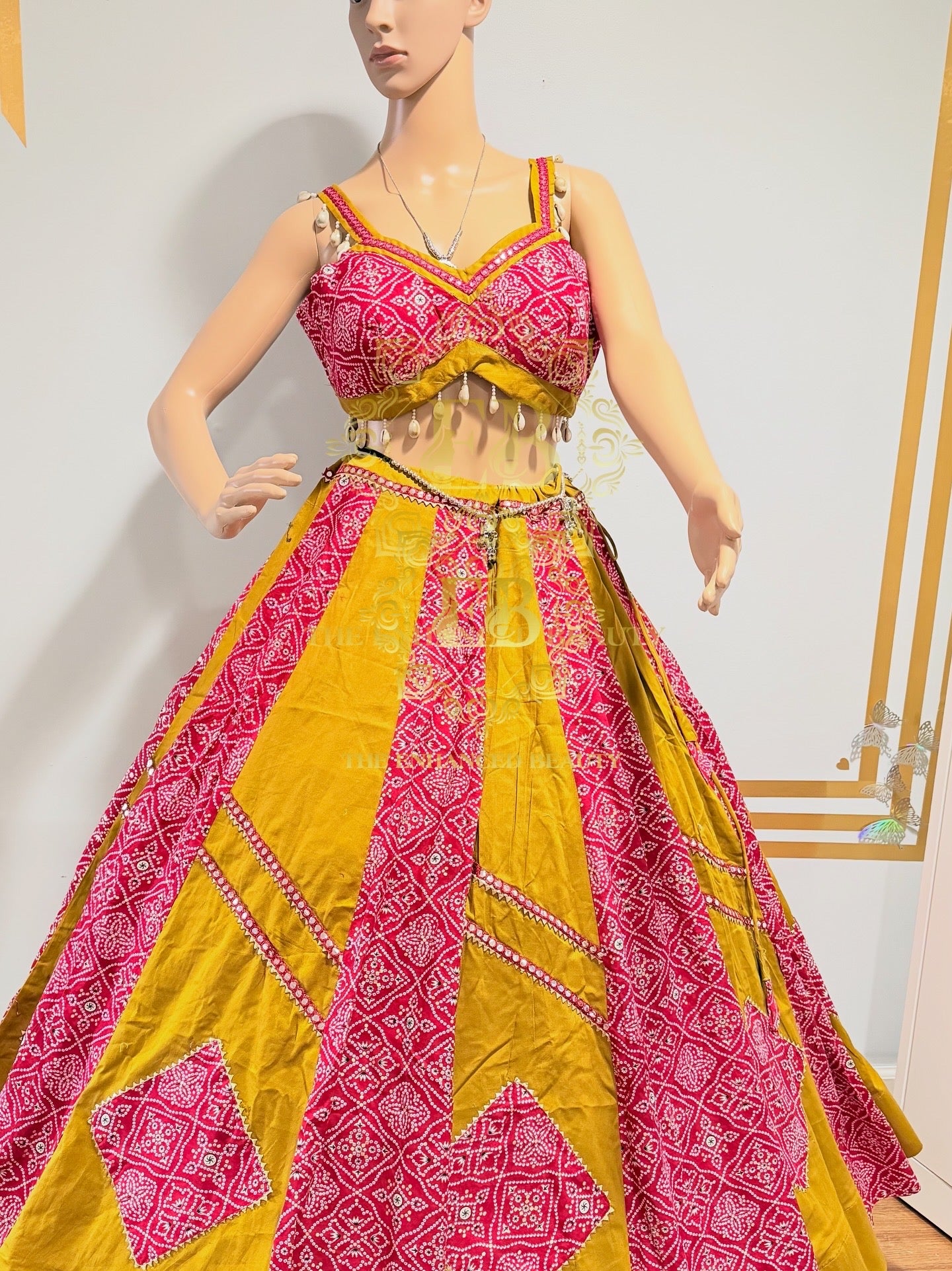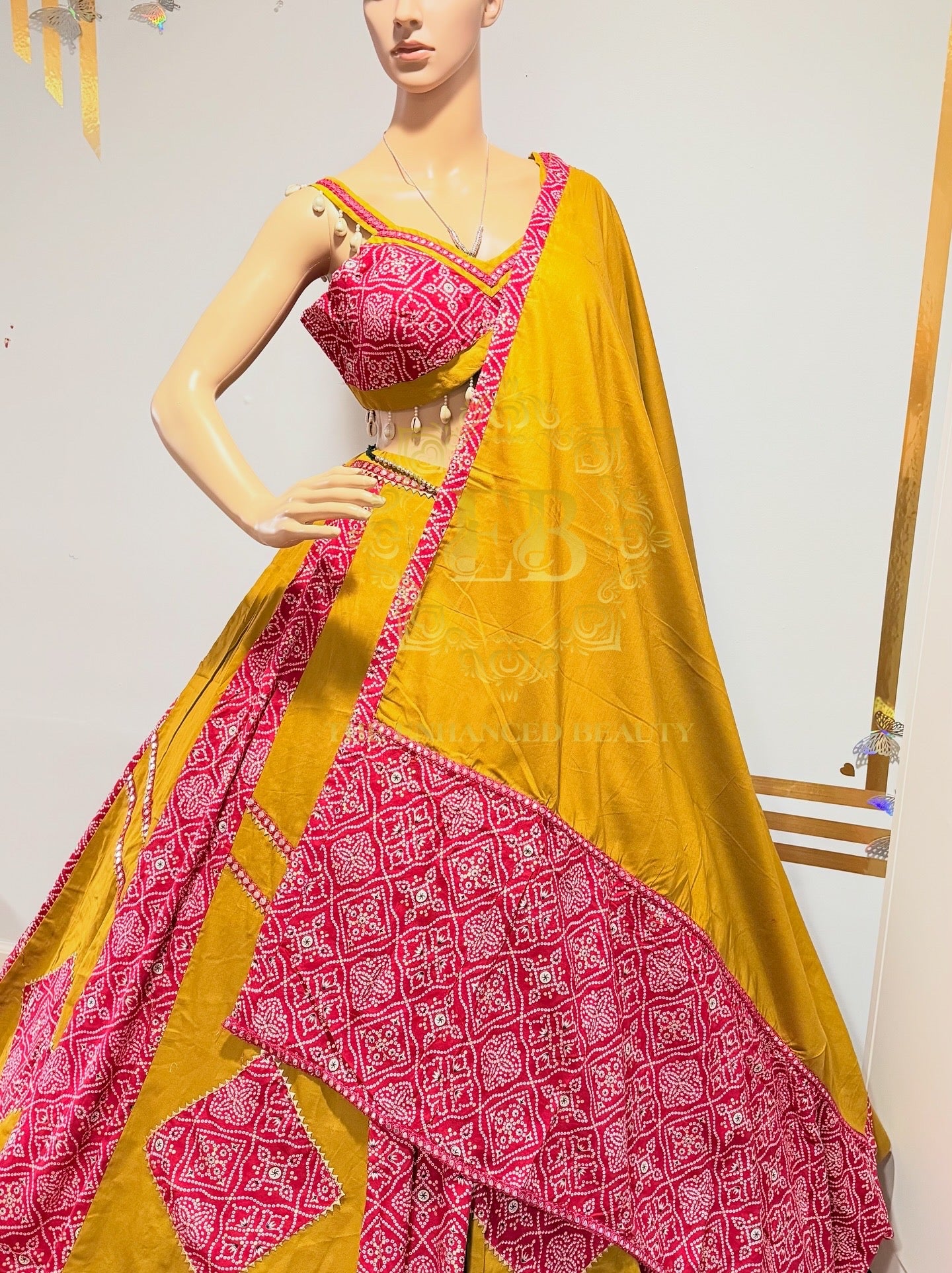 - 🌸 Lehenga: Mustard yellow base with contrasting Bandhani patchwork, 8-meter flair for a graceful twirl