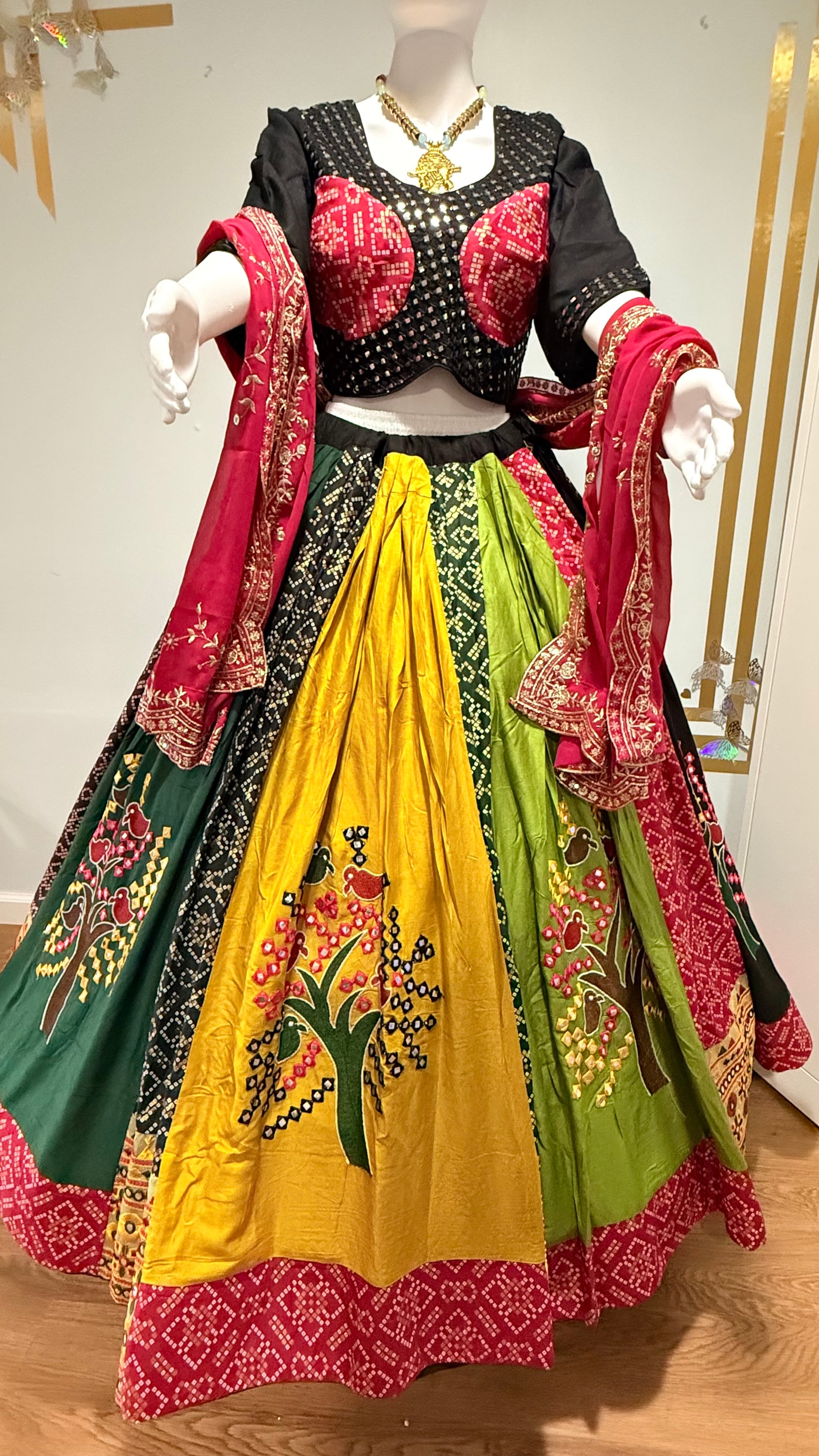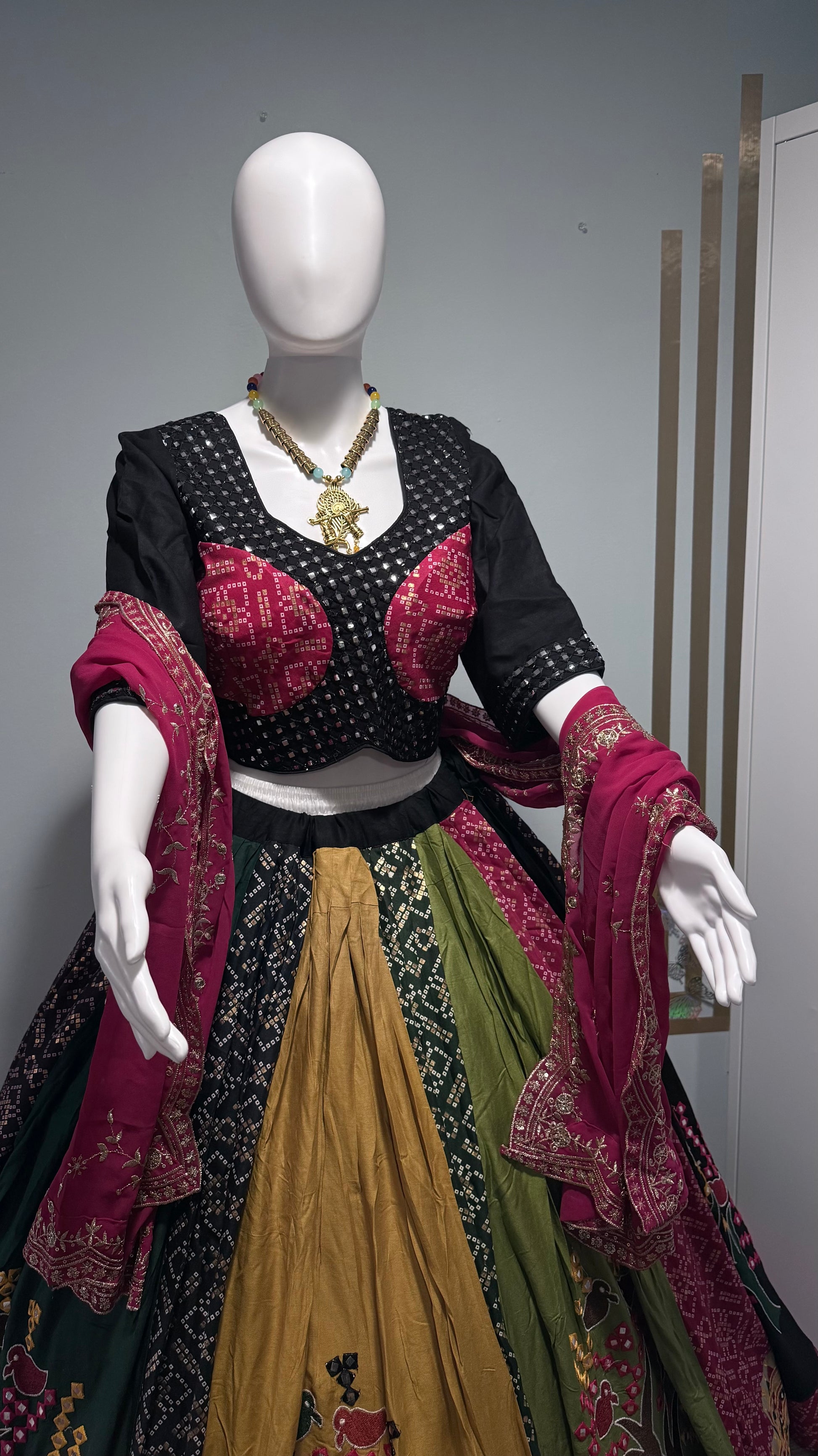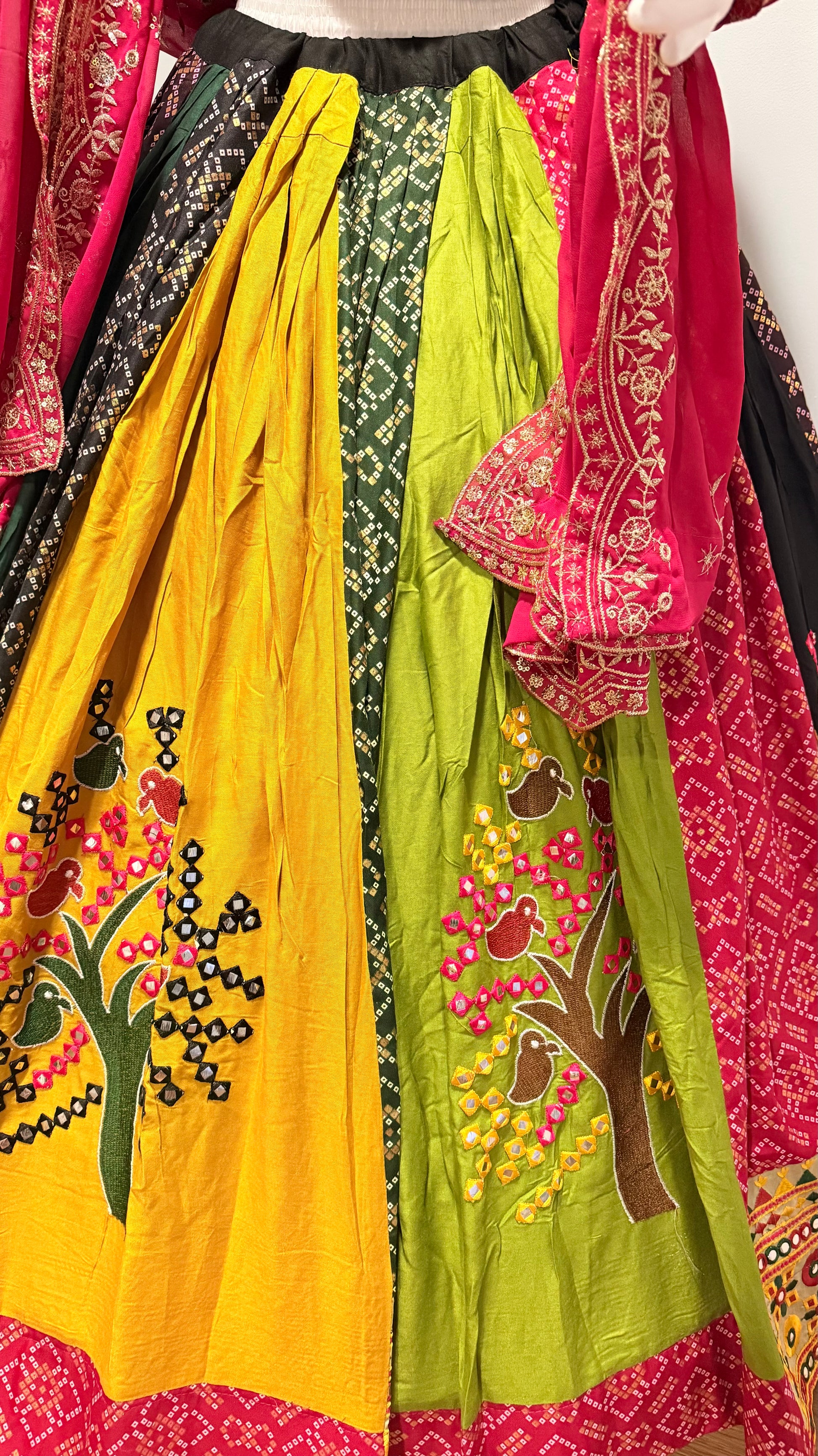 Bring festive elegance to your look with this vibrant Original Gaji Modal Chaniya Choli. Featuring exquisite tree embroidery, traditional bandhani print, and mirror work blouse, this masterpiece is perfect for Navratri, weddings, and festive occasions.