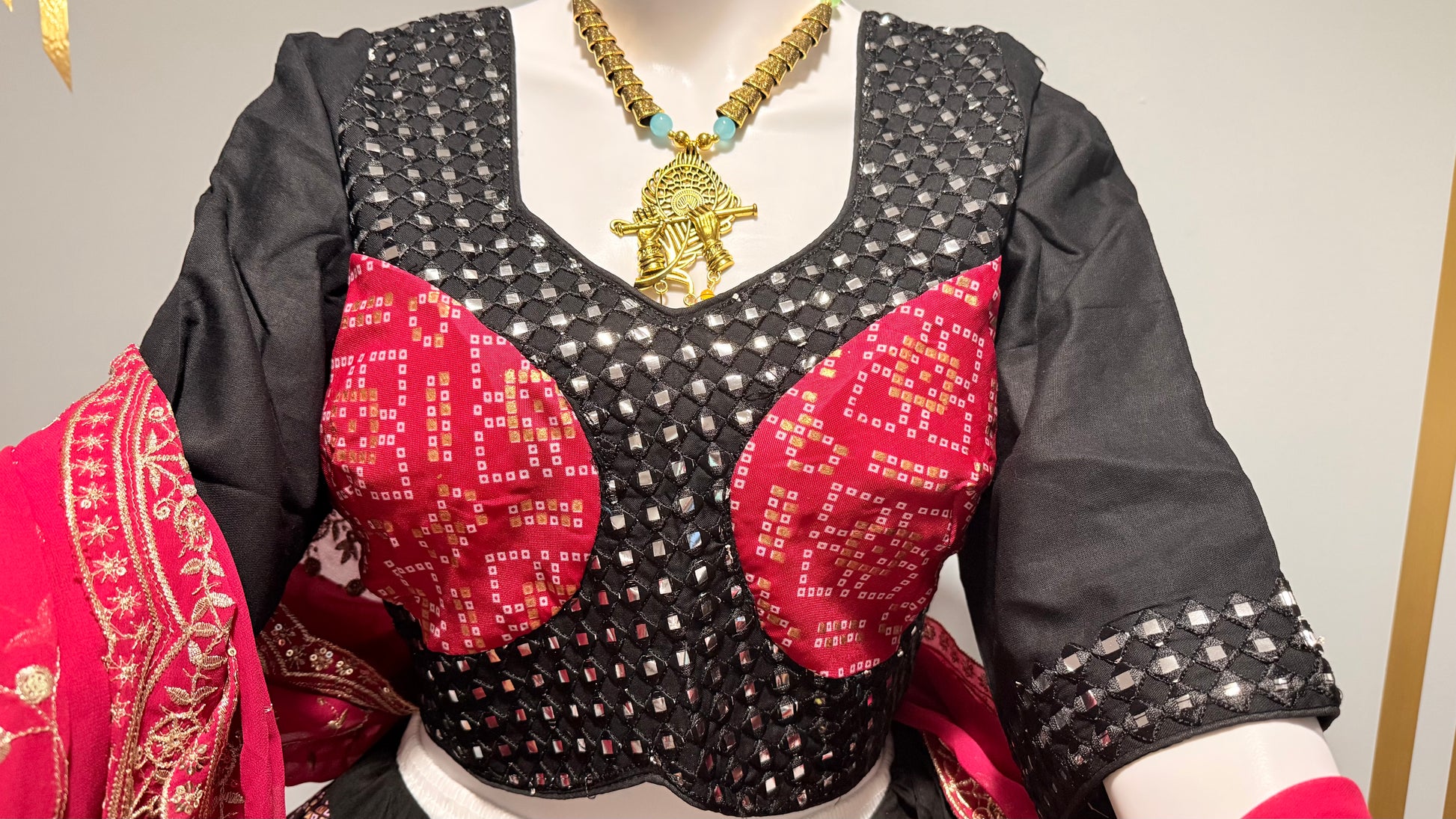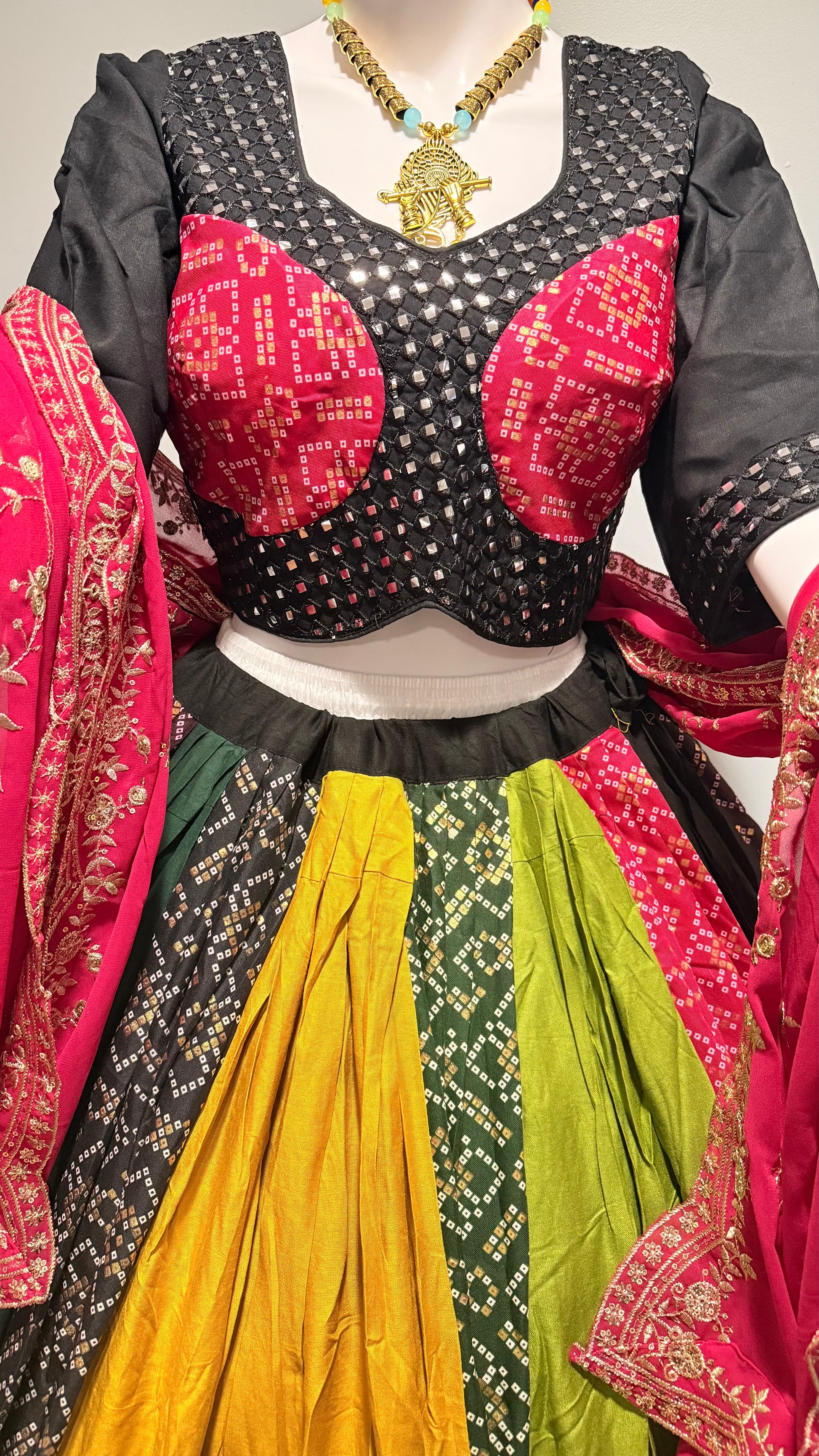 - Skirt: L size with heavy crepe lining, 8 mtr flare, deep pink bandhani border