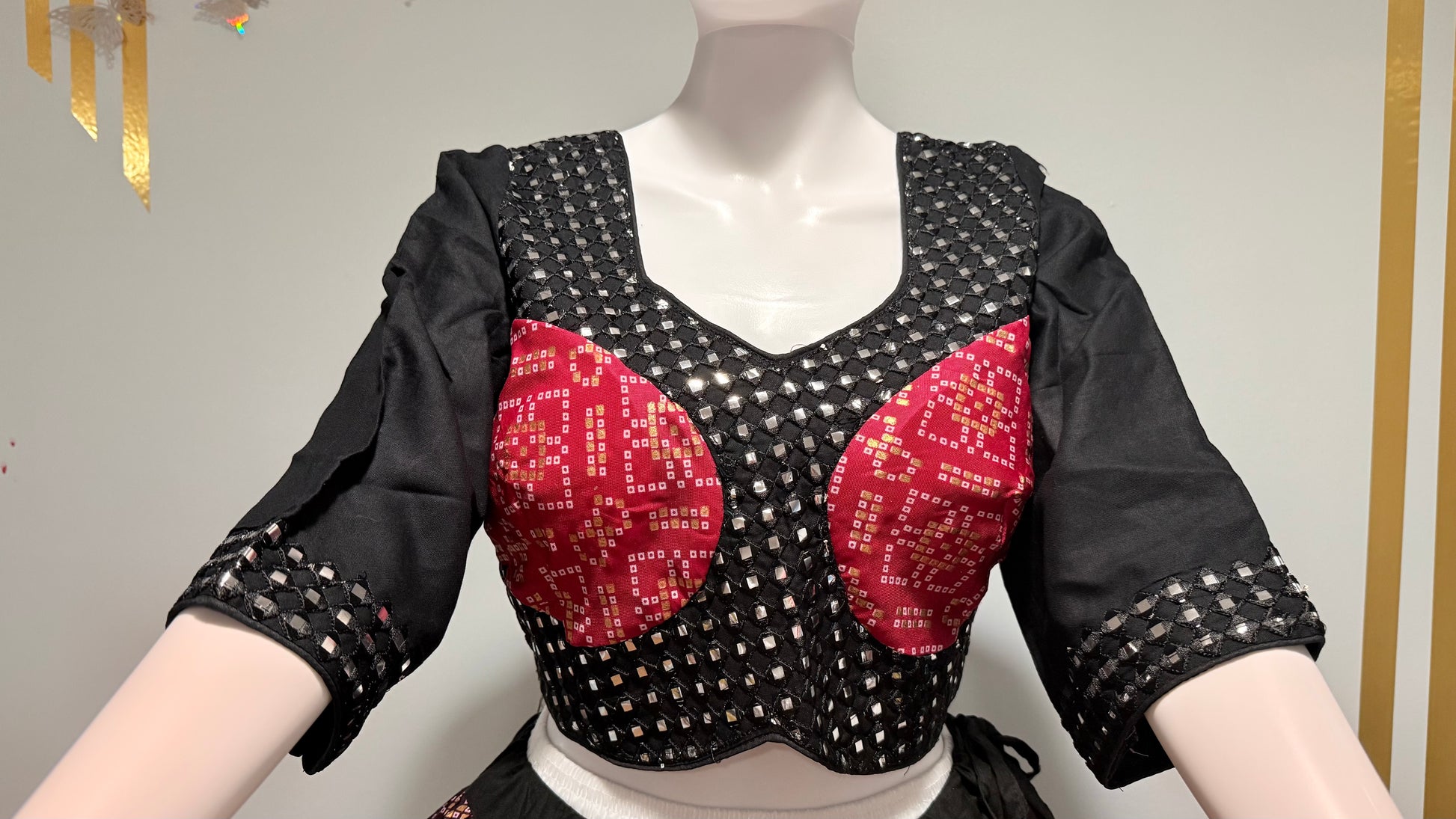 - Blouse: Full stitched, L size with margin (32”-44”), 3/4 sleeves, mirror work, padded with heavy lining