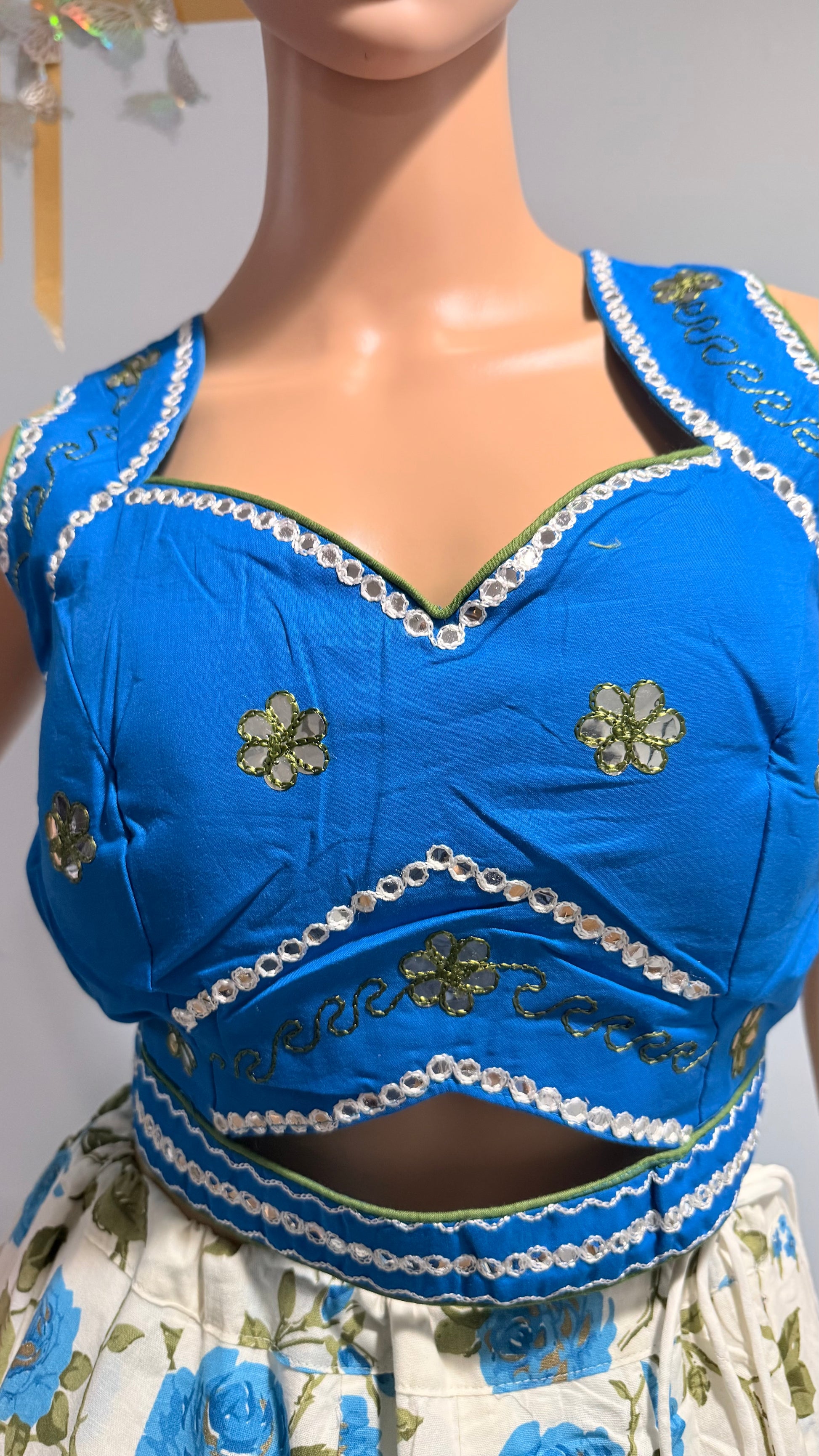 White & Blue Floral Camric Cotton Chaniya Choli & Olive Green Dupatta