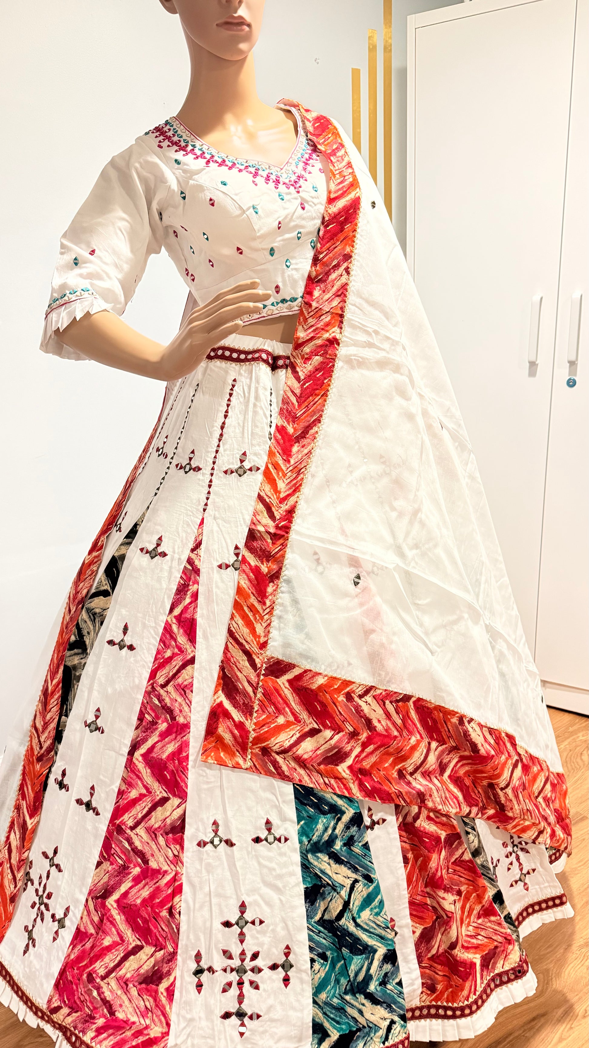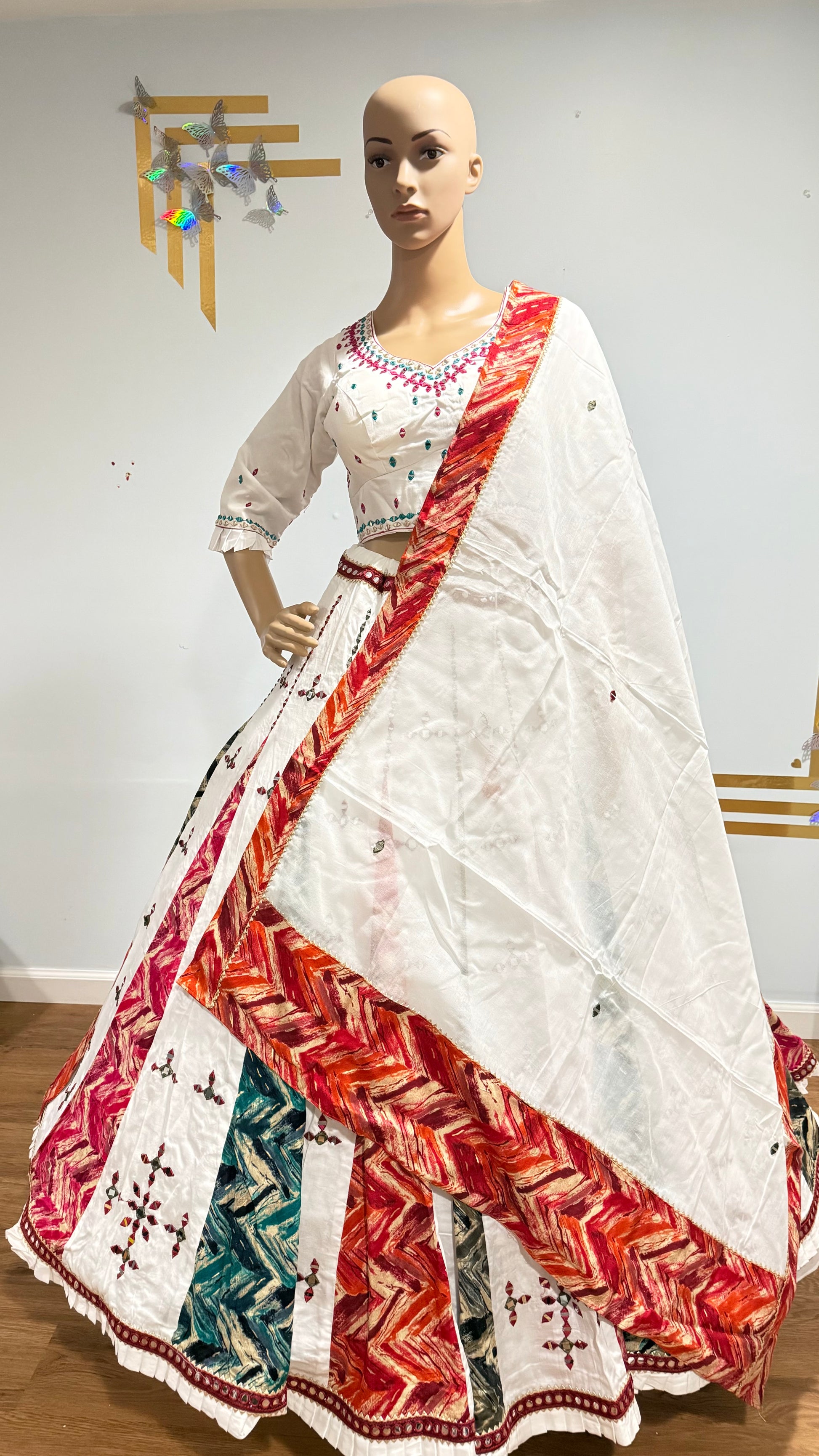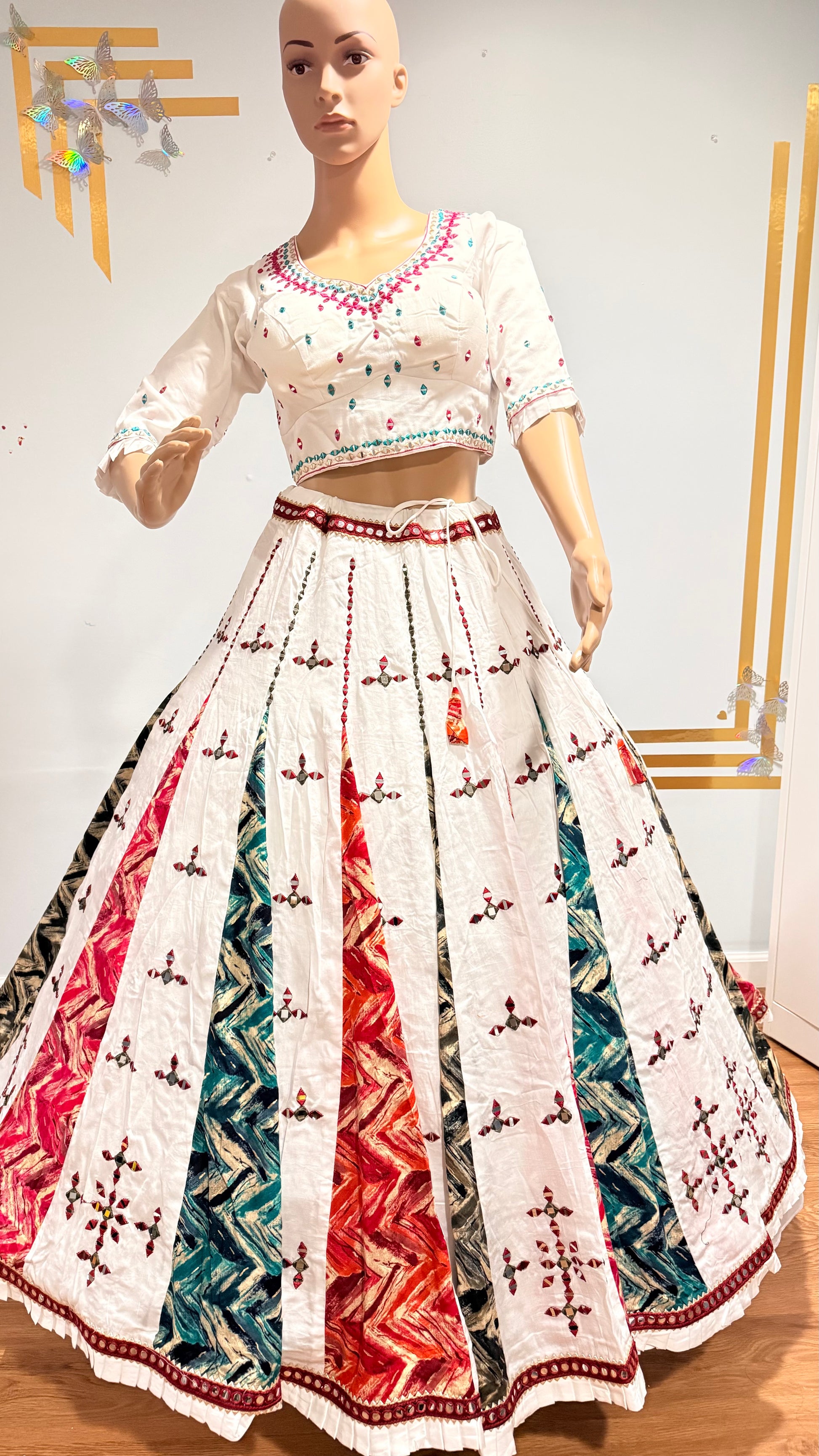 Step into elegance with this stunning Lehenga Choli Set featuring intricate original mirror work (shisha embroidery) on a crisp white base with multicolor printed panels.