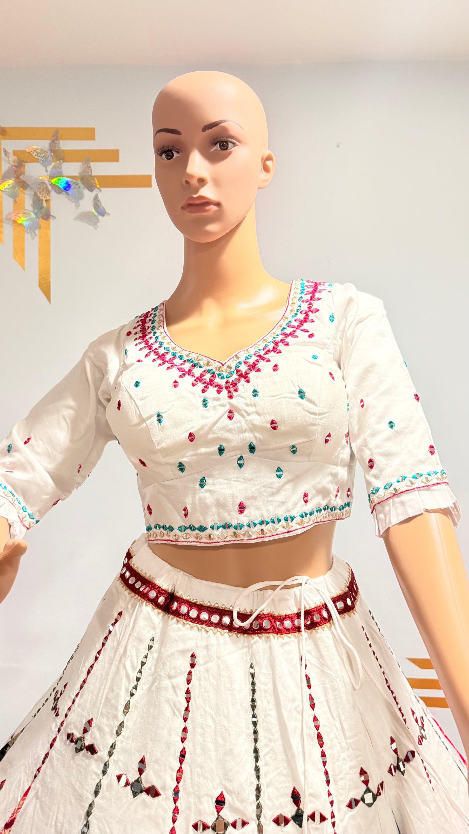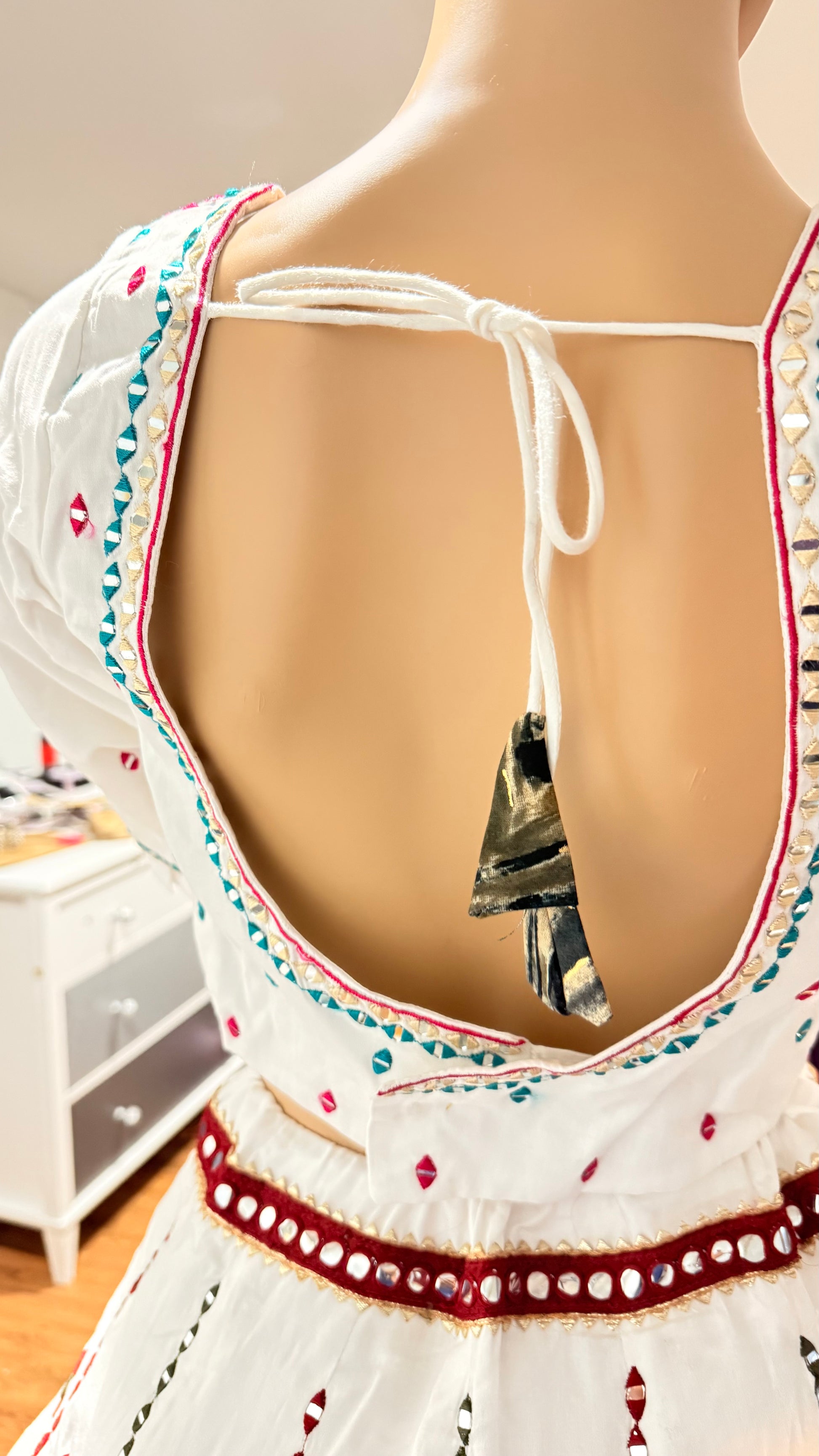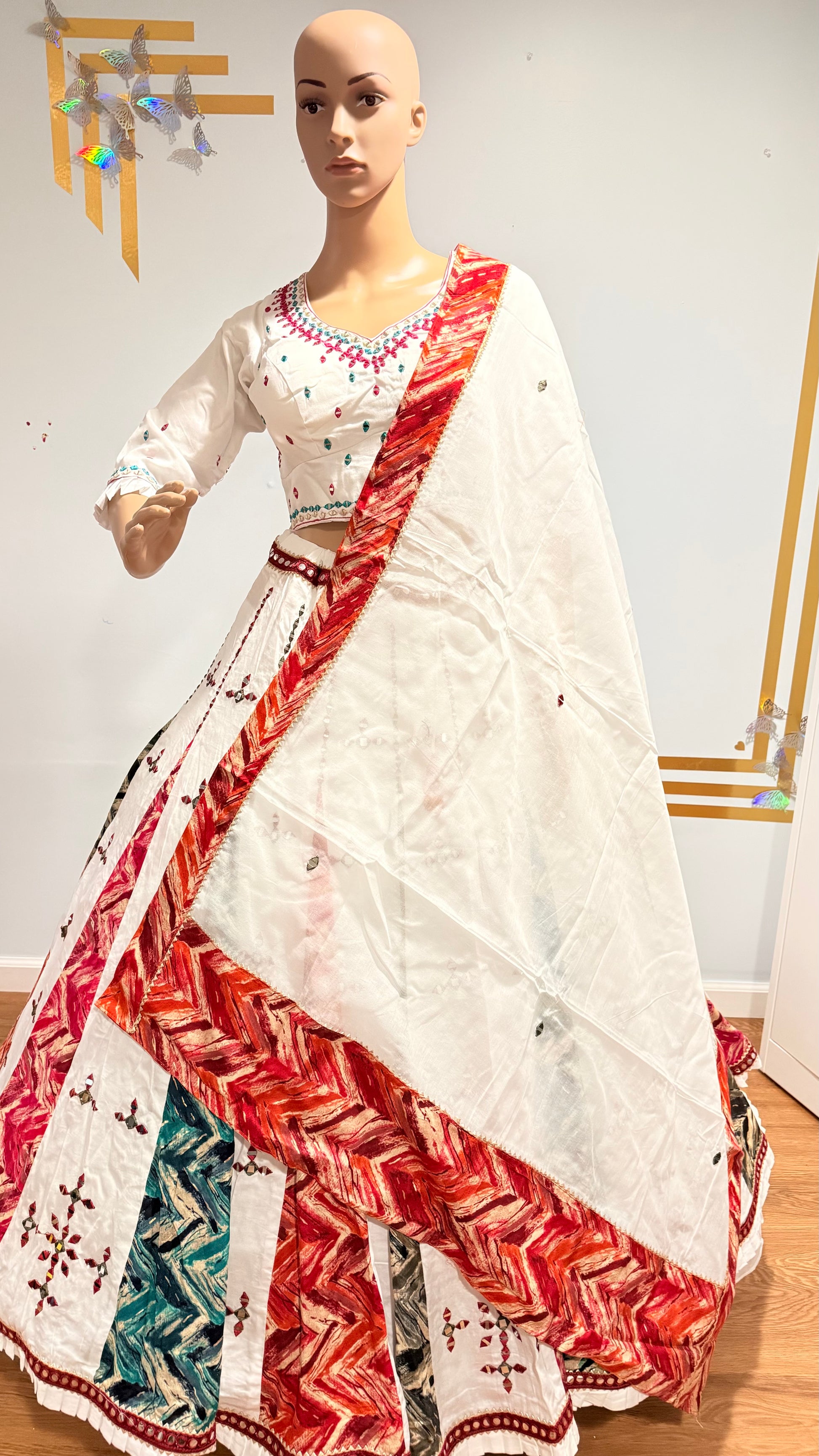 Step into elegance with this stunning Lehenga Choli Set featuring intricate original mirror work (shisha embroidery) on a crisp white base with multicolor printed panels.