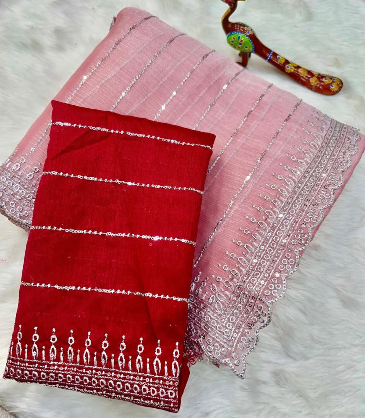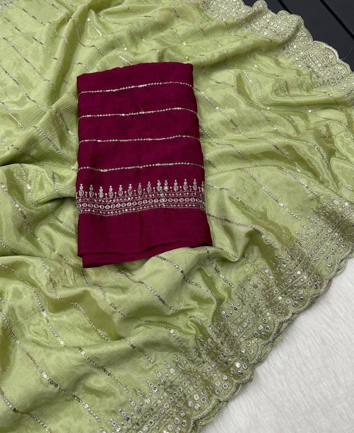 It comes paired with a rich contrast blouse in deep wine tone, featuring matching sequin detailing to elevate the look. Lightweight and easy to drape, this ensemble is your go-to for an effortlessly stylish statement.