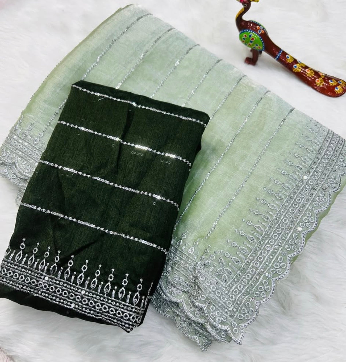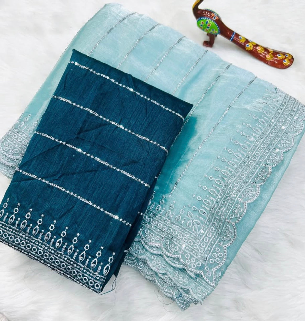 - Blouse: Unstitched contrast blouse with matching sequin detailing
