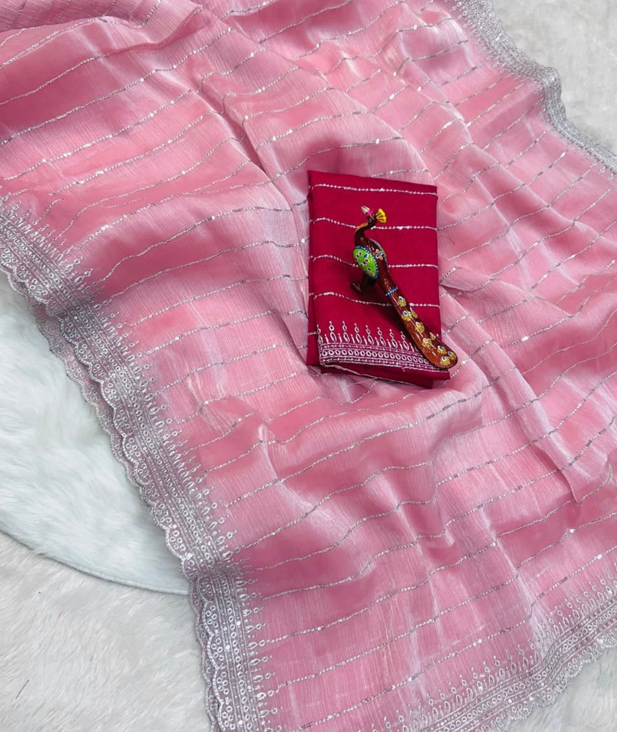 Turn heads in this stunning Zimmy Choo inspired saree — a dreamy lilac drape crafted from soft shimmer fabric adorned with elegant vertical sequin lines and intricate scalloped border work. Perfect for weddings, festive occasions, or evening parties, this saree blends traditional elegance with modern glam.